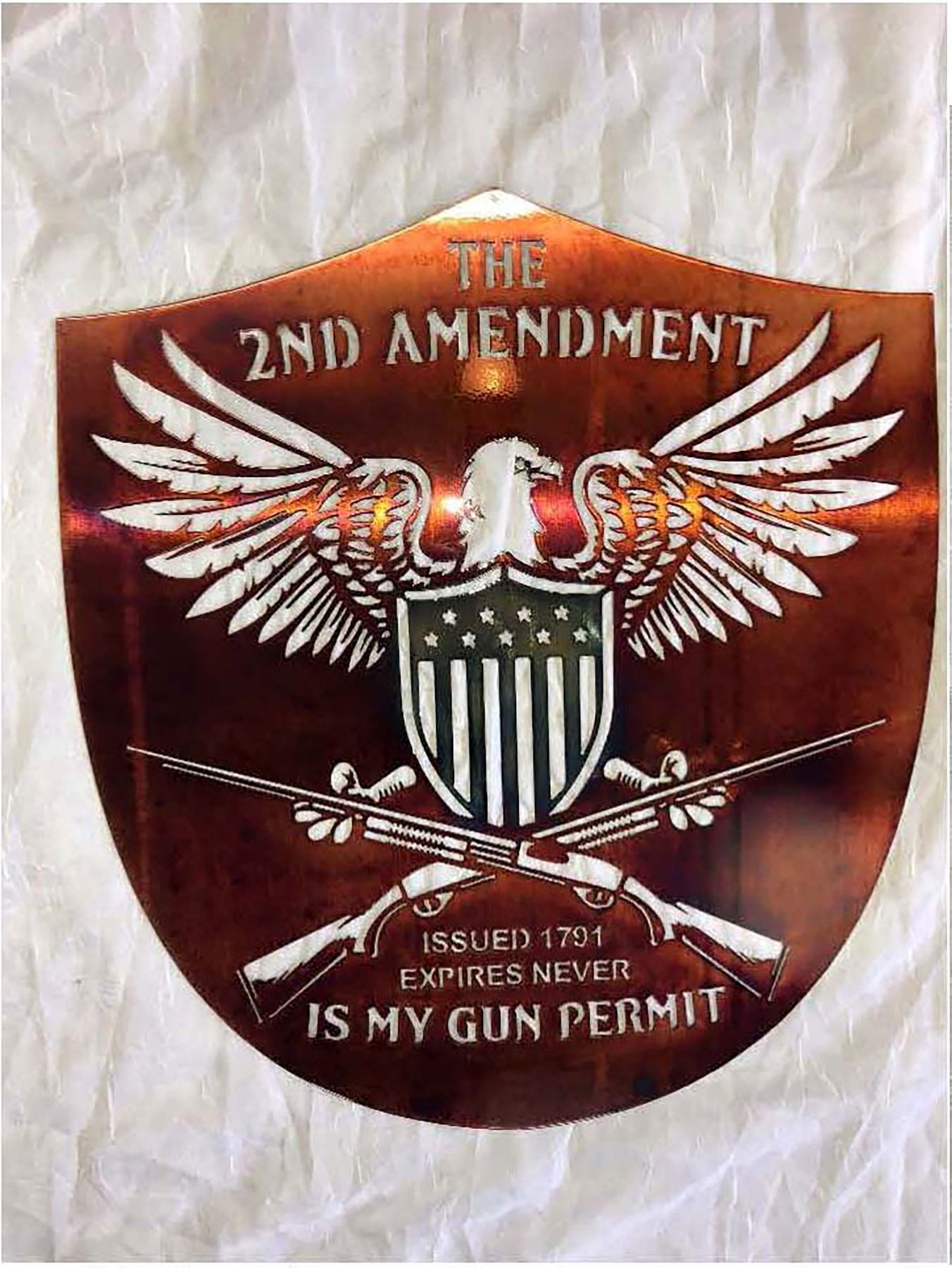 Description: "2nd Amendment" Metal Art by Scott Newton. (100% Fully Donated) For inside or outside wall hanging, powder coated, 22"X35"