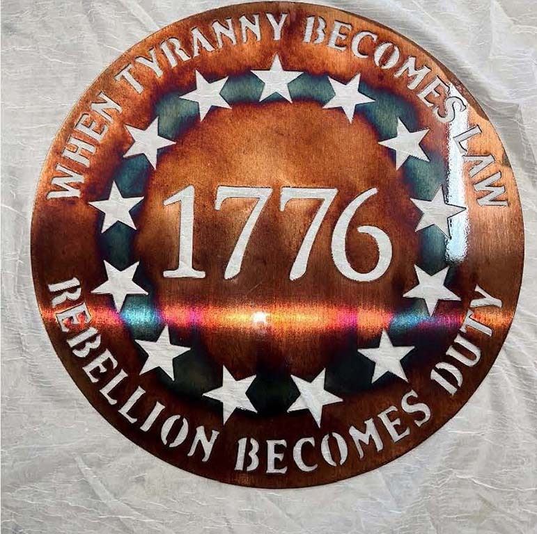 Description: "1776 Circle" Metal Art by Scott Newton, (100% Fully Donated) For inside or outside wall hanging, powder coated. 22"X35"