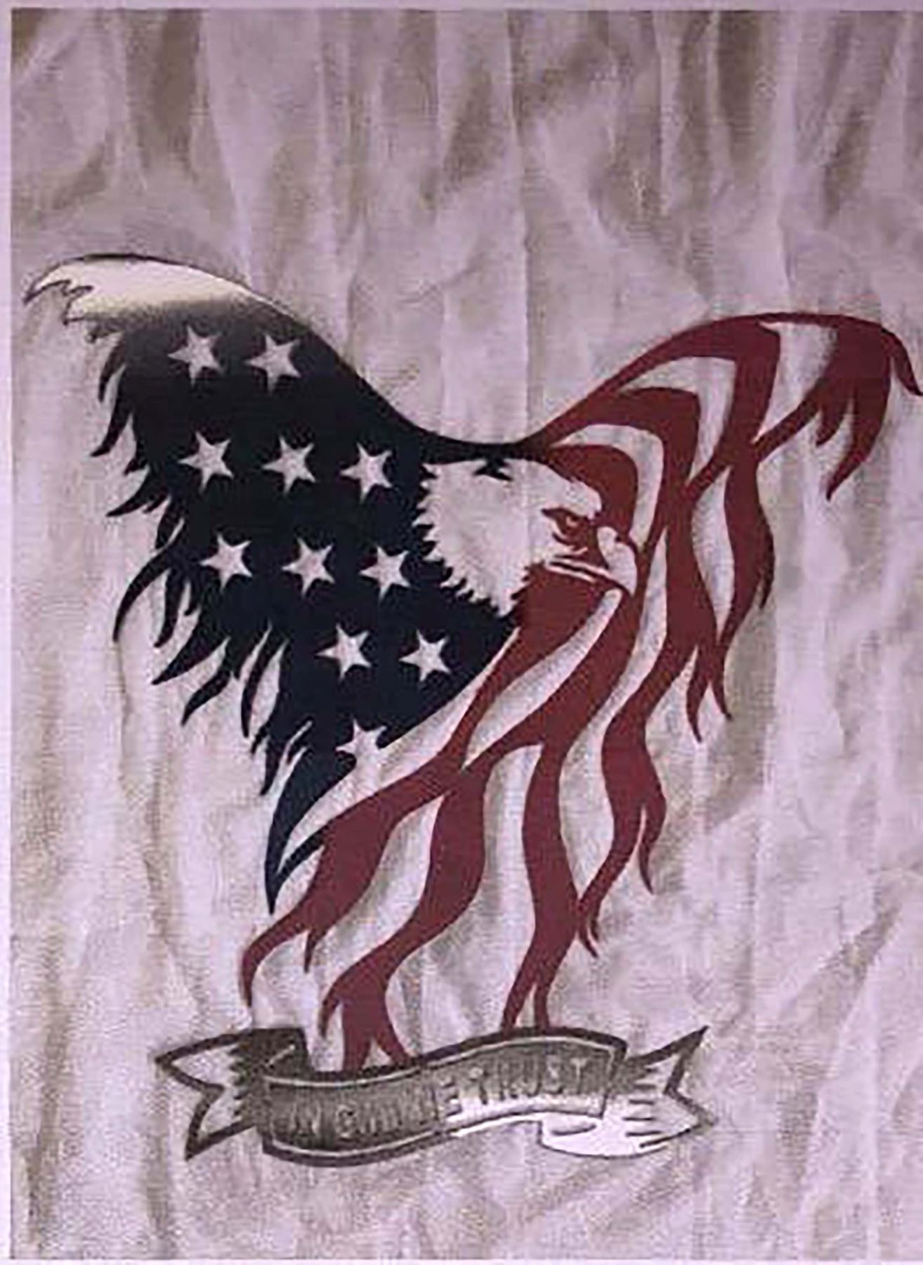 Description: "RWB Golden Eagle" Metal Art by Scott Newton, (100% Fully Donated) For inside or outside wall hanging, powder coated. 22"X35"