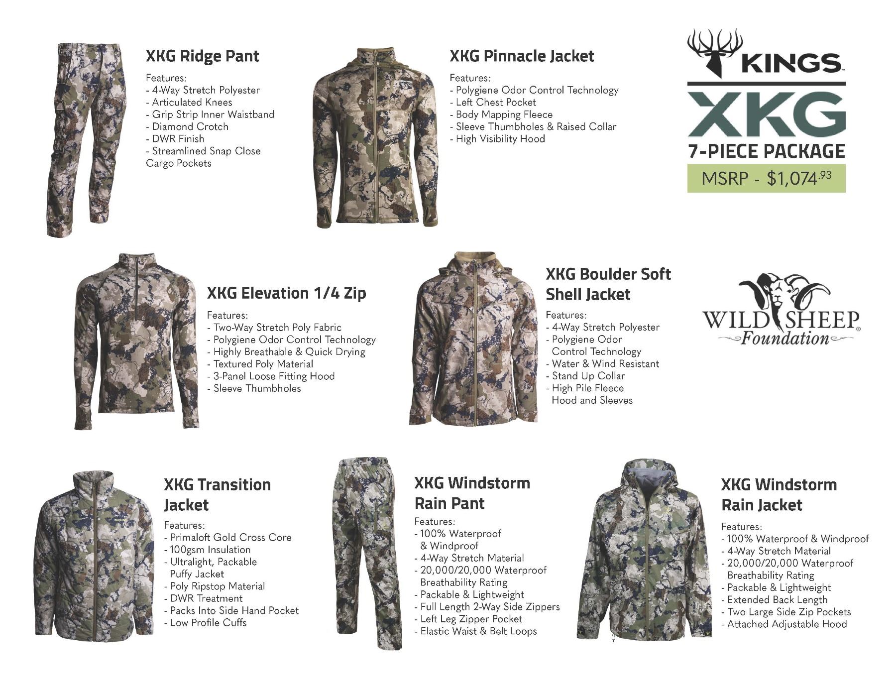 Description: EXCHANGEABLE FOR SIZE! Kings 7 Piece Package. XGK Ridge Pant, XKG Pinnacle Jacket, XKG Elevation 1/4 Zip, XKG Boulder Soft Shell Jacket, XKG Transition Jacket, XKG Windstorm Rain Pant And XKG Windstorm Rain Jacket. Receive a Certificate for your choice of sizes, camo patterns and colors!. You may exchange sizes by contacting Kings customer service at 888-889-8972”