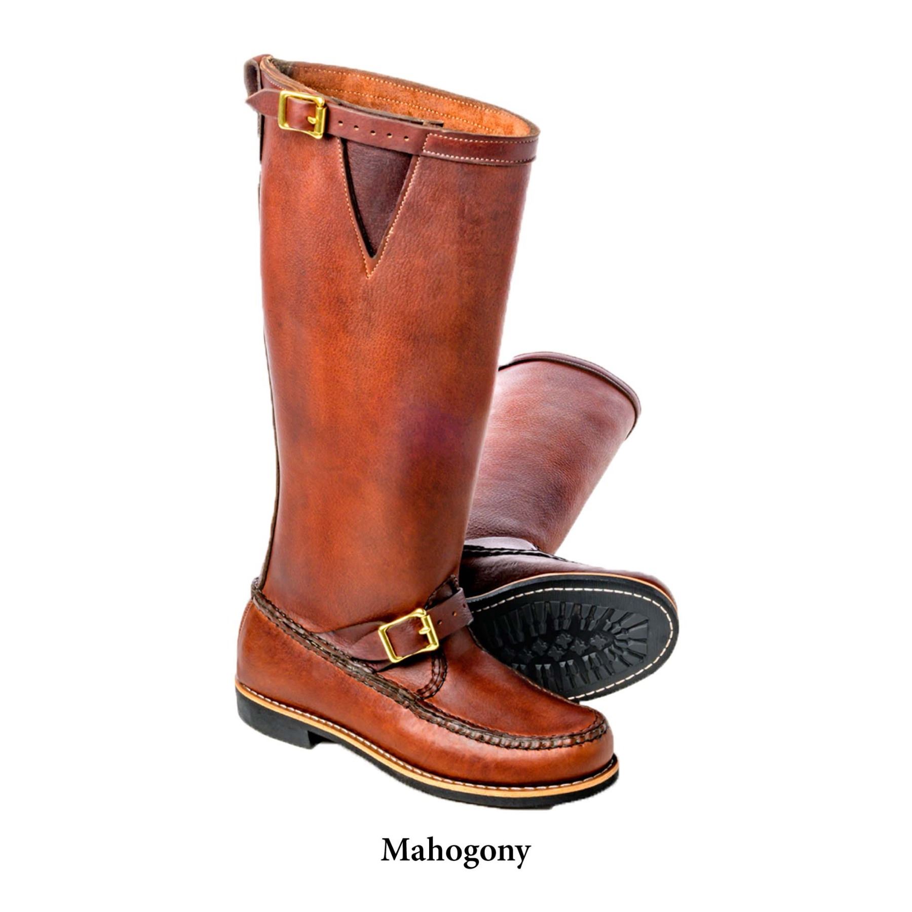 Description: There is only one “Botte Sauvage”, the original Gokey hunting boot worn by professional hunters, guides, woodsmen and four United States Presidents all over the world for more than 100 years. Impenetrable 8-9 oz. oil tanned bull hide, hand sewn moccasin construction with over 500 stitches locked by hand. Gokey guarantees that this boot will outlast any that you have ever owned. High 17” uppers shield your legs from briars, snakes and thorns while ankle and top straps adjust for ideal support. Fully lined bottoms and flexible hand sewn leather welts add an extra measure of comfort. Available in Walnut and Mahogany. (Boot leather may have some slight color variations from the image)