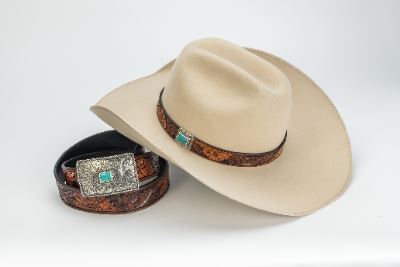 Rand’s Custom Hatters and Silver King Silversmiths proudly present this Hand Tooled Hat and Leather Belt from The Sterling Silver with Turquoise Collection.