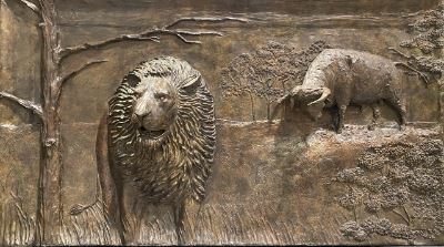 This impressive artwork, measuring 32in. x 56in. x 8in and weighing 160lbs, is presented in bronze high relief, intricately portraying an African lion amidst the vastness of the Bushveld, while a Cape buffalo, wearied yet vigilant, watches its archenemy from a distance.