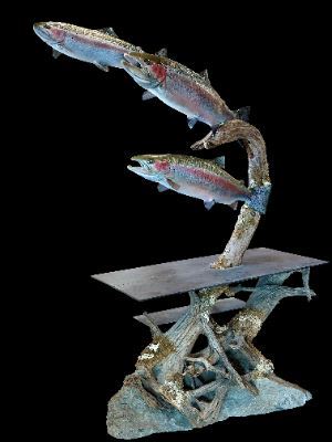 Lot 30FD Liquor Table Featuring Three Stunning Steelhead Replicas