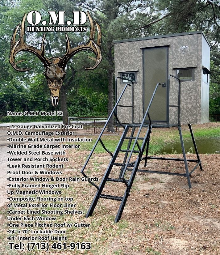 The O.M.D. Model 32 features a 22-gauge galvanized pre-coat O.M.D. camouflage exterior, double wall metal construction with insulation, marine grade carpet interior, welded steel base with tower and porch sockets, leak resistant rodent proof door & windows, exterior window & door rain guards, fully framed hinged flip up magnetic windows, composite flooring on top of metal exterior floor liner, carpet lined shooting shelves under each window, one piece pitched roof with gutter, 24"x70" lockable door and an 81" roof height.