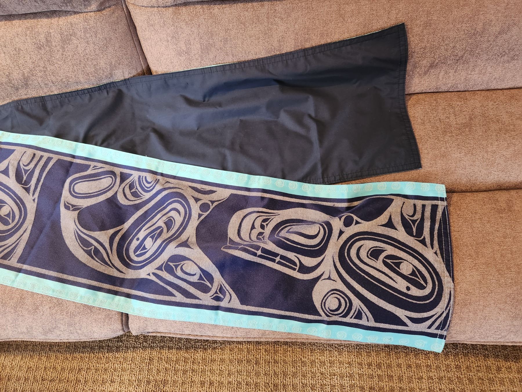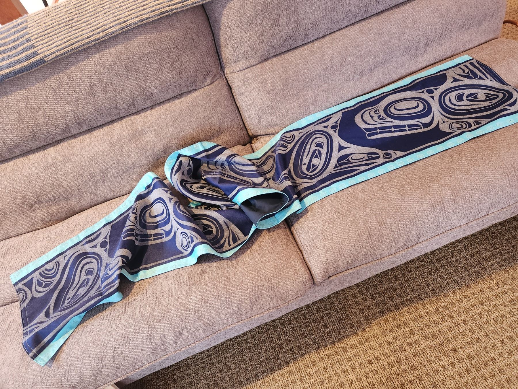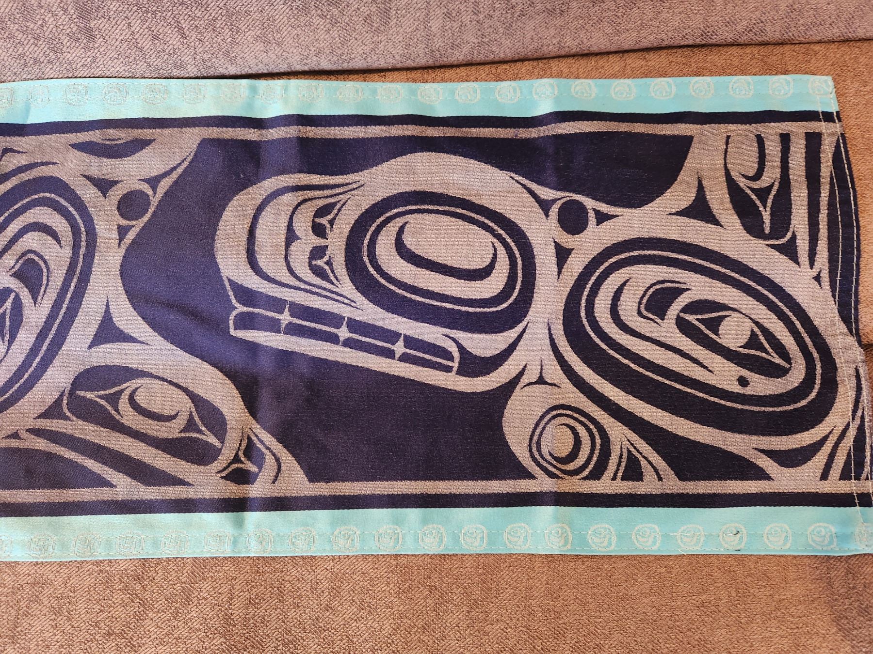 This runner can be used as a table runner, a bed runner, a ceremonial sash, or wall decor. Whale by Haida artist, Ernest Swanson measures 13 in x 96 in; 40% cotton, 60% polyester jacquard woven design