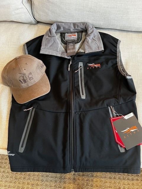 Brown APHA Ball cap and Men's size Large, Black Sitka Gear Jetstream vest.