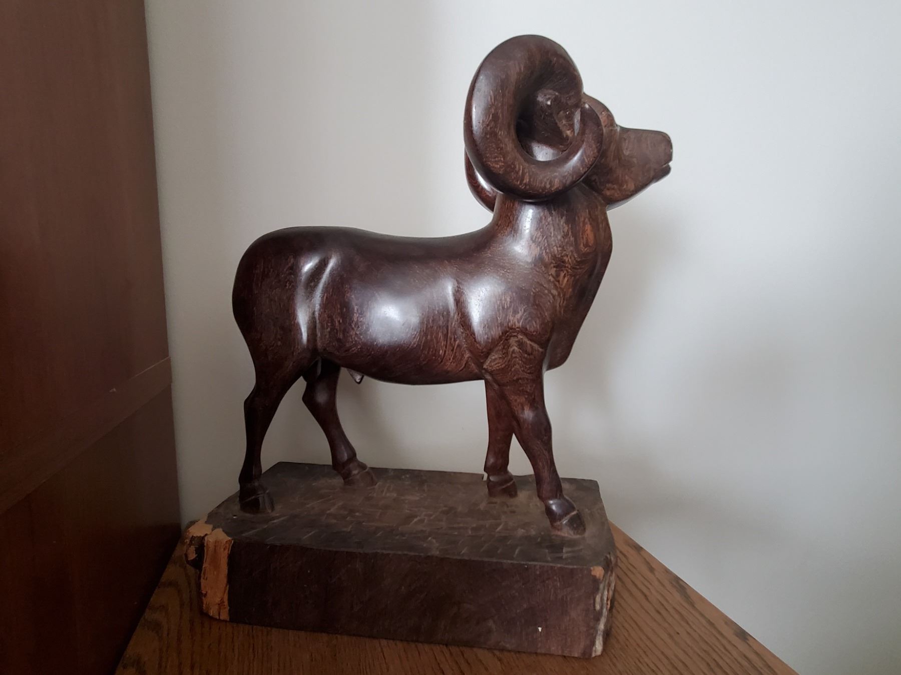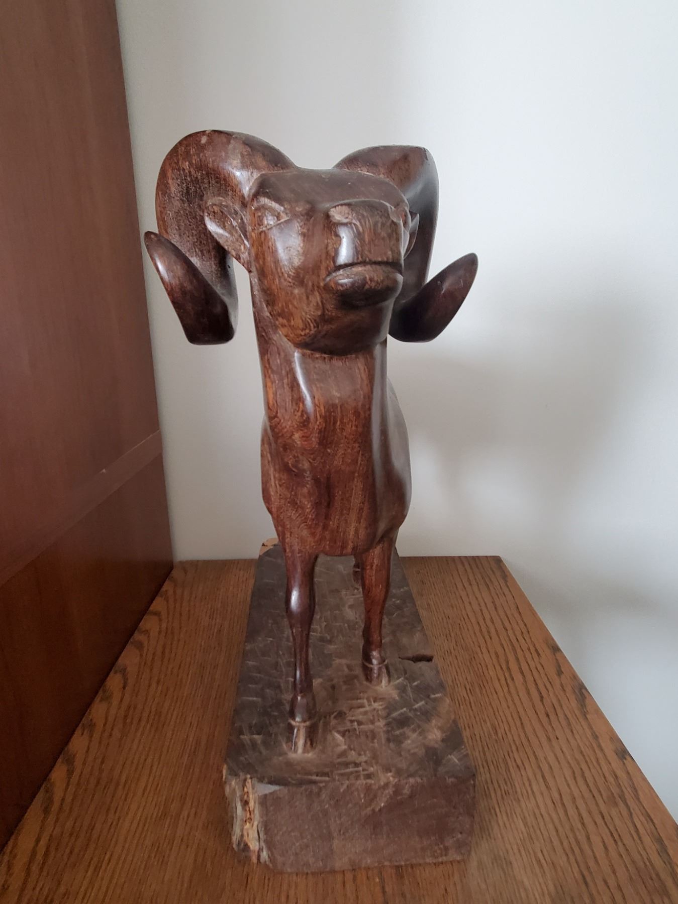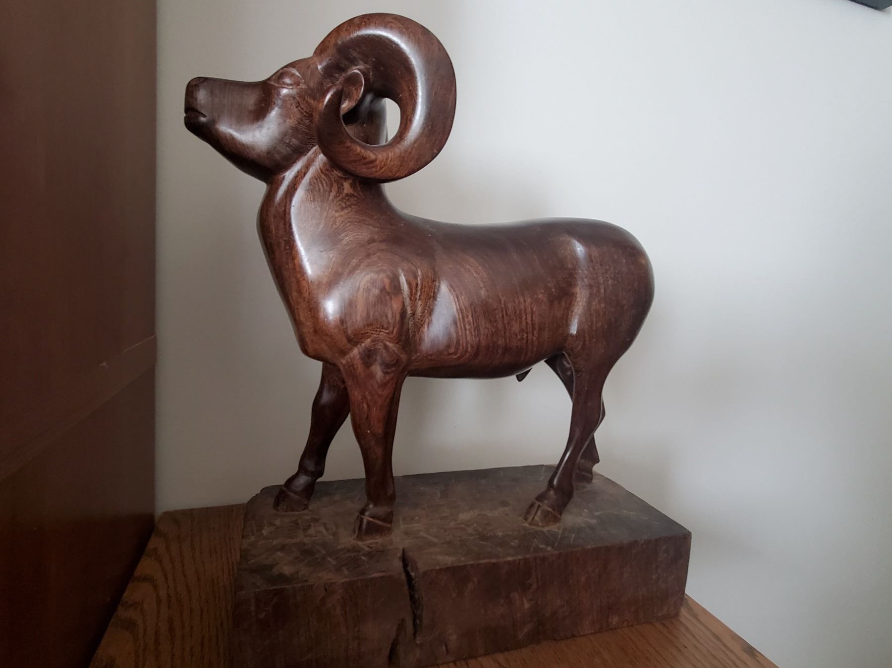 Description: A vintage Seri Indian Hand Carved Ironwood Sheep from the 1970s. Bill and Ingrid Moynihan purchased this item directly from the carver in the Seri Indian village in Sonora Mexico. Base is 12" long and the Carving is 15" high. Weight is 12 pounds.