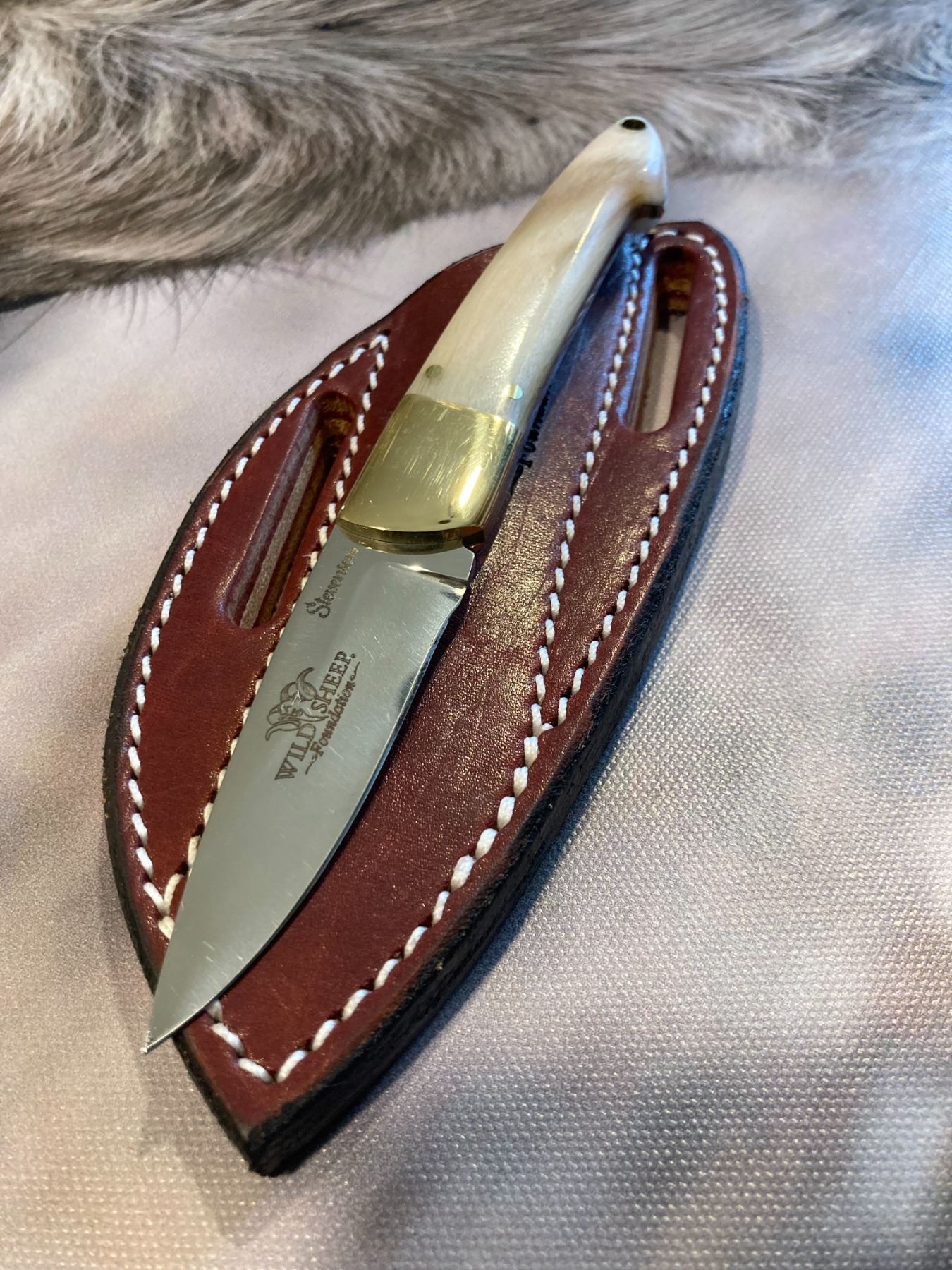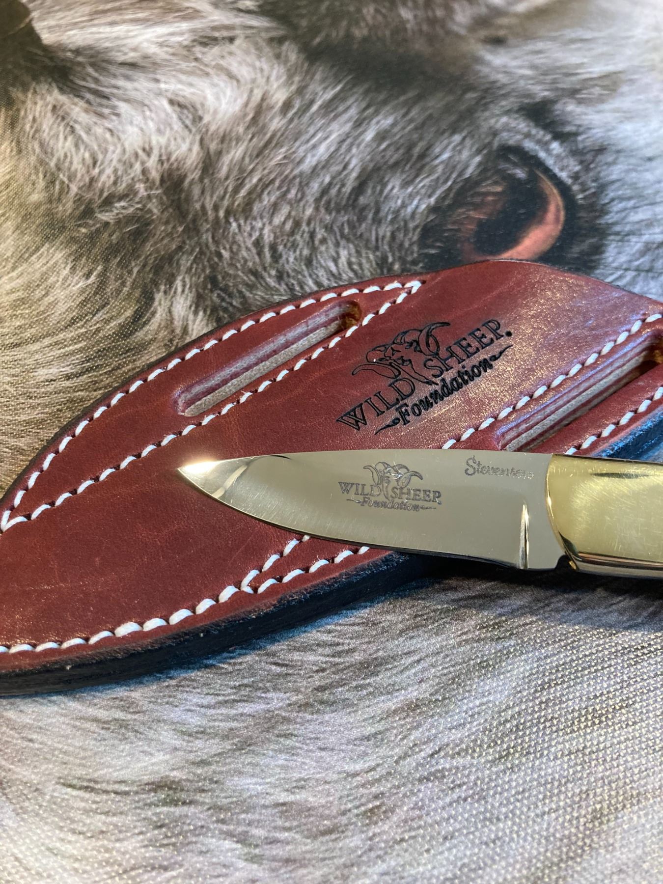 Description: (100% Fully Donated This is a custom RWL 34 blade with brass bolsters and sheep pins. The handle is made of sheep horn with WSF logo and comes with a custom WSL logo ‘ed sheath. Don Stevenson is donating this knife especially for the annual WSF Thinhorn Summit meeting. Don's been building custom knives for nearly 25 years and donating to conservation programs for 22 years.. Don't miss the opportunity to own a Don Stevenson knife…take it to The Summit!