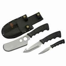 FEATURES: 3 PIECE SET CAPING KNIFE (6.25") GUTHOOK KNIFE (9") CLEAVER (10.5") BLACK RUBBER HANDLE WITH RITE EDGE LOGO BLACK NYLON SHEATH WITH BELT LOOP