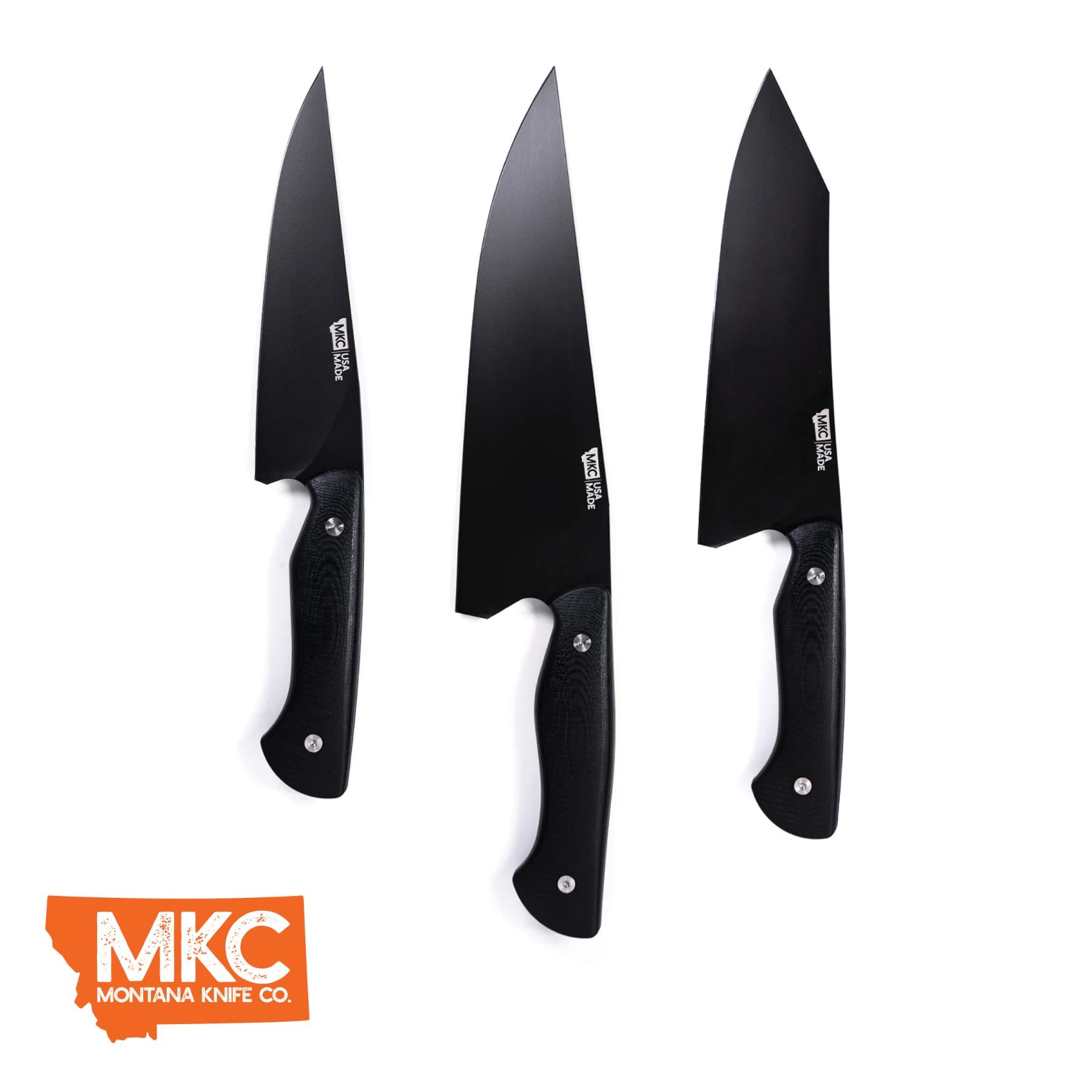 DONATION: The MKC Culinary Collection features all three knives from the collaboration between MKC Founder & Master Bladesmith, Josh Smith and renowned knife maker Mareko Maumasi — with his extensive knowledge as a bladesmith and experience in the restaurant industry. The knives are made with Magnacut Stainless Steel and finished with a black Cerakote® coating for optimal durability. The handles are constructed of G-10 and contoured for a comfortable grip. The MKC Culinary Collection is the perfect set of tools for any chef looking to up their game. Whether you’re a beginner or a seasoned pro, this collection has everything you need to tackle even the biggest jobs from the kitchen to the campsite.