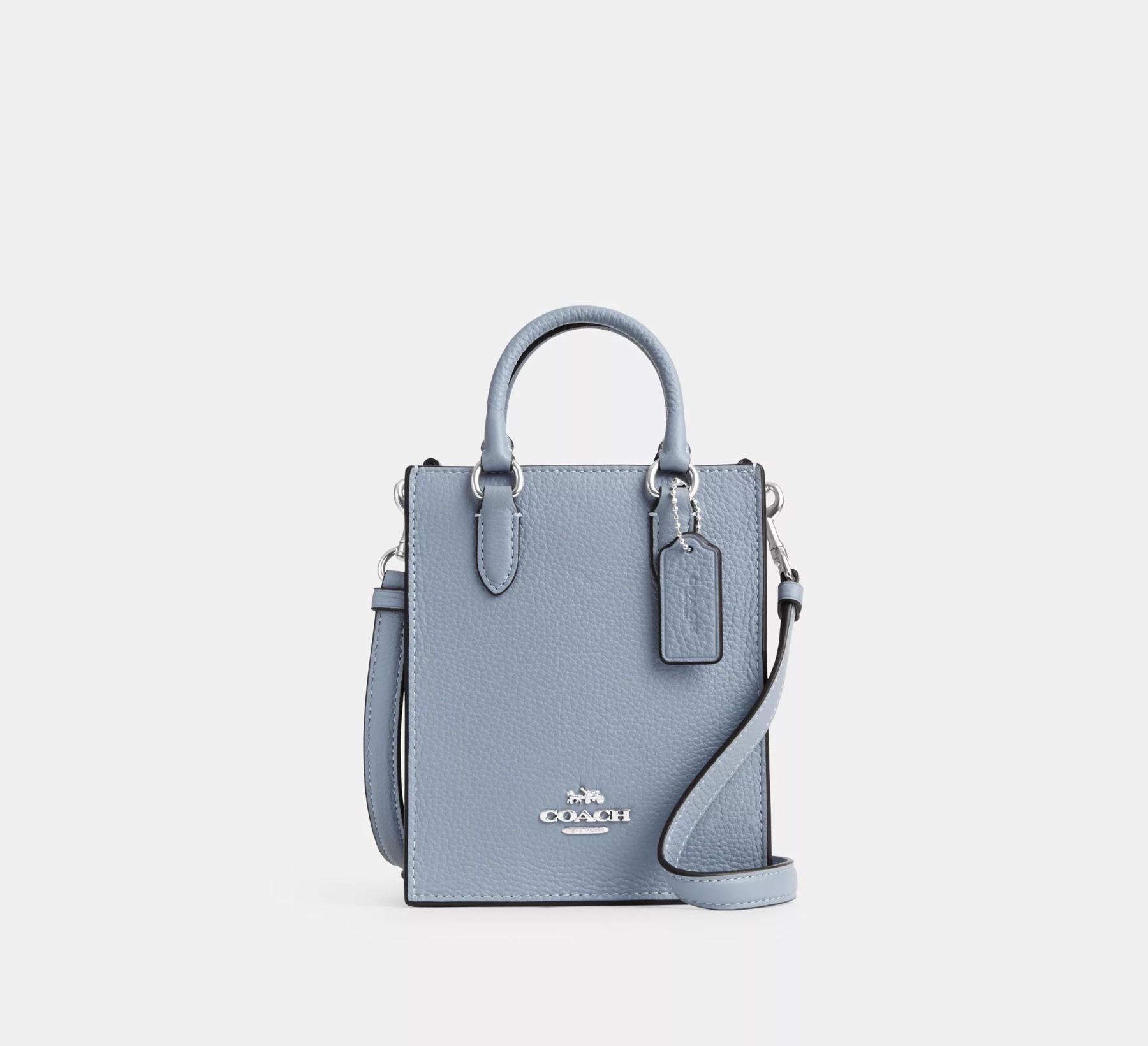 Description: The Coach Silver/Grey Mist North South Mini Tote features refined pebble leather, Two credit card slots, Magnetic snap closure, fabric lining, Handles with 2 1/4" drop, Detachable strap with 23 1/4" drop for shoulder or crossbody wear, 5 1/2" (L) x 6 3/4" (H) x 2" (W), Style No. CJ500.