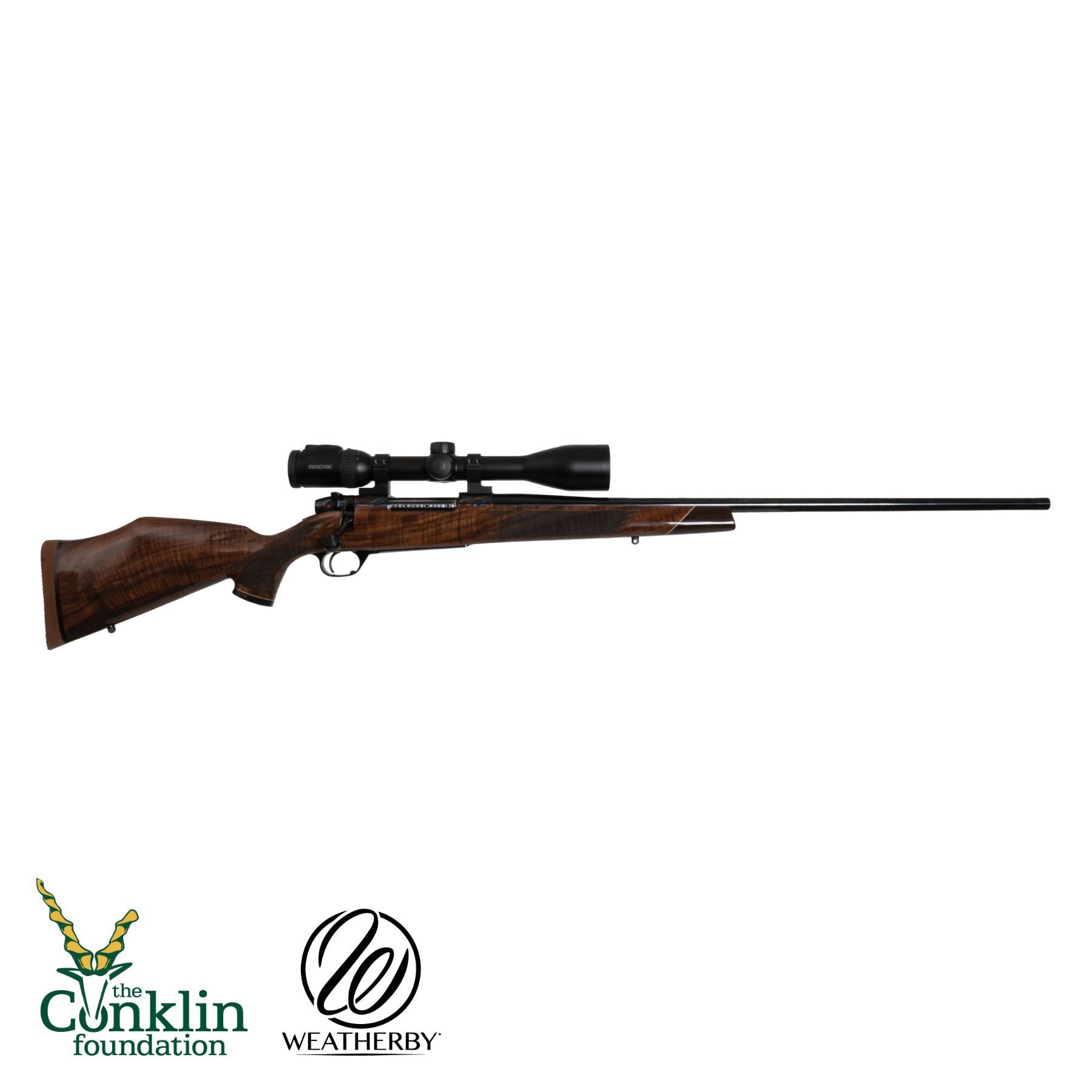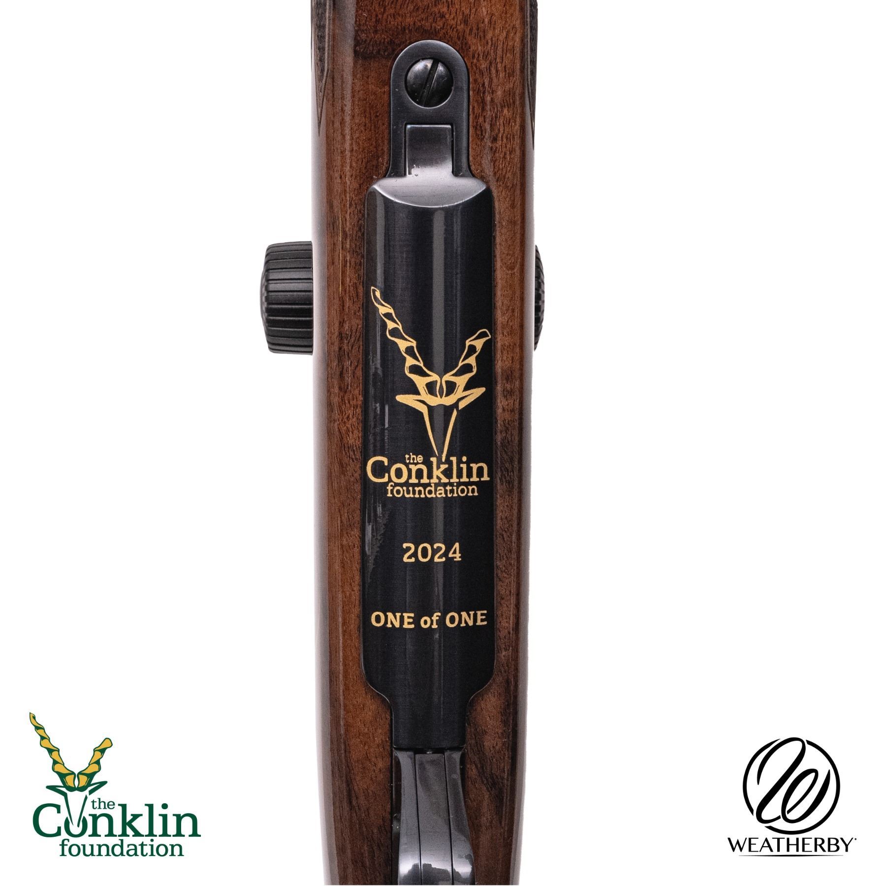 DONATION: This beautiful Weatherby Mark V Deluxe 6.5 RPM rifle was custom built for The Conklin Foundation made especially for the 2024 Sheep Show Auction. This rifle is hand selected deluxe stock - exhibition grade walnut, color case hardened receiver, hand checkered bolt knob, and hand jeweled bolt. On the floorplate is the custom engraved Conklin Foundation log and year “One of One”. This rifle is topped off with a Swarovski Z8 3.5-25 rifle scope. Don’t miss out on the opportunity to have this one-of-a-king rifle in your collection.