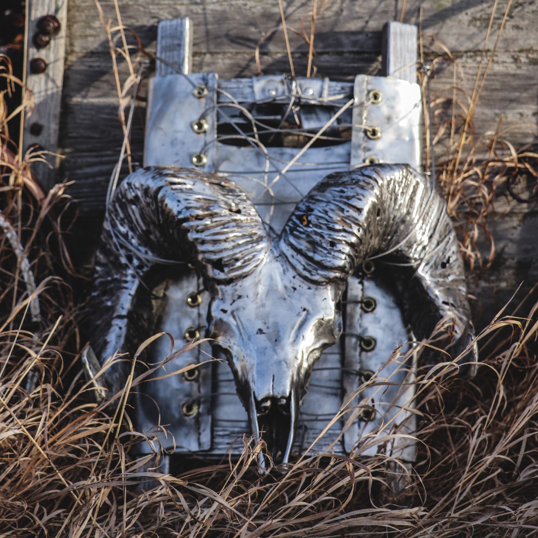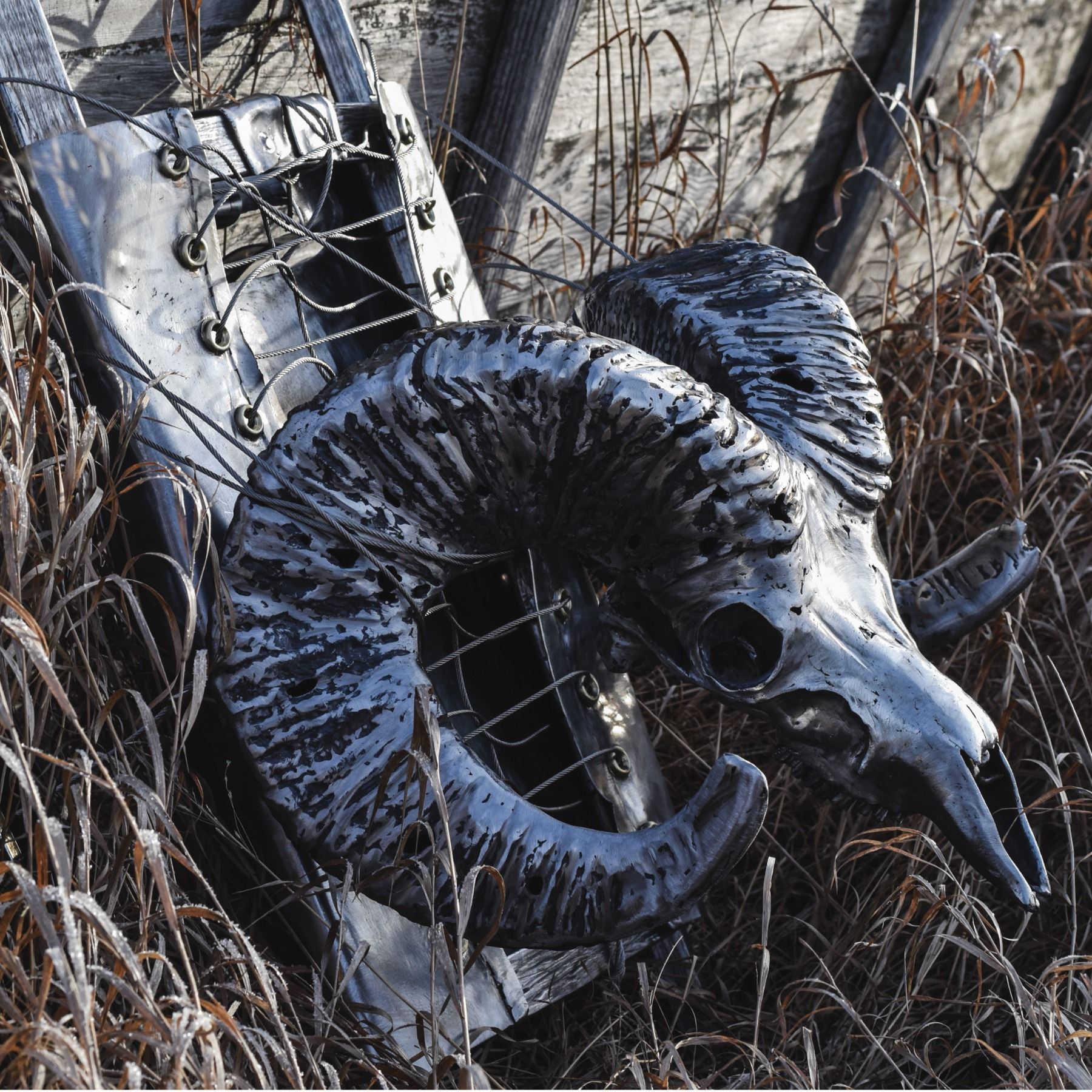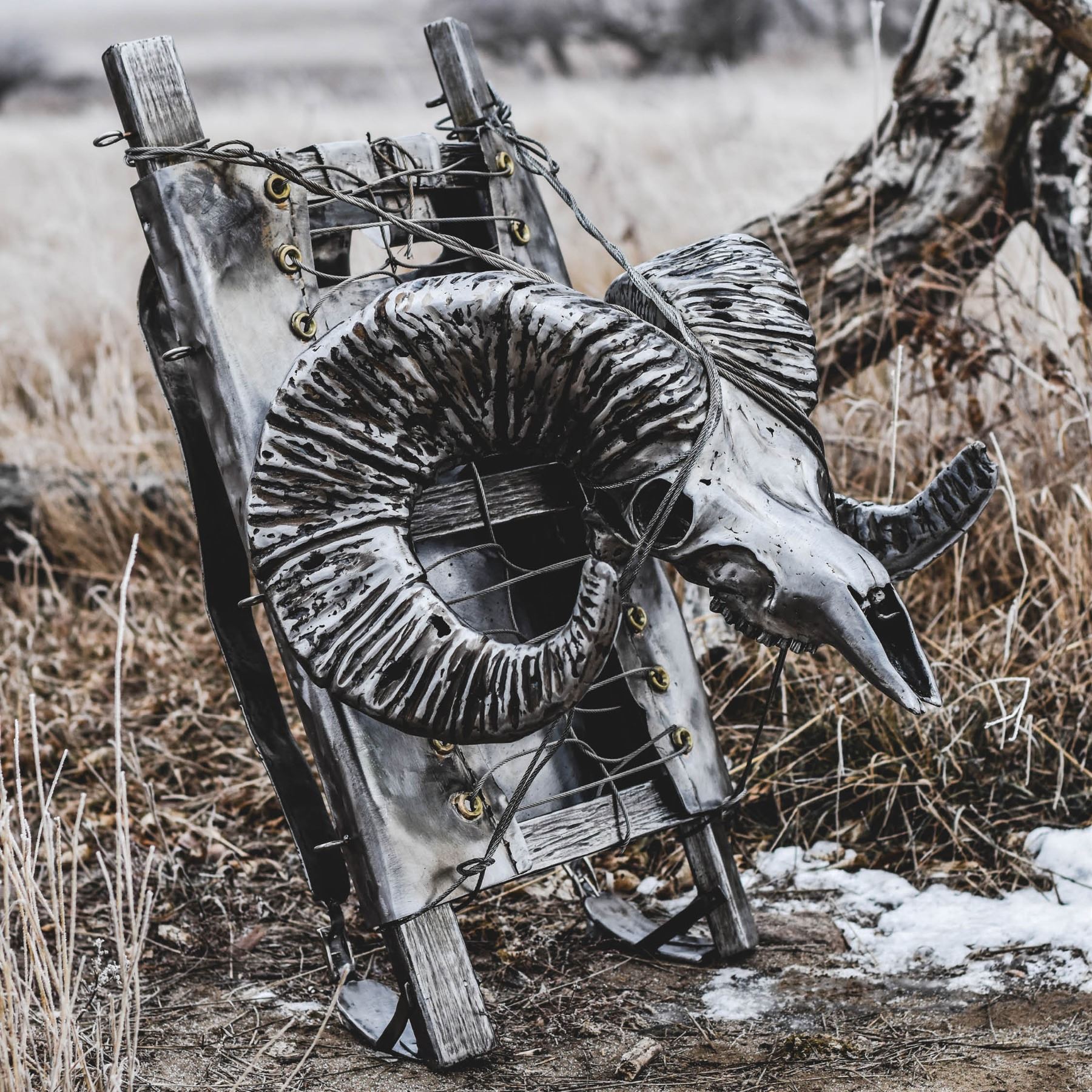 DONATION: “Going home heavy” depicts a step back in time of a view known and loved by all sheep hunters. An original wooden pack adorned with a ram skull artistically welded out of pure metal. The life-sized sculpture poetically captures the weight one carries when “going home heavy” feels like you are carrying a pack full of iron.
