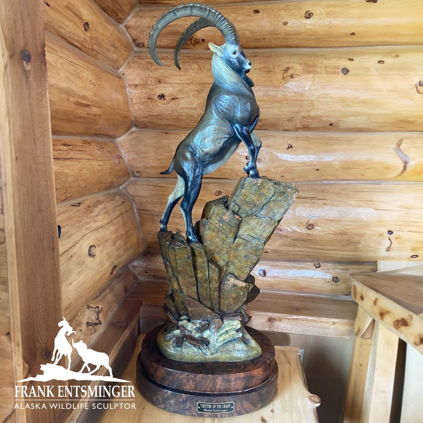 DONATION: Frank & his wife Sue have made several trips to Mongolia hunting Argali sheep, ibex, and birds. Second only to the big argali rams, the Siberian ibex has struck Frank’s fancy the most, being particularly impressed by the adult billy’s powerful muscles bulging threw their beautiful multicolored hide and their ability to climb high into the vertical cliffs of the Mongolian mountains! In this sculpture Frank tried to capture these unique features of this gorgeous critter while he scales the crags; hence the title “Critter of the Crags”.