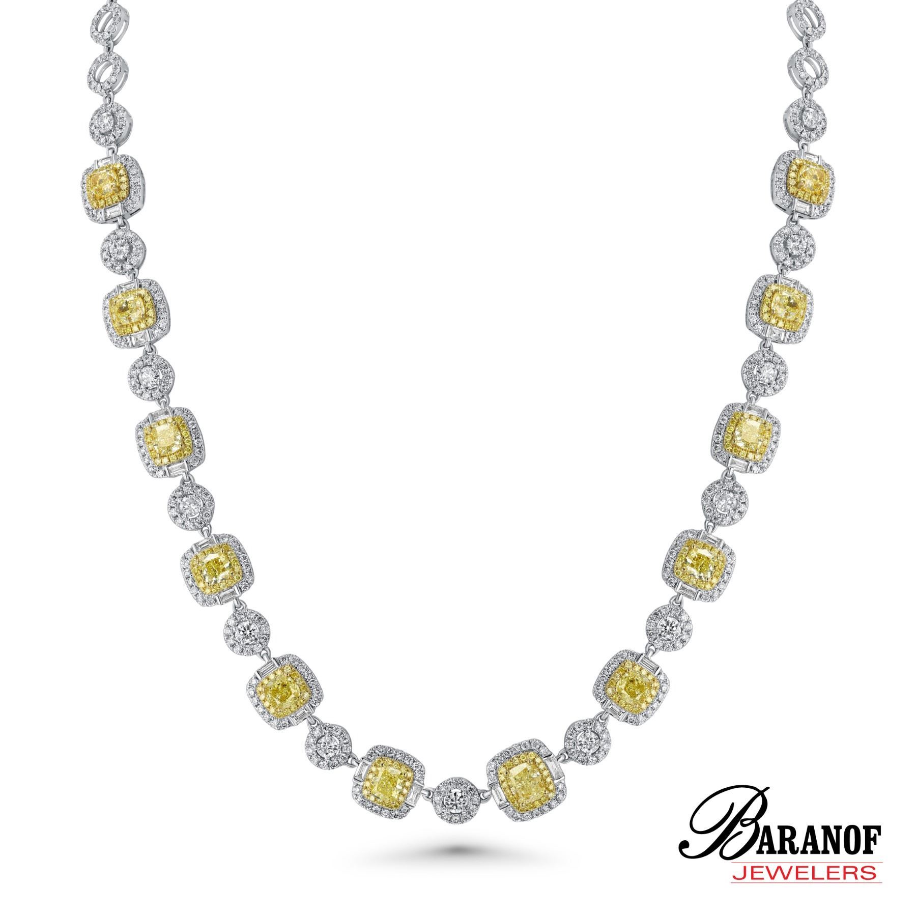 DONATION: Natural fancy yellow diamond necklace is set in 18 karat gold, set with 9.75 carats of natural fancy yellow diamonds VS1 clarity and 7.00 carats of natural white diamonds. Diamonds are F color, VS1clarity.