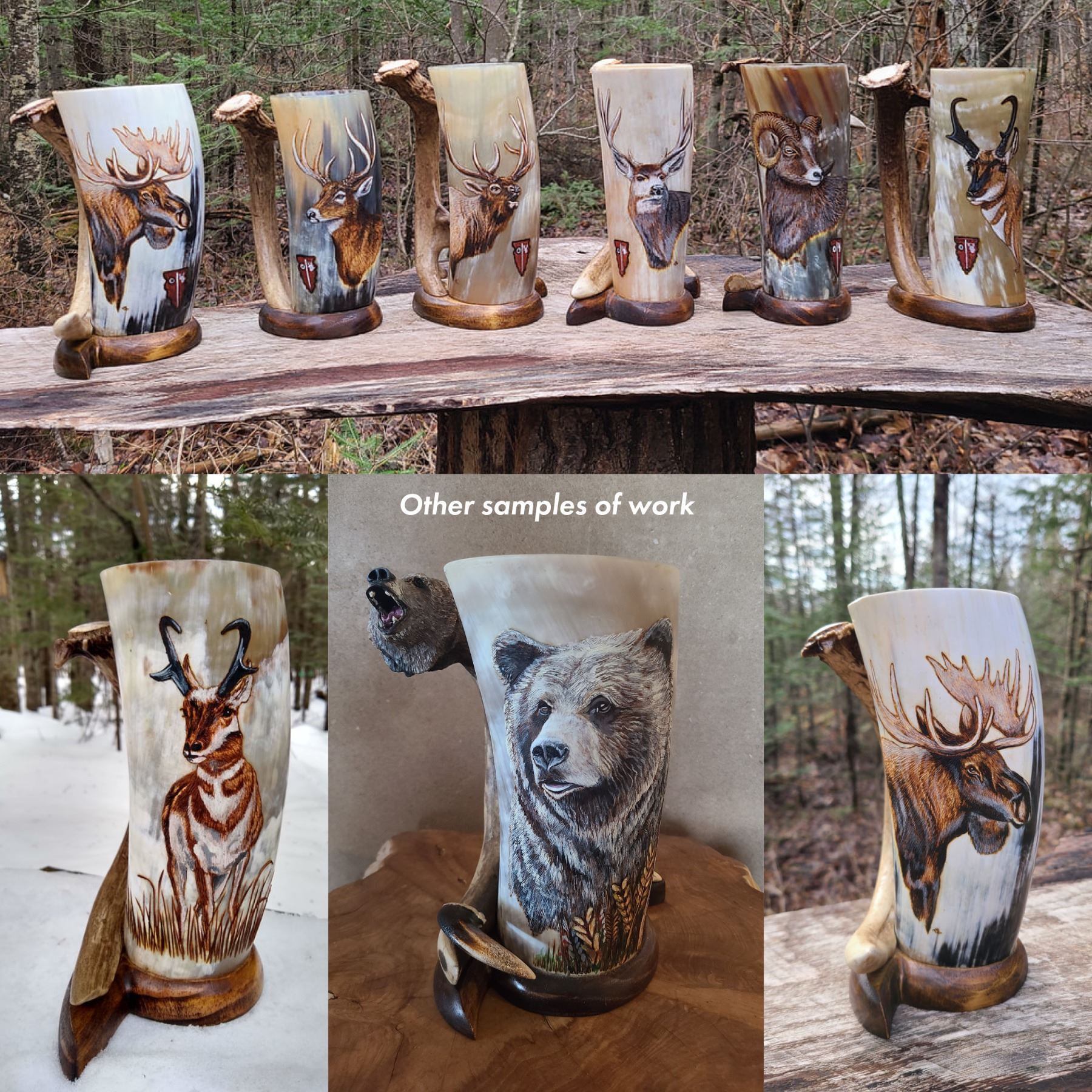 DONATION: Handcrafted custom horn mugs created from Texas longhorn horns, deer antlers, various horn handles, and wood. Artwork/images are free hand burned on the horn blended with acrylic paint. The handles are hand carved. All pieces are sealed for hot or cold beverages. Enjoy fine custom art with your favorite beverage. “Like many young kids, I would pick up a piece of wood, grab my pocketknife and just start carving. As time went on, I just never stopped. In my spare time I was always doing some kind of art, weather carving, sculpting or just building something. I put my heart and high level of energy into everything I do including each piece of artwork I craft and create. It’s a great honor when someone enjoys my work.”