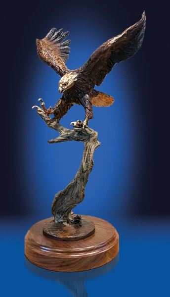 •This awe-inspiring bronze captures the essence of an eagle in the act of