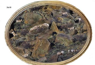 •This is a fully donated framed canvas 24” x 18” oval painting of bighorn sheep in