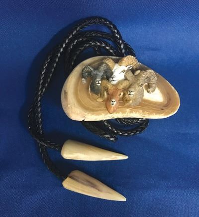 •This is a fully donated sheep horn bolo that features four sheep in resin.