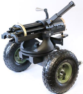 This modern Gatling gun is chambered in 9mm and boasts an impressive array of 8 barrels, compatible with any Glock magazine.