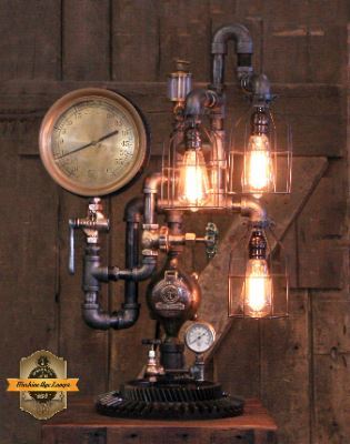 Machine Age Lamps specializes in handcrafting unique steampunk lamps, repurposing salvaged components such as antique steam gauges, agricultural machinery, planes, ships, and other machine-age parts.
