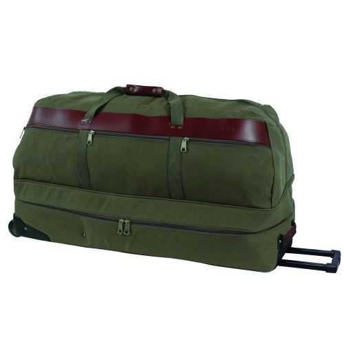 Rugged, water resistant, waxed canvas shell, top grain leather trim accents, roomy main cargo area. Three exterior zippered pockets, collapsible pull handle, heavy duty wheels. Zippered, structured bottom compartment accommodates additional gear or hard sided gun cases 28" x 6 1/2" x15".