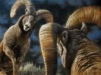 This original oil 24" X 18" on stretched canvas is beautifully framed depicting two Bighorns doing what Bighorns like to do. The picture will tell you everything you need to know (smashing horns).