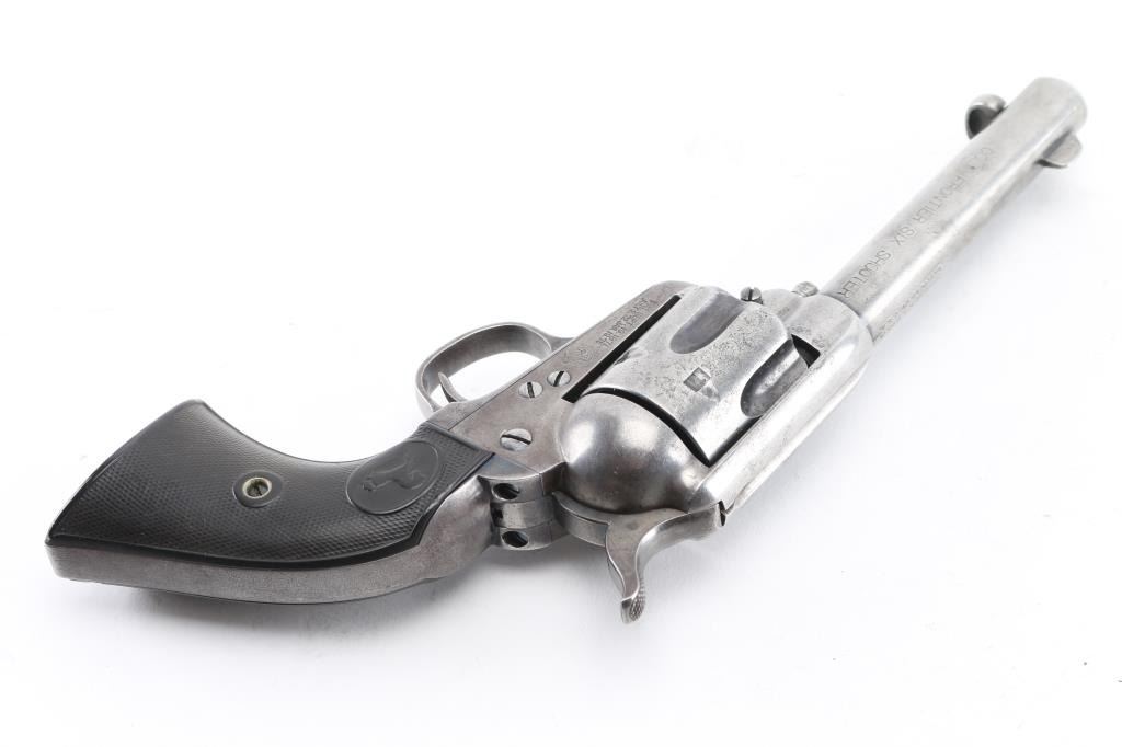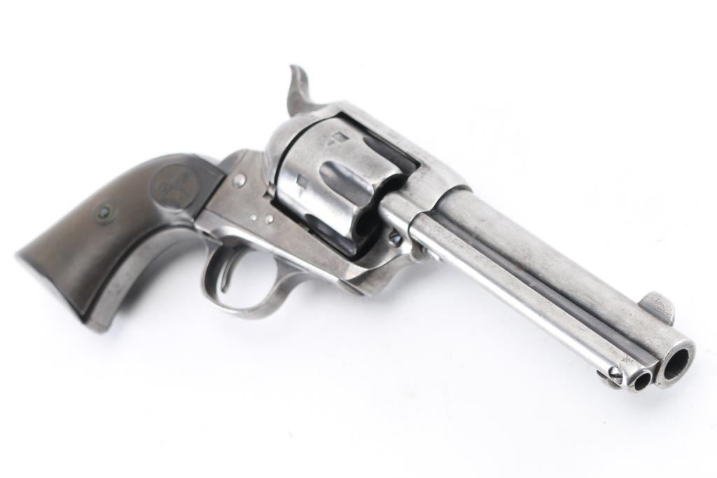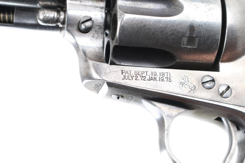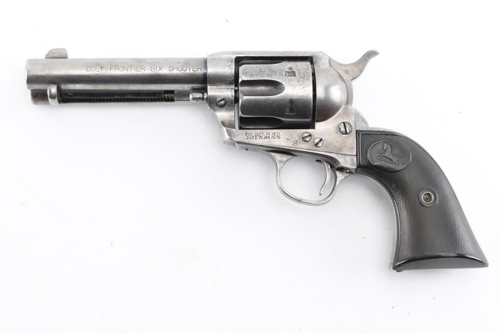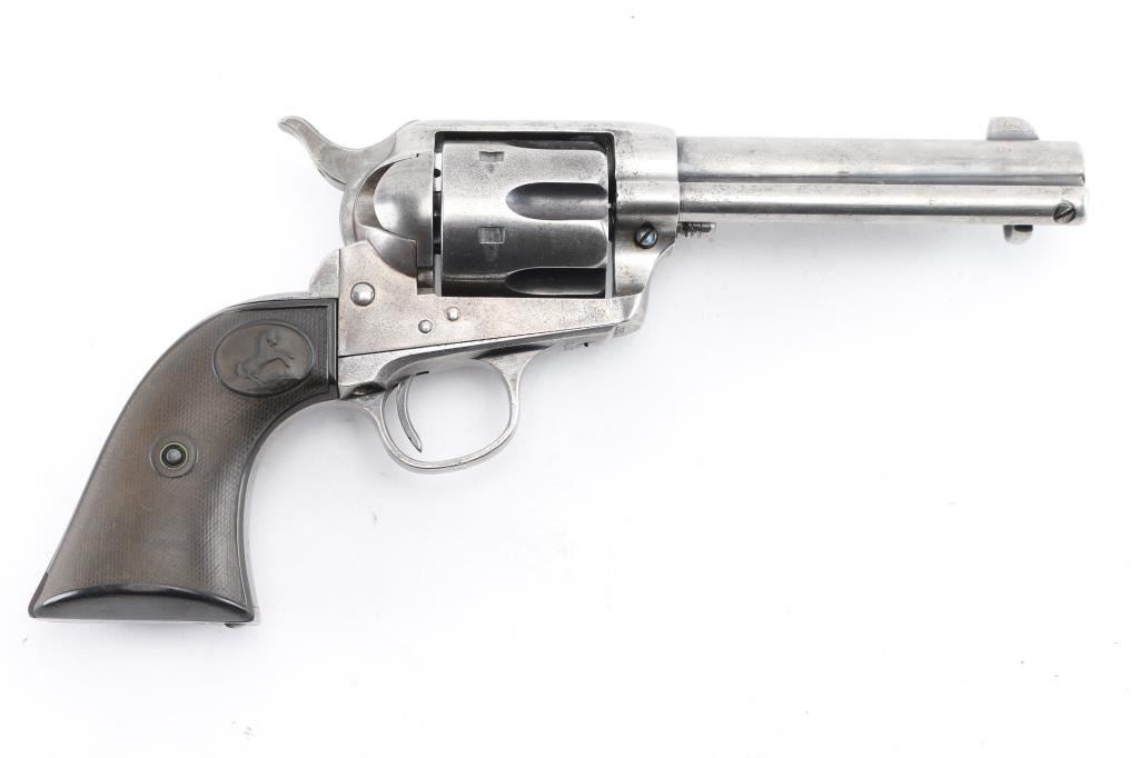 Antique 1st Generation Colt SAA. 4 3/4" barrel. Manufactured 1898. Blue finish, case hardened frame, checkered black hard rubber grips with 'Rampant' Colts. Matching serial numbers on frame, triggerguard, & back Strap. Assembly number "689" on loading gate. Two line Colt address on top of barrel, "Colt Frontier Six Shooter" on left side. Bore is good/bright, strong rifling, scattered areas of light pitting. action is crisp/tight,. Revolver is basically in the white having turned a gray patina from handling wear, some traces of blue in protected areas. Grips are good, handling wear to the Rampant colts & checkering. Action is crisp. Markings are clear. NRA Condition-Very Good as Antique Firearm.