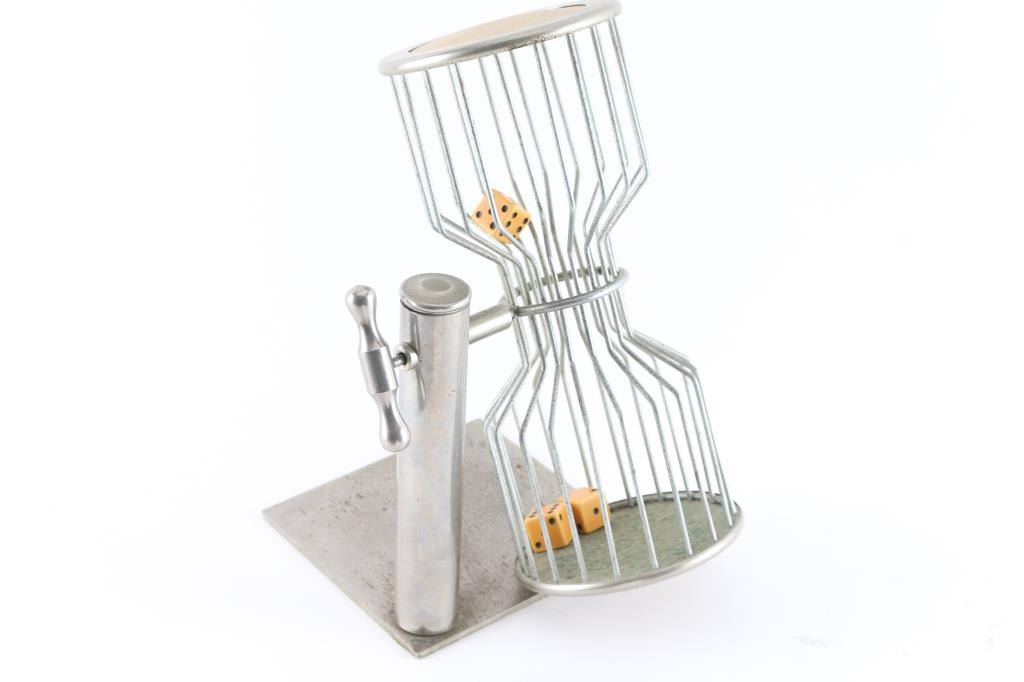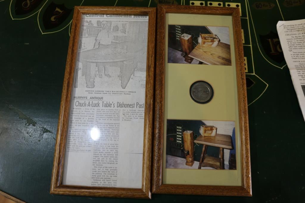 3 legged wood table with green leather top includes chuck-a luck and two framed pieces related to the tables past from the Central California News. Seized by the Watsonville Police in 1928 during raid of illegal gambling club in Hangtown also known as Placerville. Circa turn of the century table used for cheating. The article gives details of how it was used and made.