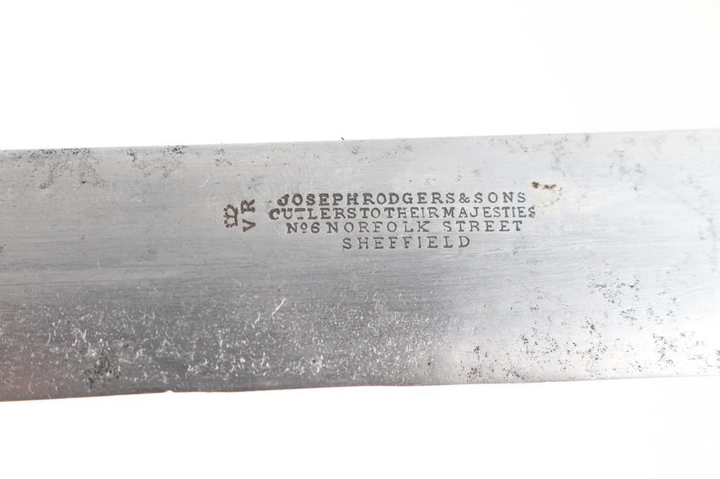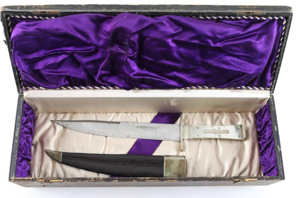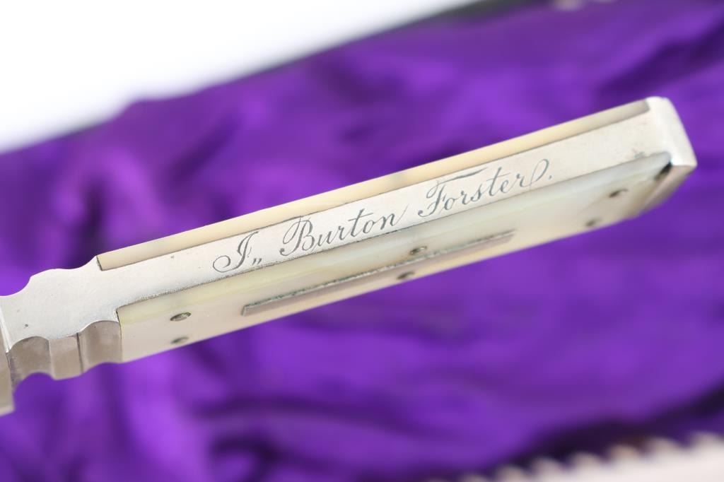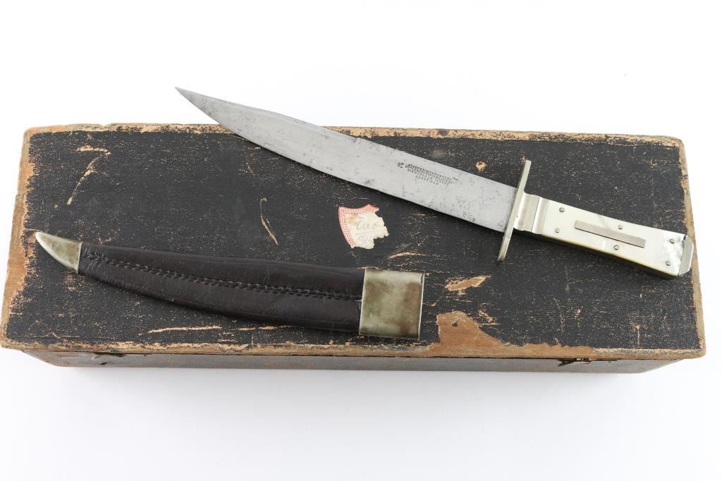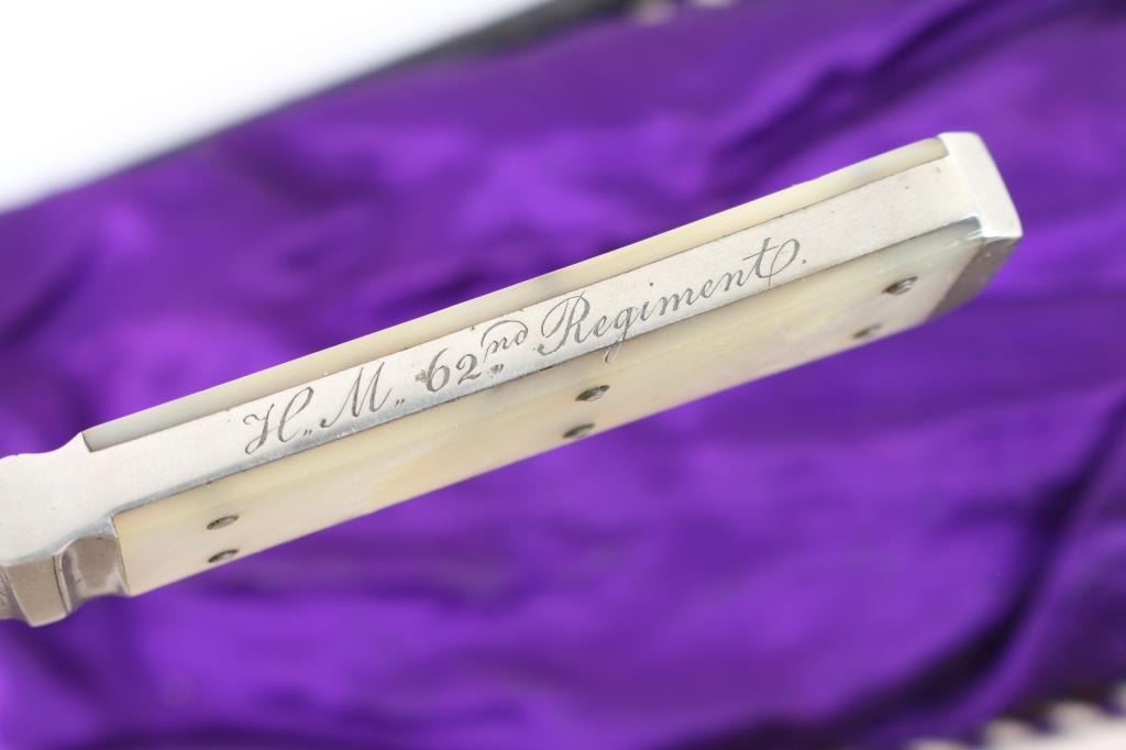 marked Joseph Rodgers& Sons makers to their majesty's, High Norfolk st Sheffield. Measures 12" overall with 8" blade. Pearl scales with German Silver pins and mounts original period scabbards retained. The knife is rated at an 8 plus on 1-10 condition scale with minor aging, slight erosion and tiny areas of pitting. Pearl scales with German silver pins and mounts original period scabbard retained. The scabbard is good and rated 7 1/2 on a scale of 1-10 with leather aging but seam tight just slight wear. The sides of the grip are period engraved J. Burton Forester, HM 62nd regiment. The knife is contained in a satin lined leather covered presentation display case. J. Burton Forester should be further researched as to his service history at the same time of the siege of Balaclava and the charge of the light brigade 1854 about the date of this bowie.
