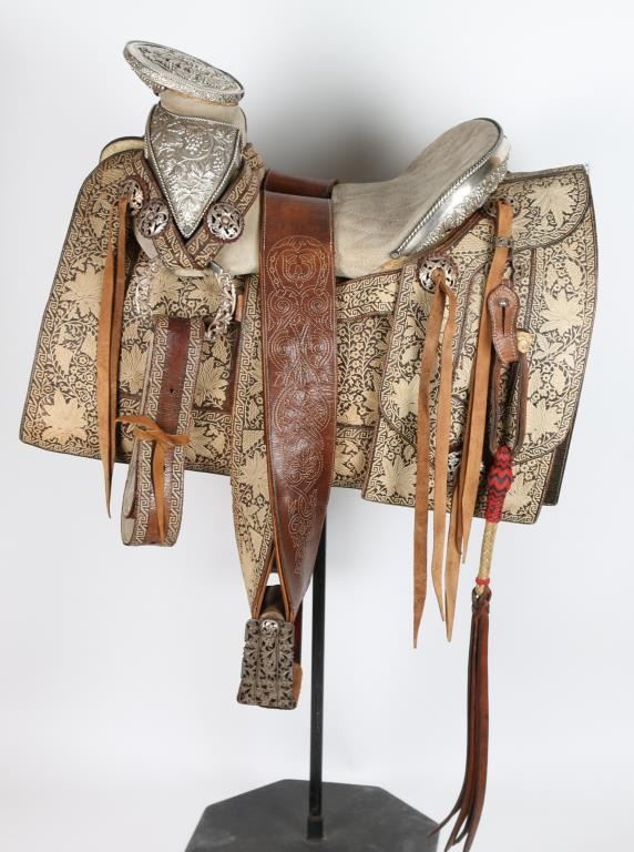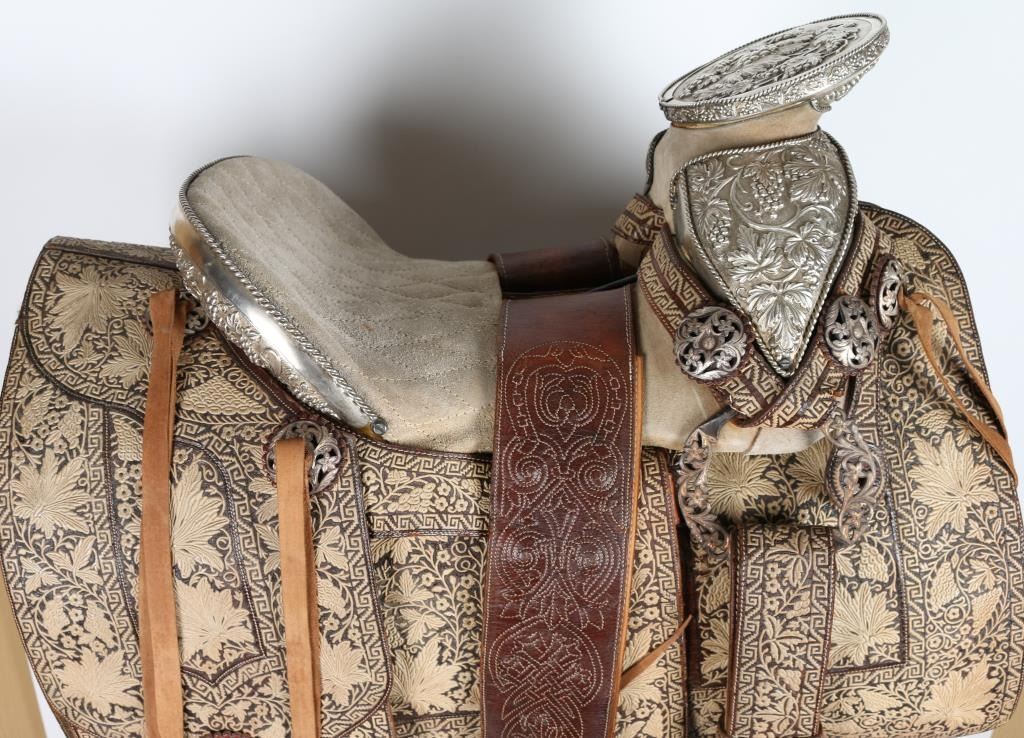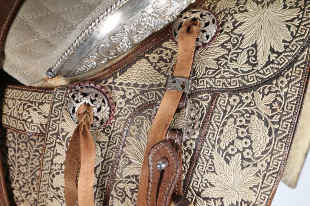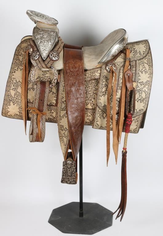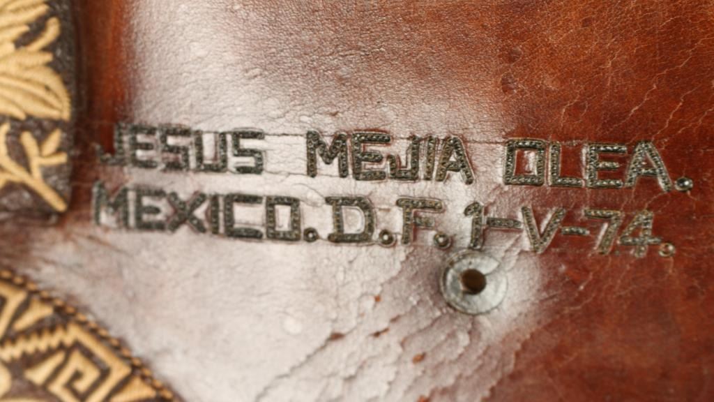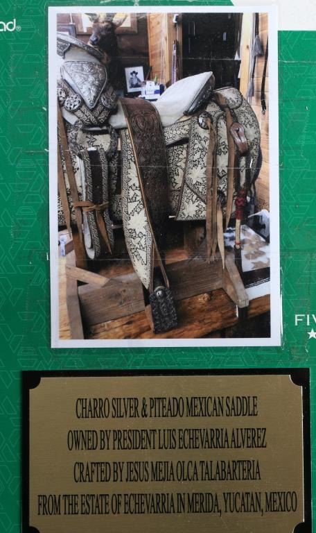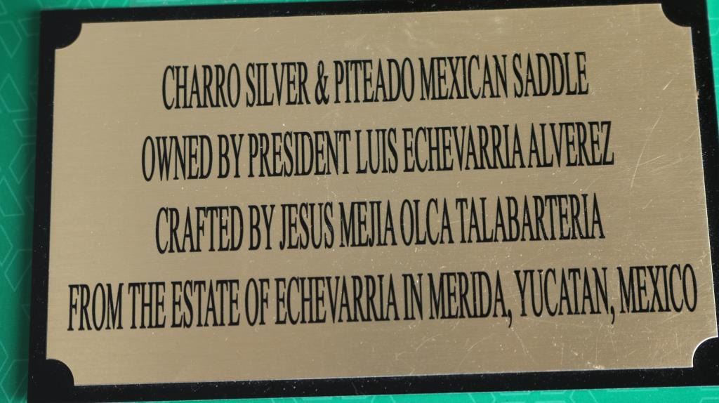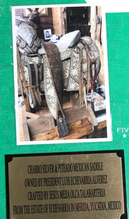 accented with handmade Charro Silver horn. Owned by President Luis Echevarria Alverez crafted by Jesus Meijia Olca Talabarteria from the Estate of Echevarria in Merdia Yucatan Mexico. This Mexican Saddle is extravagantly embroidered with intricate Piteado Cactus Fiber Thread with the Mexican leaf theme. High quality materials from Mexico. The Repouse Silver is pure 9.25 sterling, the body shows leaf design or more known as grape. Presented to the president in 1974 by maker kept on the Estate of Echevarria for more than 47 years includes documentation in Spanish from the estate.
