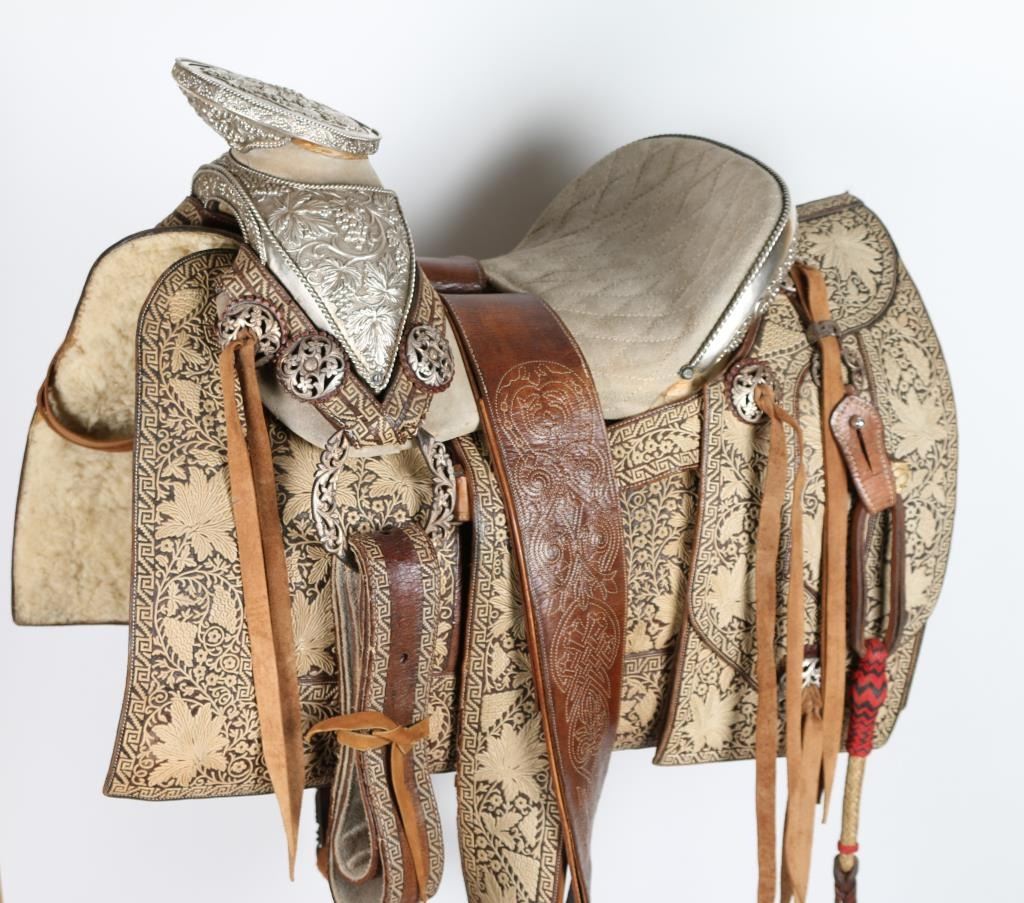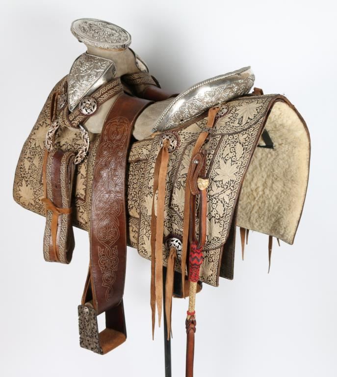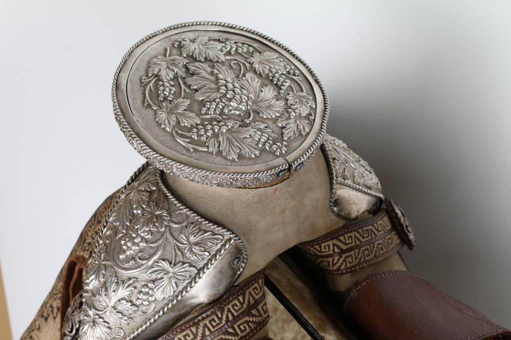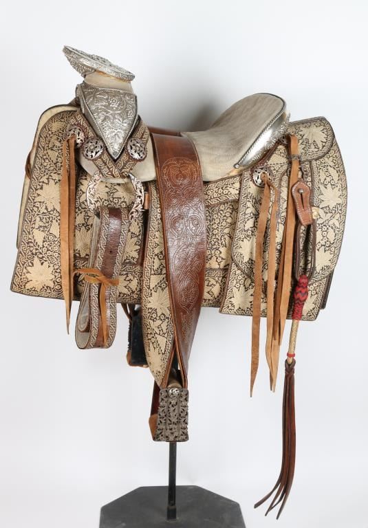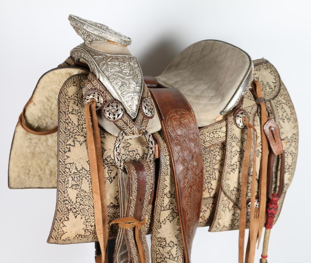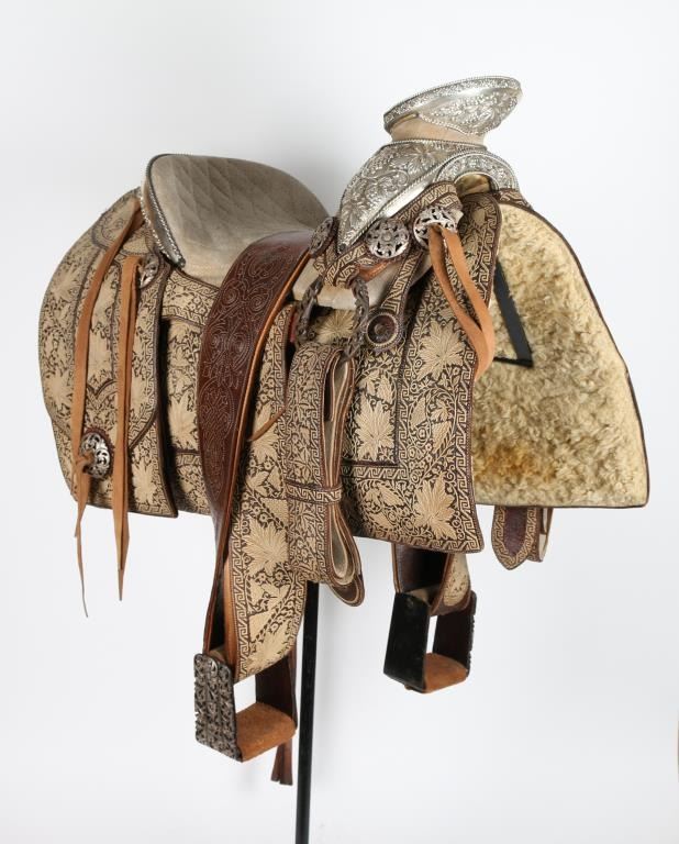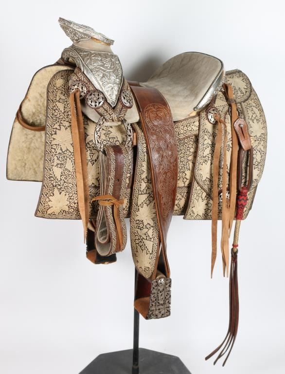 accented with handmade Charro Silver horn. Owned by President Luis Echevarria Alverez crafted by Jesus Meijia Olca Talabarteria from the Estate of Echevarria in Merdia Yucatan Mexico. This Mexican Saddle is extravagantly embroidered with intricate Piteado Cactus Fiber Thread with the Mexican leaf theme. High quality materials from Mexico. The Repouse Silver is pure 9.25 sterling, the body shows leaf design or more known as grape. Presented to the president in 1974 by maker kept on the Estate of Echevarria for more than 47 years includes documentation in Spanish from the estate.
