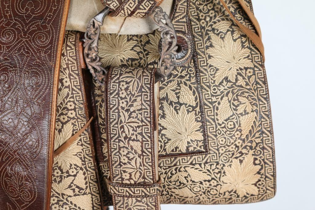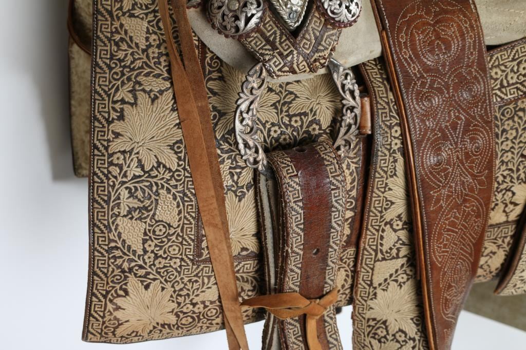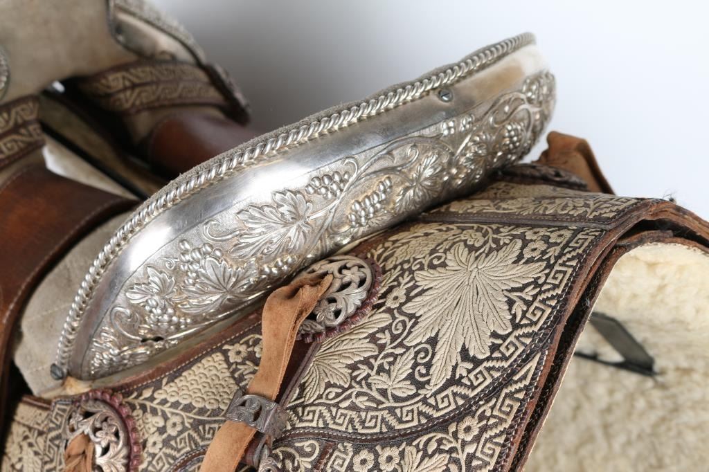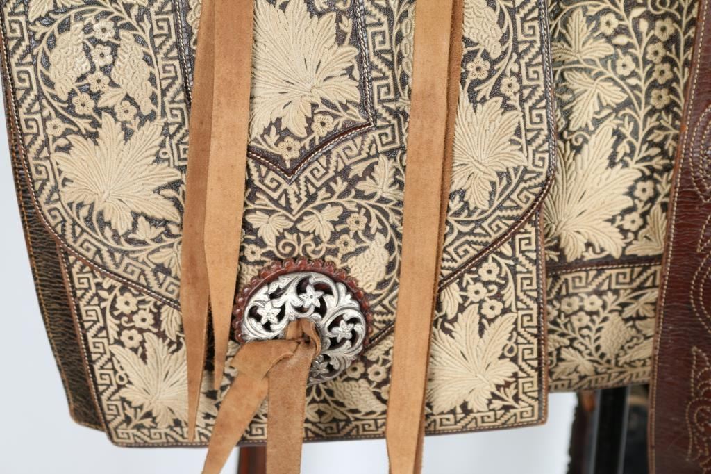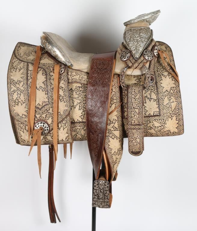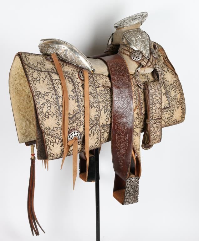 accented with handmade Charro Silver horn. Owned by President Luis Echevarria Alverez crafted by Jesus Meijia Olca Talabarteria from the Estate of Echevarria in Merdia Yucatan Mexico. This Mexican Saddle is extravagantly embroidered with intricate Piteado Cactus Fiber Thread with the Mexican leaf theme. High quality materials from Mexico. The Repouse Silver is pure 9.25 sterling, the body shows leaf design or more known as grape. Presented to the president in 1974 by maker kept on the Estate of Echevarria for more than 47 years includes documentation in Spanish from the estate.