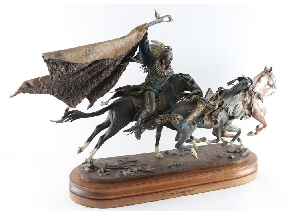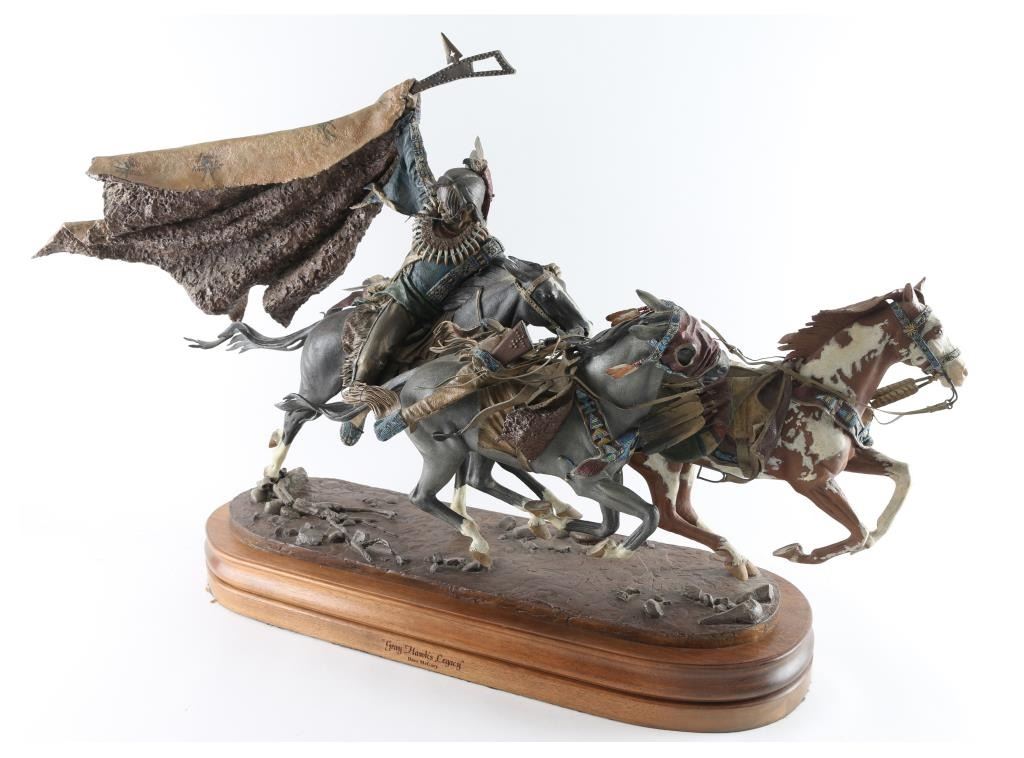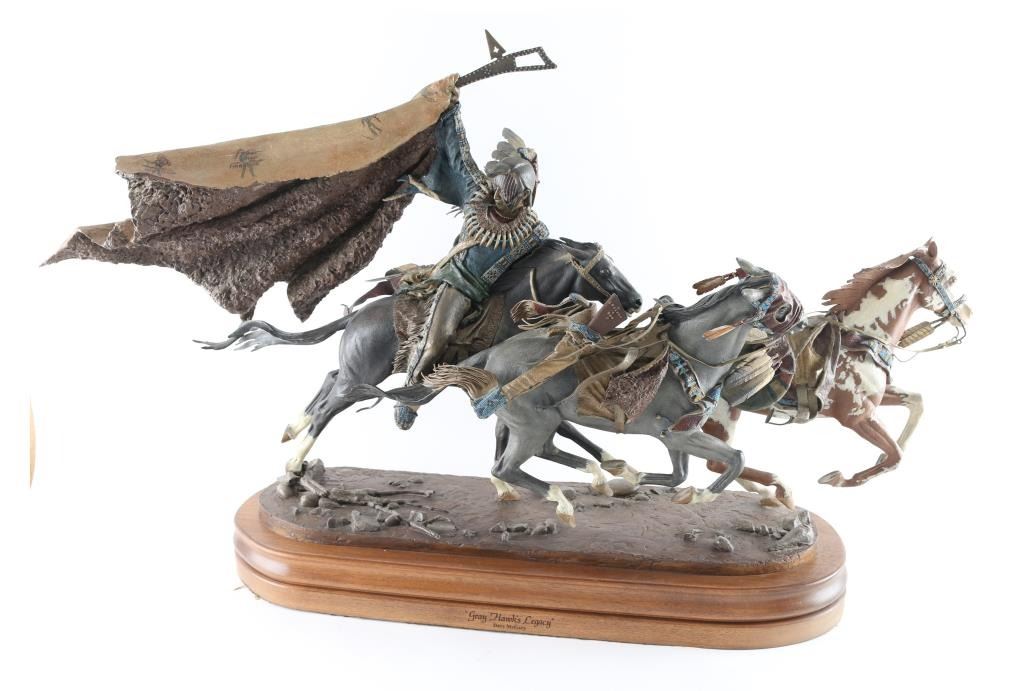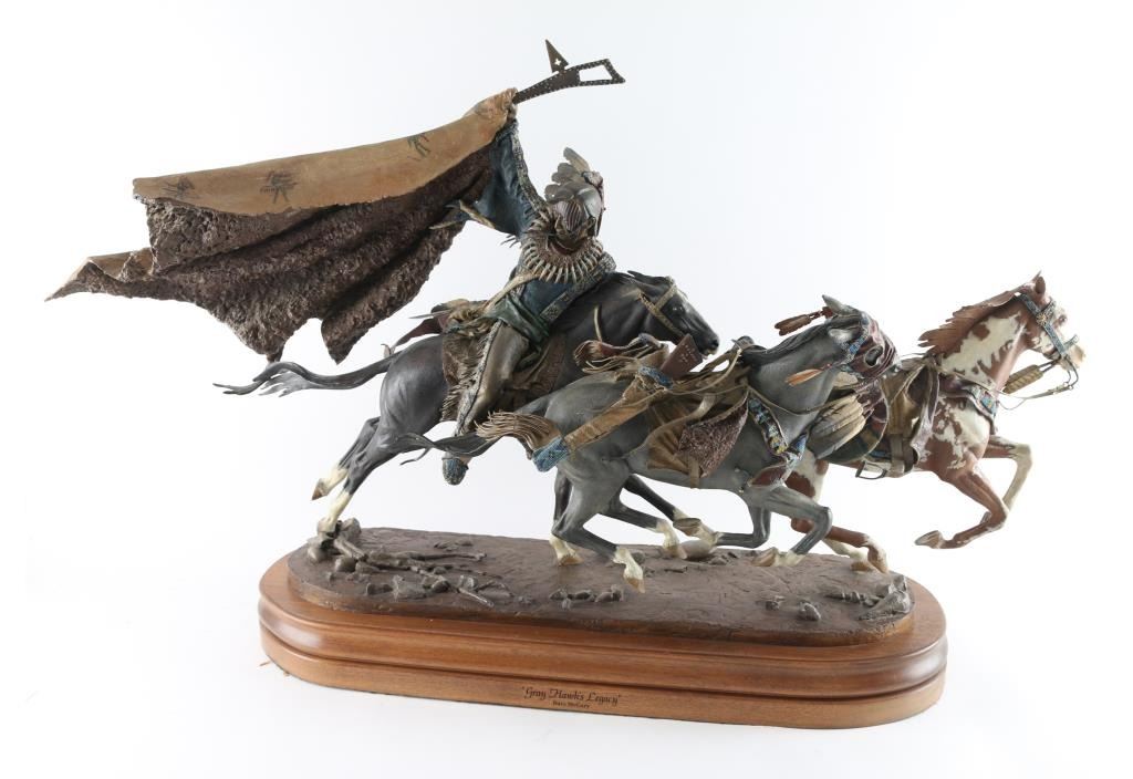 By artist "Dave McGary" Lived (1958 - 2013) Entitled "Gray Hawk's Legacy" signed on base an burned on wood with name. The story of the Gray Hawk’s Legacy is the second bronze in Dave McGary’s series the Gray Hawk trilogy. "Gray Hawk’s Legacy" captures the moment when the legendary Sioux warrior realizes that he has escaped with his stolen bounty, including a dozen Crow war-horses. More importantly, he has returned safely to his 12 year old son who has anxiously witnessed the race to freedom. Dave McGary is an interpreter of Native American culture, especially male Indians in historical native dress. His work is highly detailed, sometimes with several-hundred pieces welded together, and combines paints with patinas. He begins by making a wire skeleton and builds from the muscles to the skin to the clothing. As a teenager, he met his mentor, western sculptor Harry Jackson, who was then living in Caspar, Wyoming. McGary earned a grant to study bronze making with Jackson in Italy where he spent two years studying, learning a variety of casting techniques and studying Renaissance marble carving. Following that period, he spent several years working in foundries in New Mexico and became highly interested in Indian culture through his friendship with Sioux Indian families in South Dakota. Eventually he was adopted into that tribe's Bear Clan and given the right to attend their ceremonies. Today, Dave McGary's sculptures are in permanent collections at the U.S. Capitol National Statuary Hall, the Smithsonian Museum and the White House collection in Washington, D.C. Other monuments are placed at The Houston Astrodome, the Eiteljorg Museum of the American Indian in Indianapolis, the Buffalo Bill Historical Museum in Cody, Wyoming, and The University of Wyoming, Governors Mansion in Cheyenne, Wyoming & the Tribal Office Building at Ft. Washakie Wyoming. Additional installments are placed at the Shinnecock Native Culture Museum in New York, McCord Museum in Montreal Canada, J.W. Marriott Scottsdale, Arizona, Mayo Clinic and Hospital Scottsdale, Arizona, The Gene Autry Museum in Los Angeles, California, the Tenth Circuit Court of Appeals in Denver, Colorado, the Wyoming State Capitol in Cheyenne, and Concordia University in Montreal, Canada. Artist: Dave McGary Title: "Gray Hawk's Legacy" Medium: Bronze Sculpture Circa/Year: 2000 Signature Type: Signed Signature Location: on base Edition: 16/60 Approx. 70 lbs.