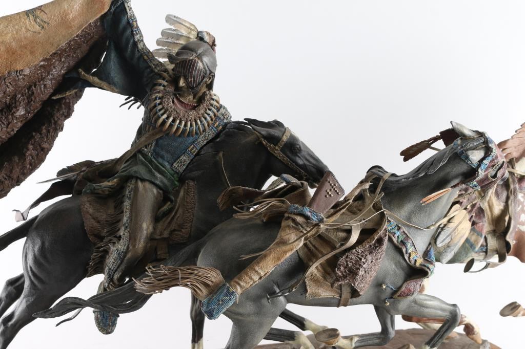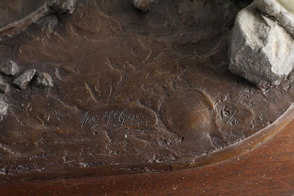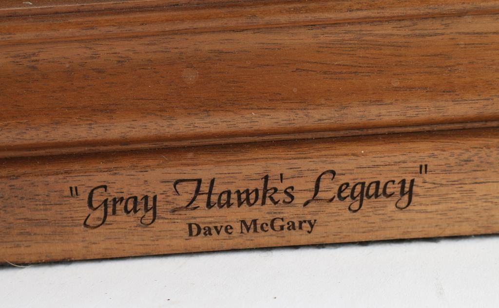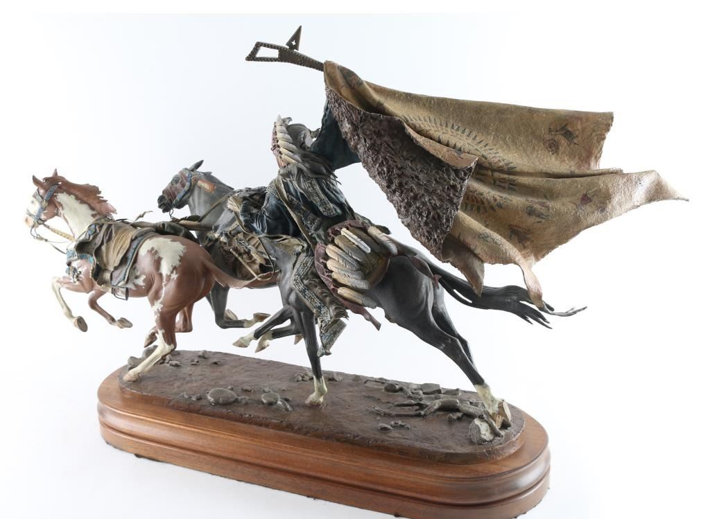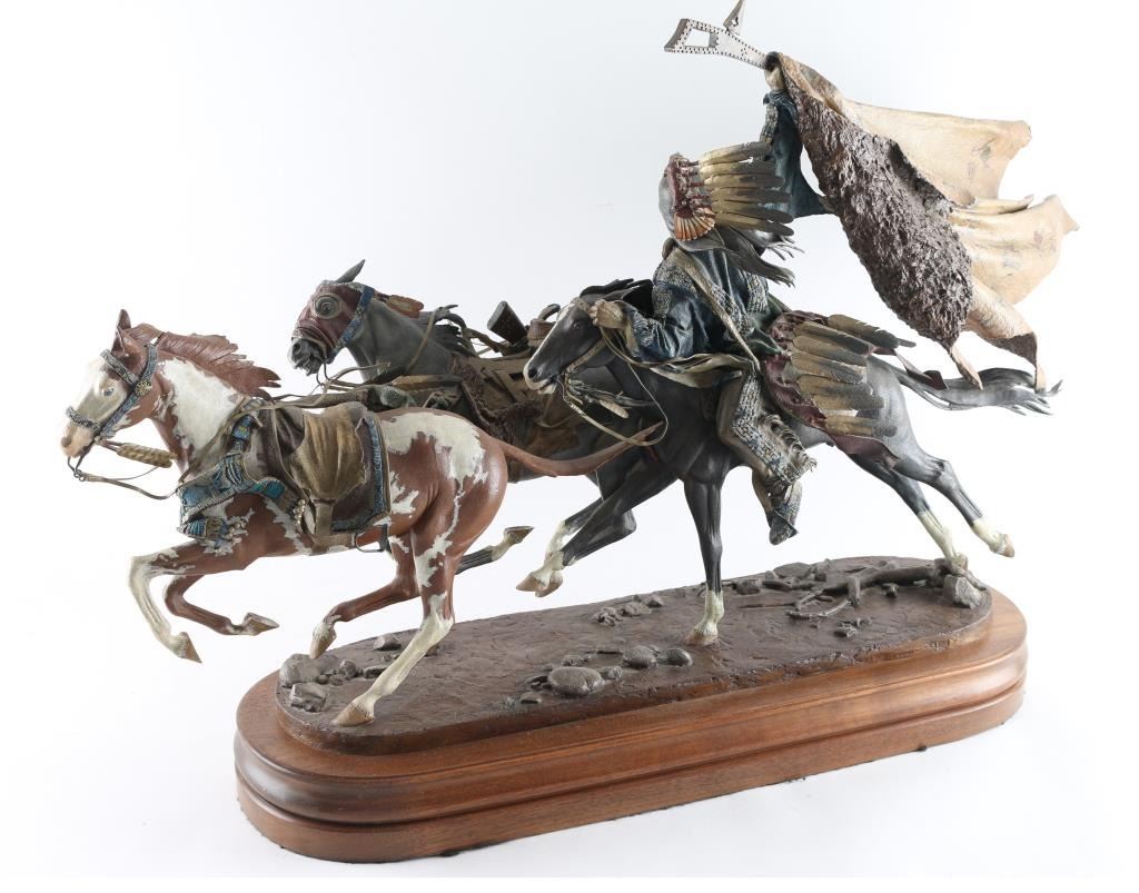 By artist "Dave McGary" Lived (1958 - 2013) Entitled "Gray Hawk's Legacy" signed on base an burned on wood with name. The story of the Gray Hawk’s Legacy is the second bronze in Dave McGary’s series the Gray Hawk trilogy. "Gray Hawk’s Legacy" captures the moment when the legendary Sioux warrior realizes that he has escaped with his stolen bounty, including a dozen Crow war-horses. More importantly, he has returned safely to his 12 year old son who has anxiously witnessed the race to freedom. Dave McGary is an interpreter of Native American culture, especially male Indians in historical native dress. His work is highly detailed, sometimes with several-hundred pieces welded together, and combines paints with patinas. He begins by making a wire skeleton and builds from the muscles to the skin to the clothing. As a teenager, he met his mentor, western sculptor Harry Jackson, who was then living in Caspar, Wyoming. McGary earned a grant to study bronze making with Jackson in Italy where he spent two years studying, learning a variety of casting techniques and studying Renaissance marble carving. Following that period, he spent several years working in foundries in New Mexico and became highly interested in Indian culture through his friendship with Sioux Indian families in South Dakota. Eventually he was adopted into that tribe's Bear Clan and given the right to attend their ceremonies. Today, Dave McGary's sculptures are in permanent collections at the U.S. Capitol National Statuary Hall, the Smithsonian Museum and the White House collection in Washington, D.C. Other monuments are placed at The Houston Astrodome, the Eiteljorg Museum of the American Indian in Indianapolis, the Buffalo Bill Historical Museum in Cody, Wyoming, and The University of Wyoming, Governors Mansion in Cheyenne, Wyoming & the Tribal Office Building at Ft. Washakie Wyoming. Additional installments are placed at the Shinnecock Native Culture Museum in New York, McCord Museum in Montreal Canada, J.W. Marriott Scottsdale, Arizona, Mayo Clinic and Hospital Scottsdale, Arizona, The Gene Autry Museum in Los Angeles, California, the Tenth Circuit Court of Appeals in Denver, Colorado, the Wyoming State Capitol in Cheyenne, and Concordia University in Montreal, Canada. Artist: Dave McGary Title: "Gray Hawk's Legacy" Medium: Bronze Sculpture Circa/Year: 2000 Signature Type: Signed Signature Location: on base Edition: 16/60 Approx. 70 lbs.