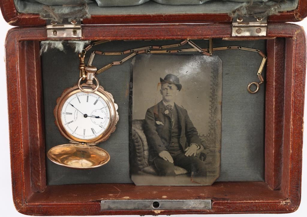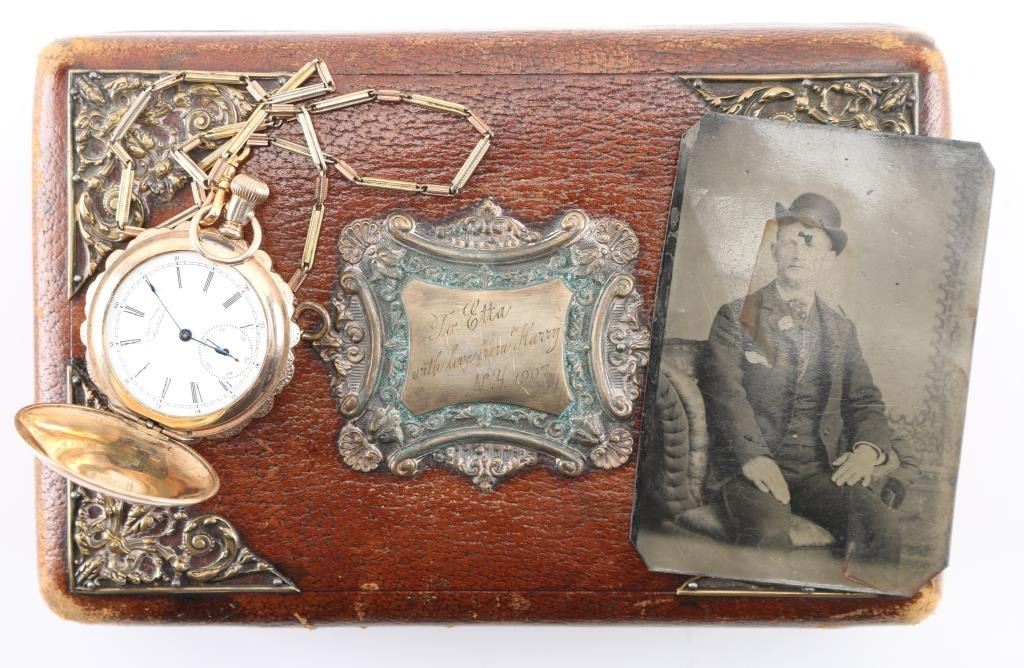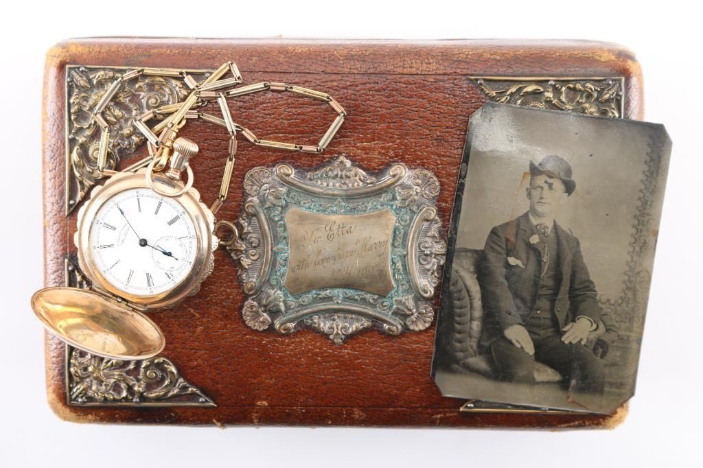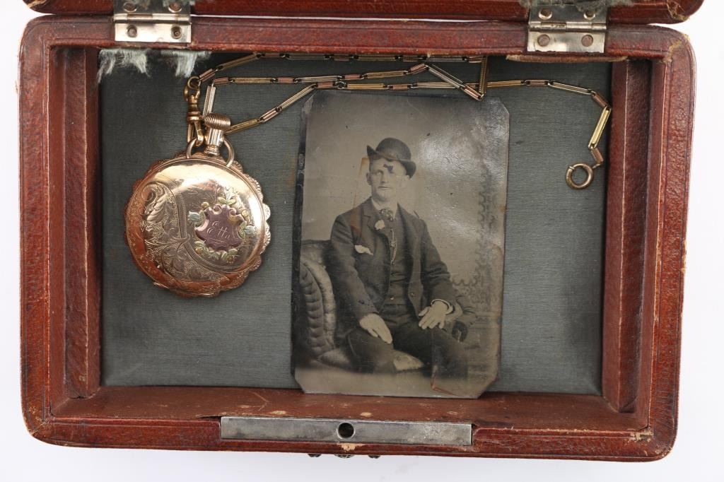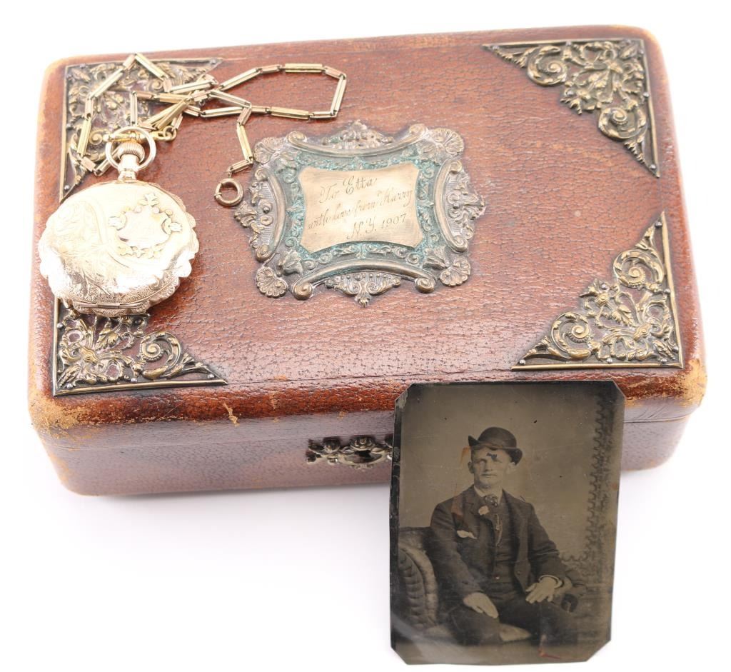 Fancy multi-colored gold ladies hunting case pocket watch with scenes of flowers, a bird and "Etta" inscribed on watch cover. Includes attached multi-colored chain, tin type with man in suit with derby, fancy leather bound padded jewelry box with fancy panel inscribed "To Etta..." and notarized letter. Letter dated 28 June 2001, signed by JS Craig, states in summary: In 1985, he attended an estate sale in Ft Wort, Texas and purchased the above items. After purchase he realized the tin was inscribed with, "Harry Longbaugh - 7 7 1899". He paid $45 for the watch, chain and photo, which he in turn sold them for an undisclosed amount to prominent collector Michael Nelson of Marion Kentucky. He signs and swears it to be truth on his Masonic oath and notarized the signature. Harry Longbaugh and his girlfriend, aka "The Sundance Kid" and "Etta" along with the gang spent time in Ft. Worth, Texas and were known to have been photographed in that famous frontier town. From a prominent old west collection.