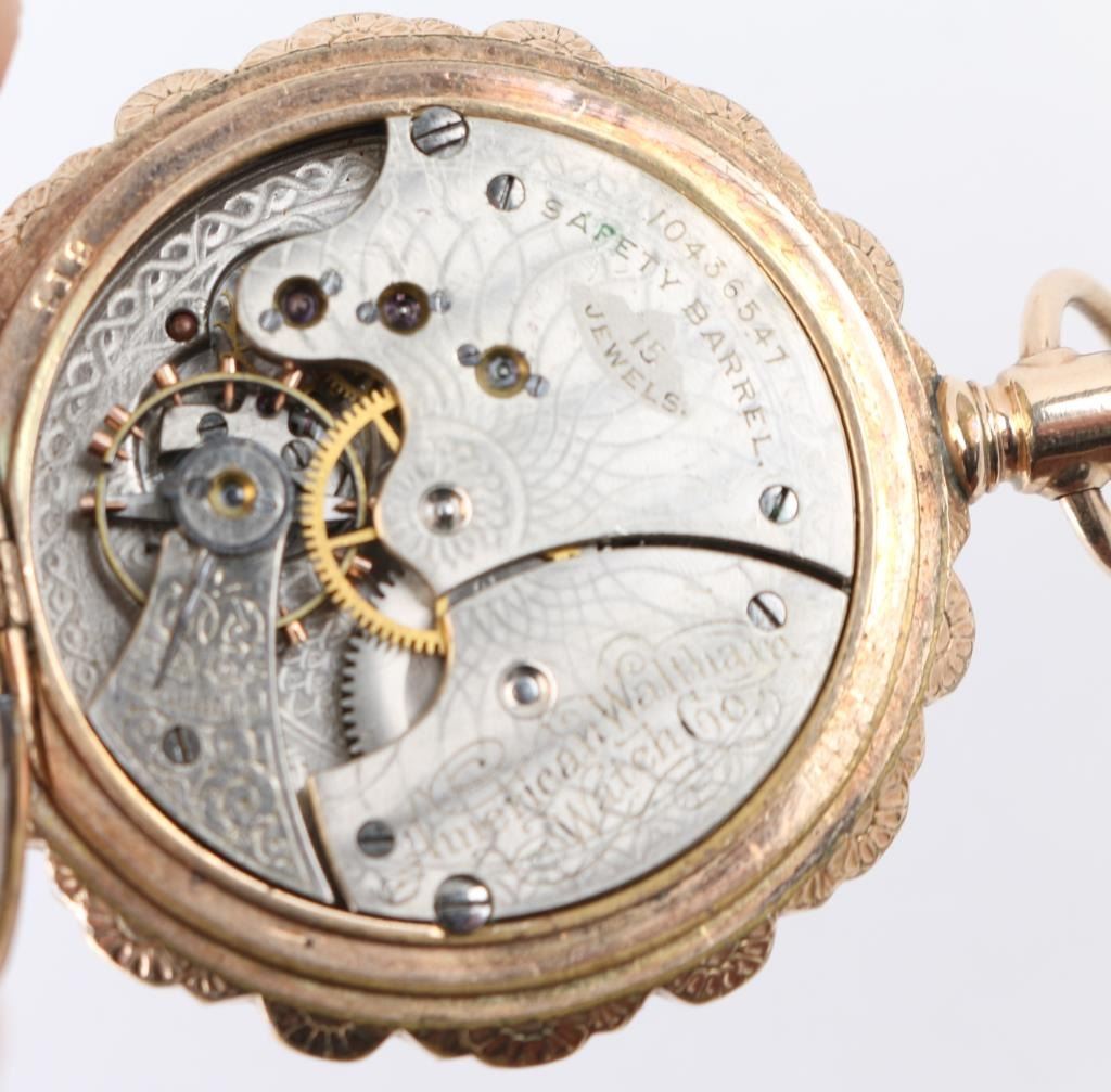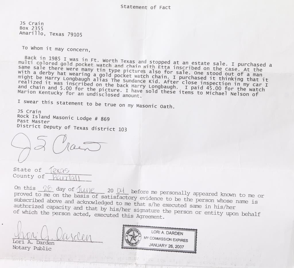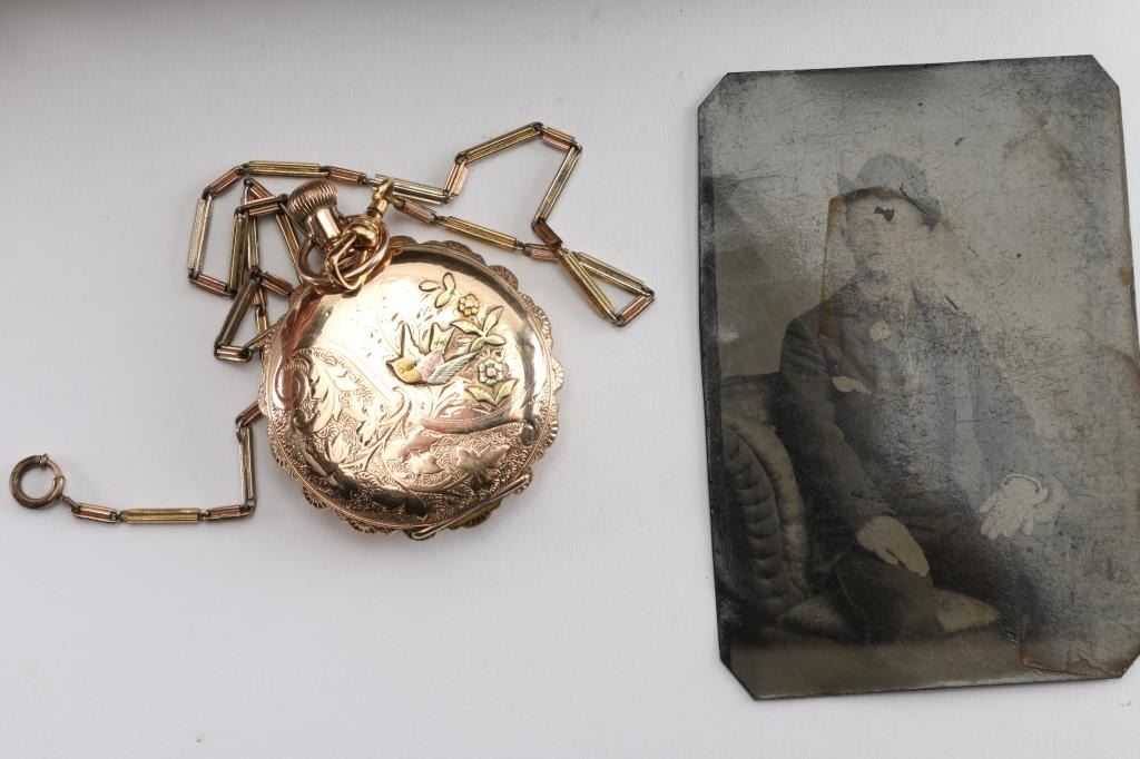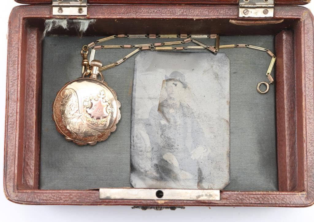 Fancy multi-colored gold ladies hunting case pocket watch with scenes of flowers, a bird and "Etta" inscribed on watch cover. Includes attached multi-colored chain, tin type with man in suit with derby, fancy leather bound padded jewelry box with fancy panel inscribed "To Etta..." and notarized letter. Letter dated 28 June 2001, signed by JS Craig, states in summary: In 1985, he attended an estate sale in Ft Wort, Texas and purchased the above items. After purchase he realized the tin was inscribed with, "Harry Longbaugh - 7 7 1899". He paid $45 for the watch, chain and photo, which he in turn sold them for an undisclosed amount to prominent collector Michael Nelson of Marion Kentucky. He signs and swears it to be truth on his Masonic oath and notarized the signature. Harry Longbaugh and his girlfriend, aka "The Sundance Kid" and "Etta" along with the gang spent time in Ft. Worth, Texas and were known to have been photographed in that famous frontier town. From a prominent old west collection.