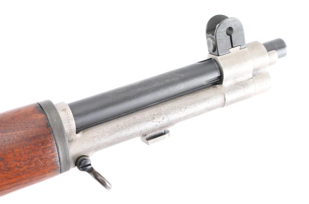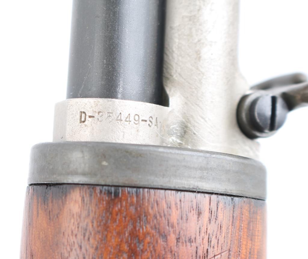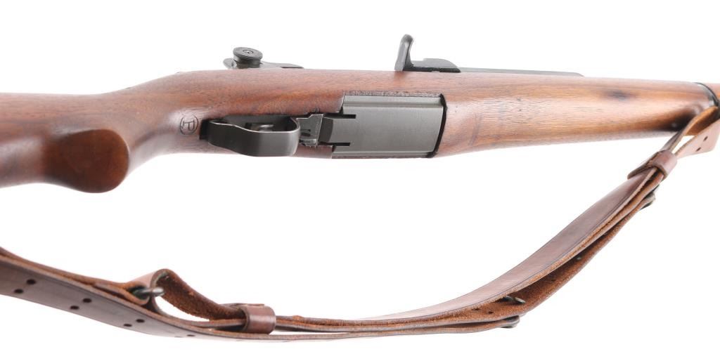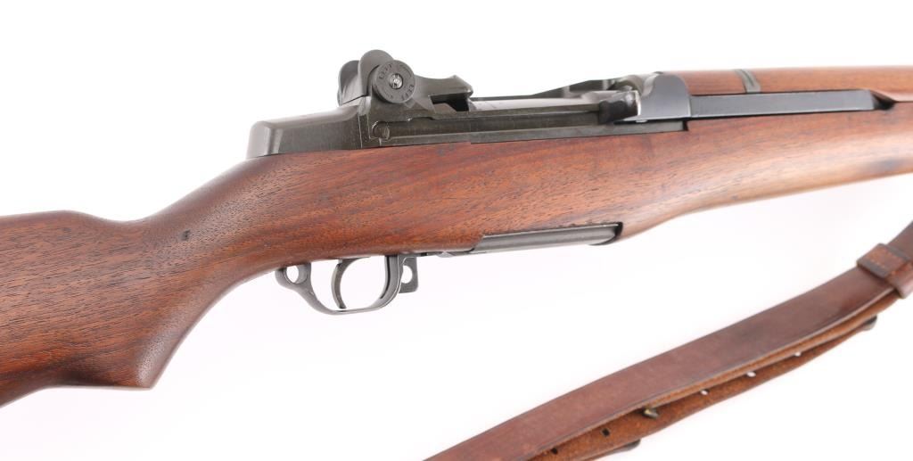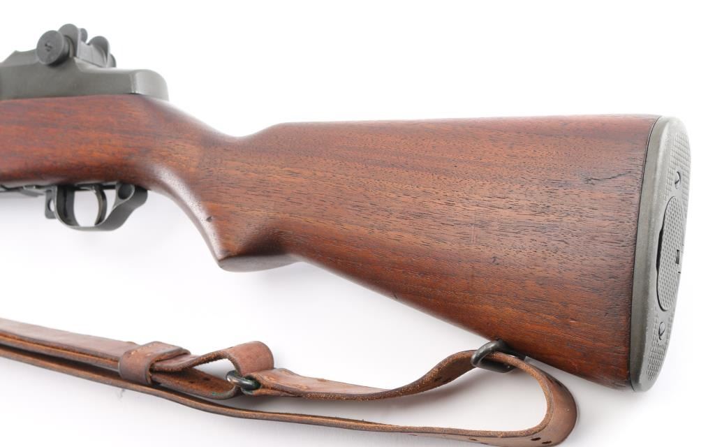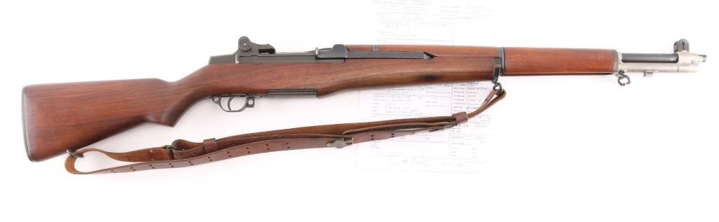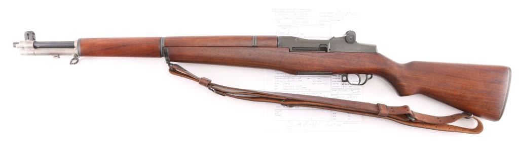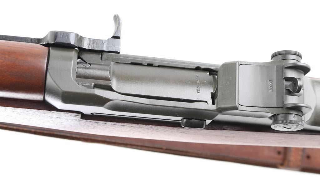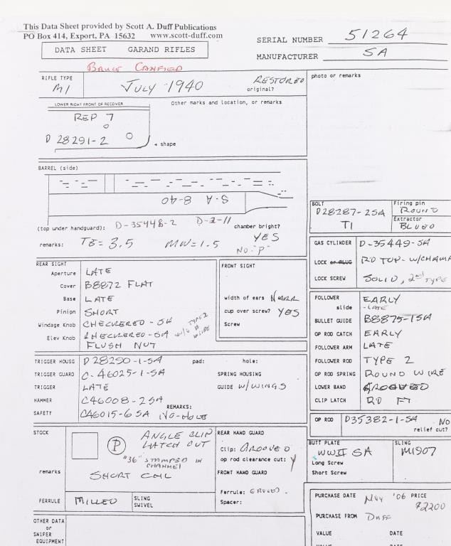 This is a Scott Duff restoration, purchased from him in 2006. A rifle of this serial number could have been originally been of either gas trap or gas port configuration. there is no way to say with certainty. This restored example is in very good condition with the receiver having a dark parkerized finish and is loaded with many early parts. The SA 8-40 barrel has a bright and shiny bore with TE=3.5, MW=1.5, and no chrome at the gas port. Featured parts include -T1 heat lot bolt, round firing pin, unmodified-1-SA op rod, gas cylinder with drawing number, front sight seal, solid lock screw, early follower, B8875-1SA bullet guide, early op rod catch, full round body type 2 follower rod,wire op rod spring, grooved rear handguard clip, grooved lower band, short piston with flush nut, checkered windage knob and elevation cap, B8872 rear sight cover, -12-0SA trigger housing, C-46025-1-SA trigger guard, C46008-2A hammer, C46015-6SA no hole safety, no finish hammer spring plunger and housing, milled stock ferrule, trap type buttplate and early (GHS) stock with slant clip latch cut and short channel with no visible cartouche of ordnance emblem, with a visible proof P in circle. The handguards match the color and condition of the stock. Included an undated M1907 leather sling with brass hardware. Overall, this is a very nice looking early rifle with some very scarce early parts. Comes with Scotts data sheets, sales receipt. Scott Duff is the author of many books on the M1 Garand, and is considered one of the leading experts in the field. NRA Condition-Excellent. C&R Firearm.