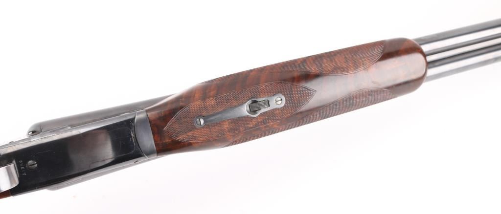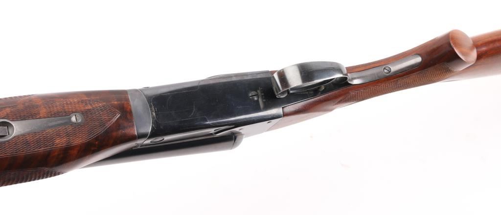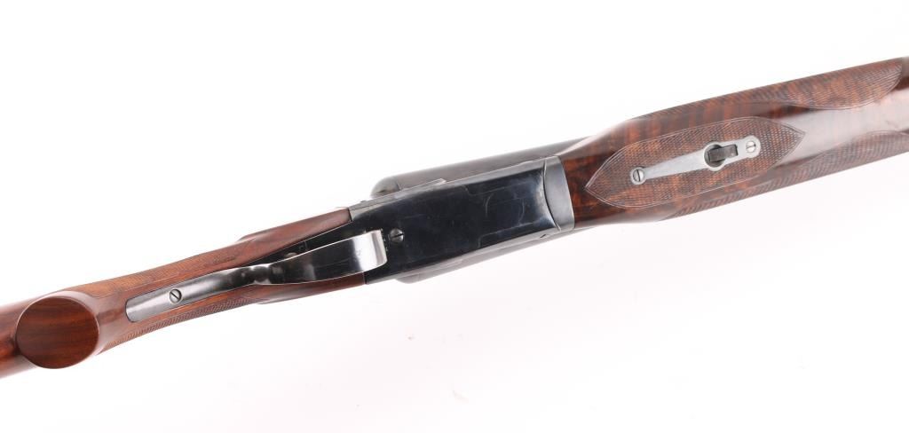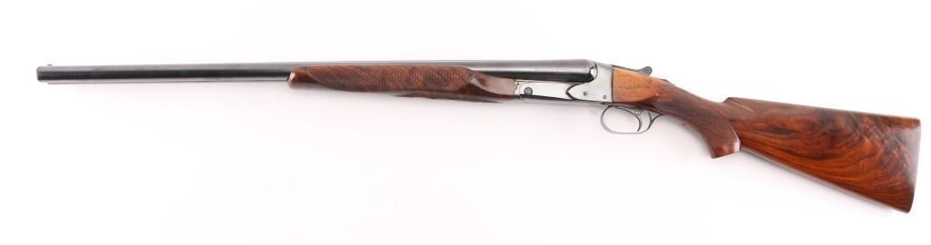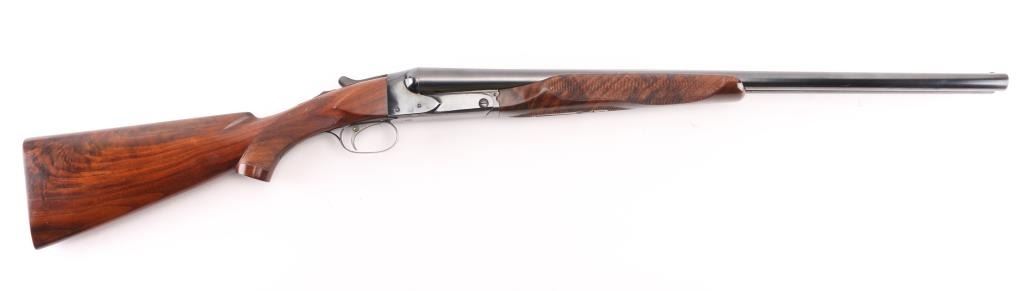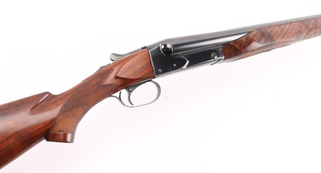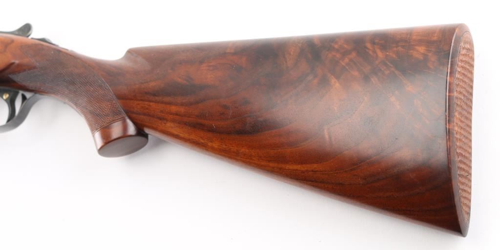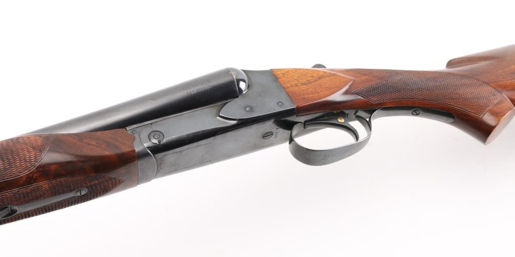 Side-by-side double barrel boxlock shotgun chambered for 2 3/4" 12 gauge shells, manufactured in New Haven, CT circa 1940’s. Features a blued refinish, 26" full/mod choked barrels with raised solid rib, selective automatic ejectors, red bead front sight, steel mid bead, single selective trigger with push button barrel selector, sliding tang safety, knurled top lever, fancy figured walnut beavertail forend with diamond checkering and semi-pistol grip shoulder stock with diamond checkered butt. (No buttplate, or recoil pad) Length of pull 14”. Matching serial numbers are found on the receiver, and forend (on the wood & metal). Shotgun retains approximately 90% re-blued finish with some scratches/rubs, and smaller losses on some sharp edges. Action is sound, the bores are excellent and fancy grade re-finished walnut stocks are good with blemishes & small losses. Underside of receiver stamped "Skeet". NRA Condition-Very Good as Refinished, C&R Firearm.