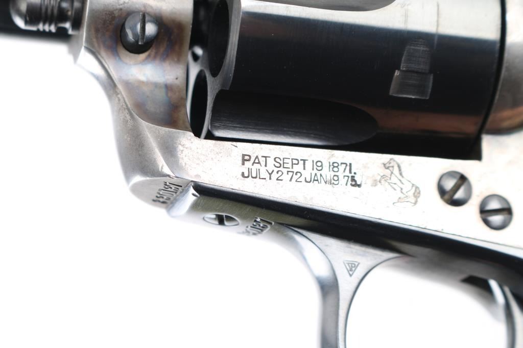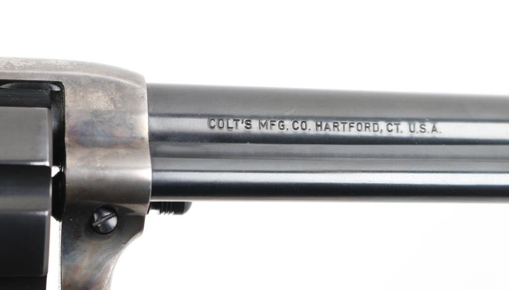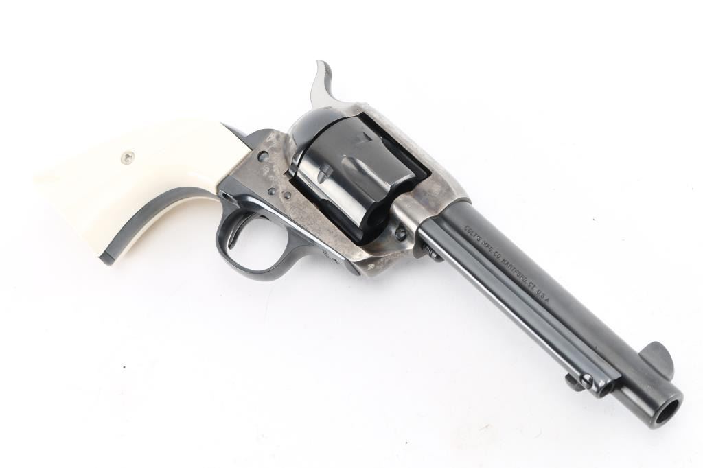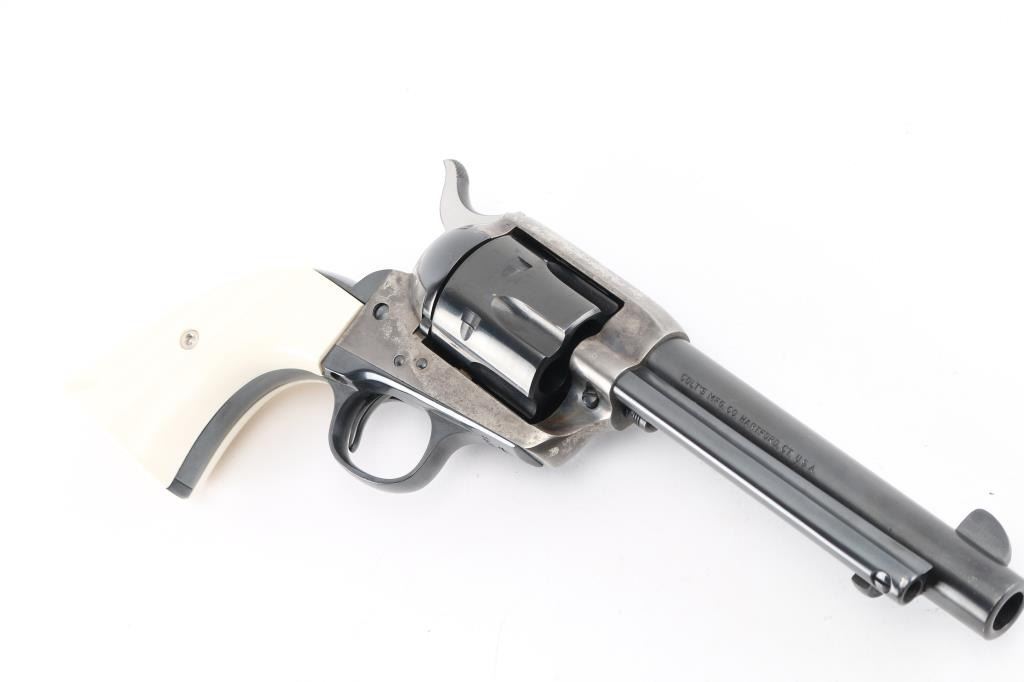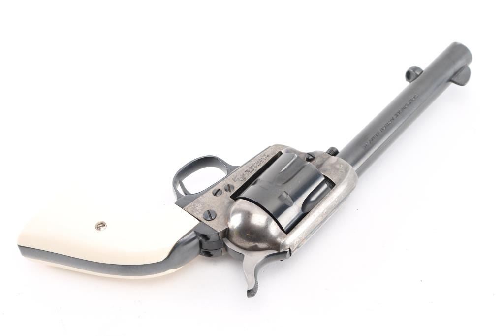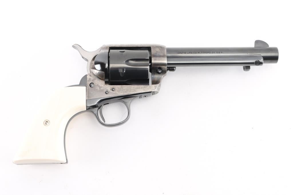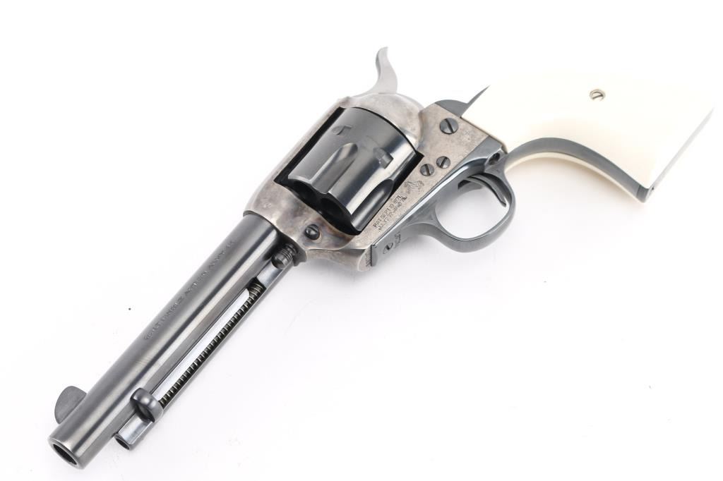 Rebarreled/ Restored 1st Generation Colt SAA. 5 1/2" barrel. Manufactured 1915. This revolver has had the barrel, ejector housing/rod, cylinder, & hammer replaced, chamber in .45 Colt. The barrel, with the colt address on the right side, dates from 1947 to 1955. ("Colt's Mfg. Co.") Blue refinish, case hardened frame is in the white, with traces of case colors in protected areas, replaced faux ivory grips. Matching serial numbers on frame, triggerguard, & back Strap. Assembly number "153" on loading gate. . Bore is excellent/bright, action is crisp/tight,. Blue is excellent. Grips excellent. All markings are crisp/clear. Would make a great shooter. NRA Condition-Near very Good as Restored. C&R Firearm.