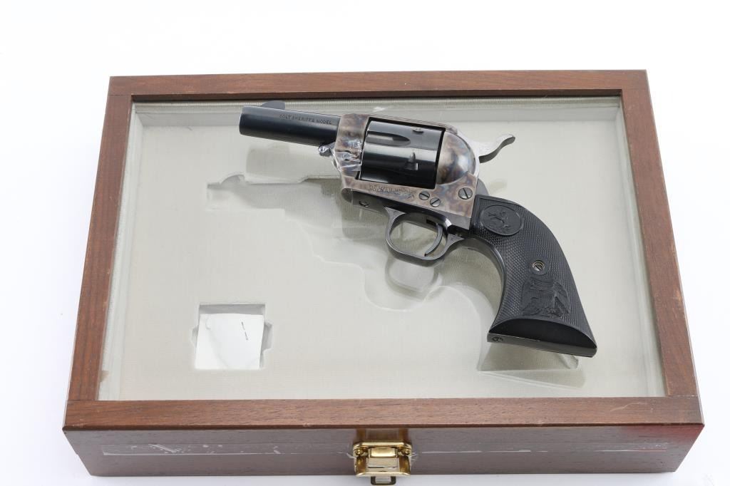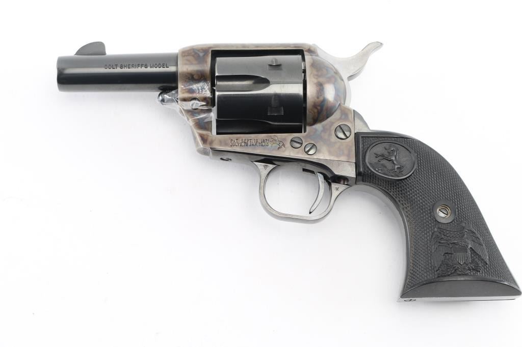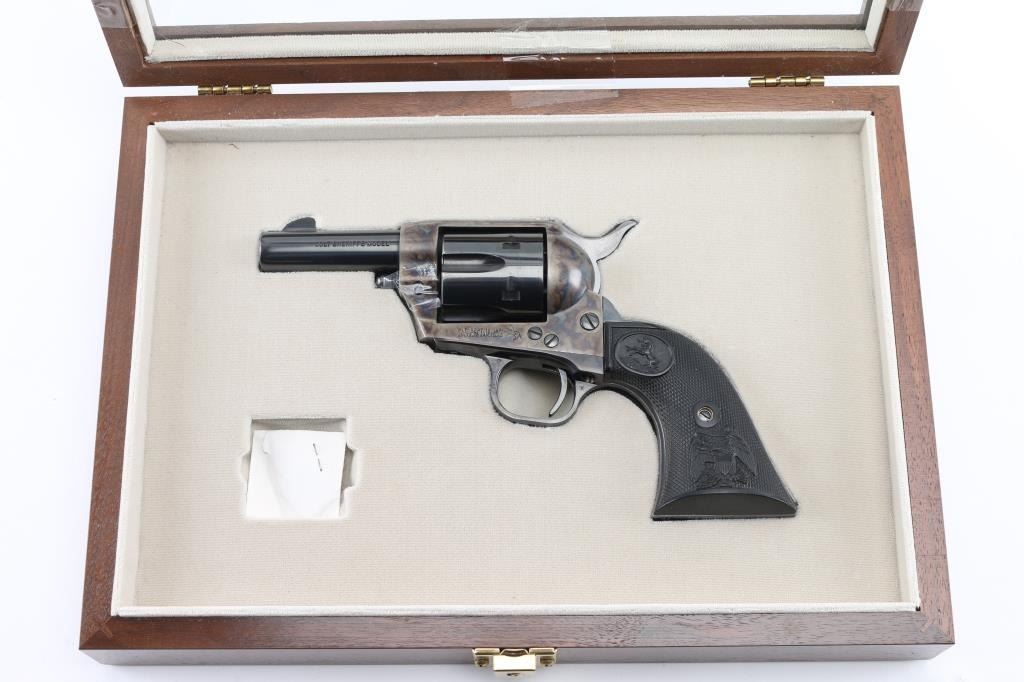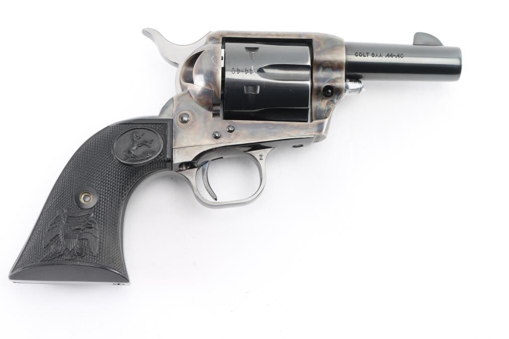 Third Generation' Beautiful ejectorless short barreled single action revolver chambered in .44-40., manufactured circa 1980. Features a 3" high polish blued barrel with two-line address, blade front sight, square notched rear sight, smooth thin trigger, knurled hammer spur, fluted six-shot .44-40 cylinder with high polish blued finish, case hardened frame and two-piece checkered black synthetic grips with federal eagle & Rampant Colt decor. It is missing the cylinder pin screw retaining nut, screw present, taped in place. easily replaced. Revolver exhibits approximately 98%+ of it's original finish showing some light wear on the cylinder with no other observed wear. Action is crisp, the bore is pristine and the synthetic grips are fine. Comes in a form fitted, glass top display case with key, no extra cylinder. The glass is loose, and is taped in place. Needs repair. Would be excellent if not for missing nut. Condition is NRA Good/needs nut. Modern Firearm.
