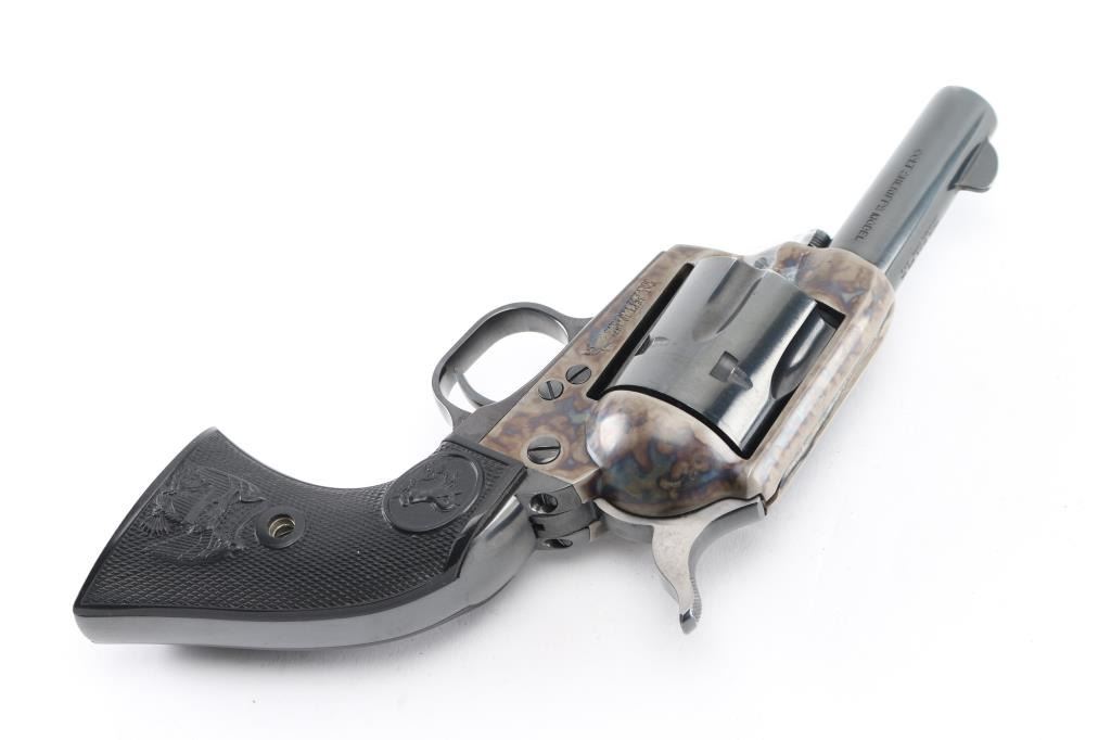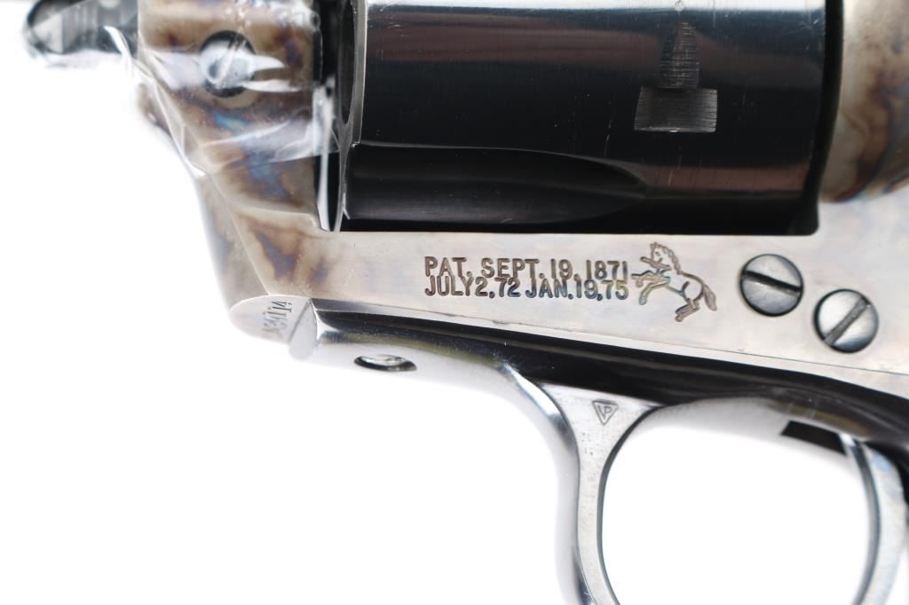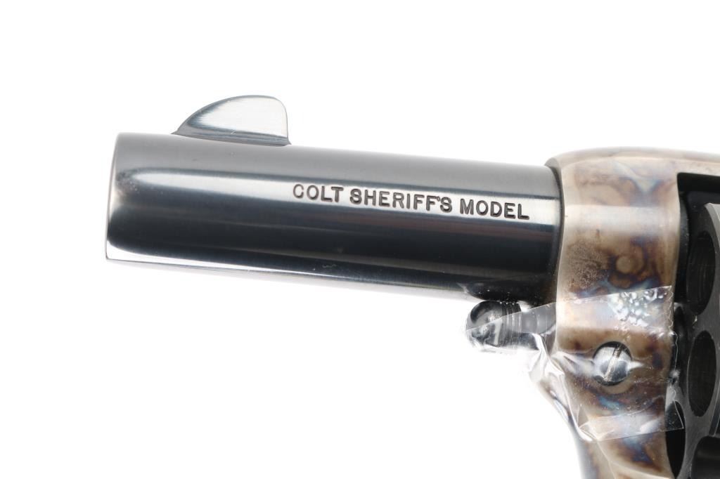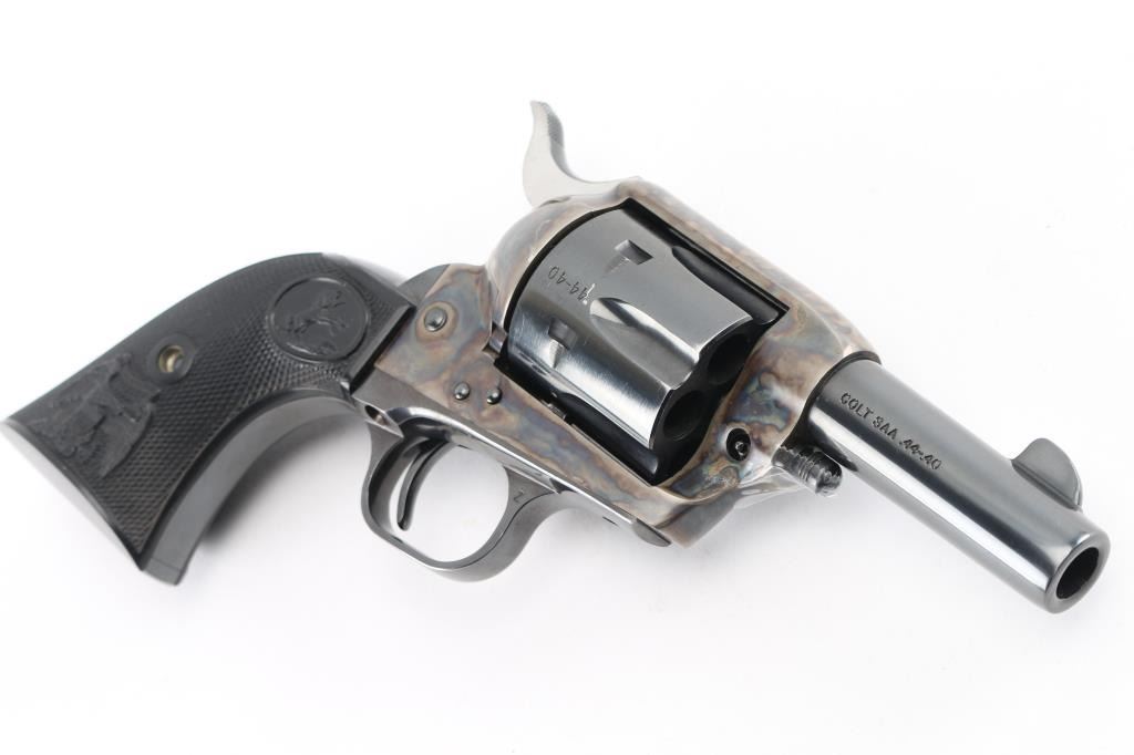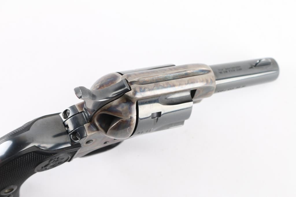 Third Generation' Beautiful ejectorless short barreled single action revolver chambered in .44-40., manufactured circa 1980. Features a 3" high polish blued barrel with two-line address, blade front sight, square notched rear sight, smooth thin trigger, knurled hammer spur, fluted six-shot .44-40 cylinder with high polish blued finish, case hardened frame and two-piece checkered black synthetic grips with federal eagle & Rampant Colt decor. It is missing the cylinder pin screw retaining nut, screw present, taped in place. easily replaced. Revolver exhibits approximately 98%+ of it's original finish showing some light wear on the cylinder with no other observed wear. Action is crisp, the bore is pristine and the synthetic grips are fine. Comes in a form fitted, glass top display case with key, no extra cylinder. The glass is loose, and is taped in place. Needs repair. Would be excellent if not for missing nut. Condition is NRA Good/needs nut. Modern Firearm.