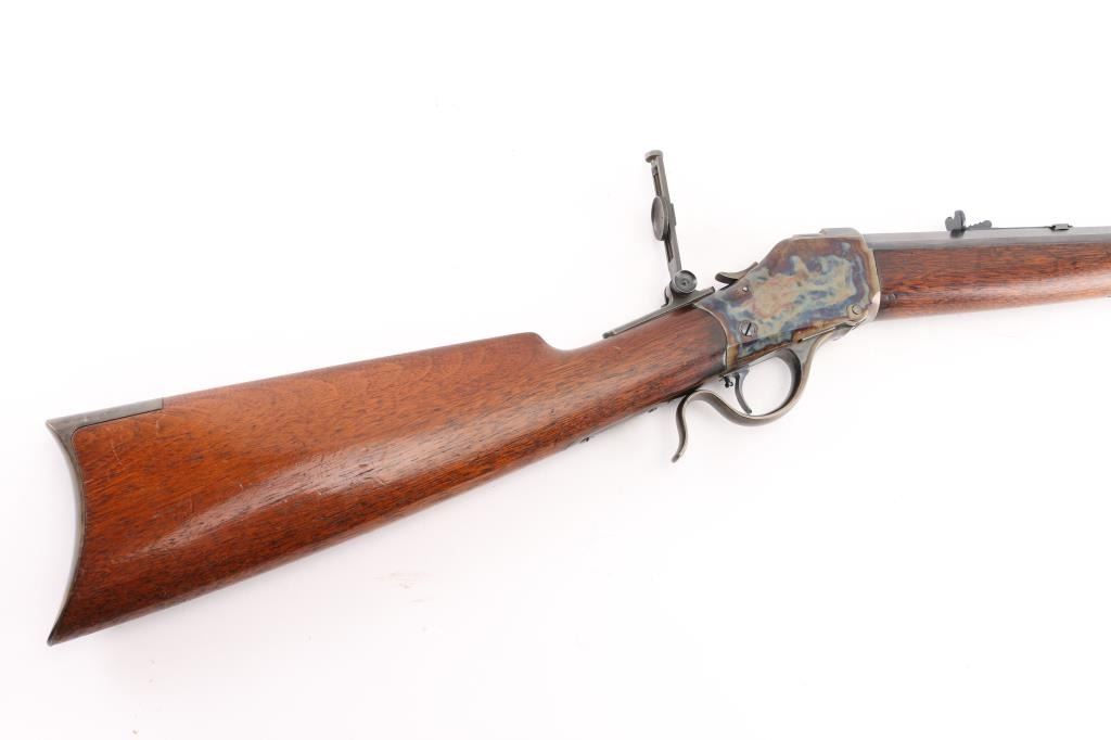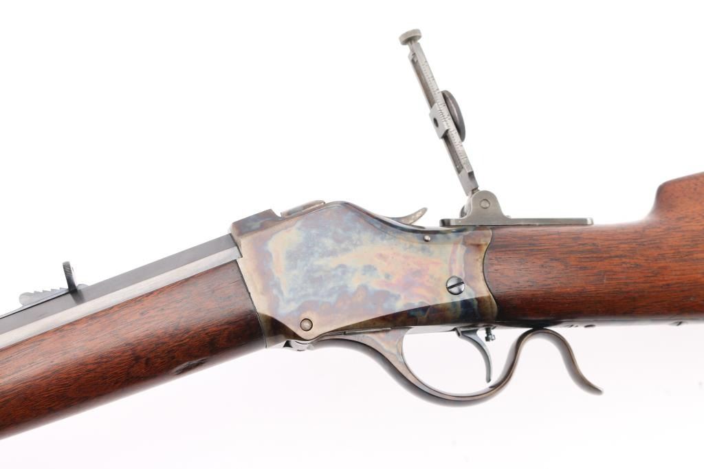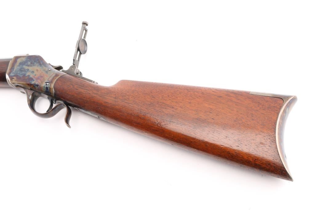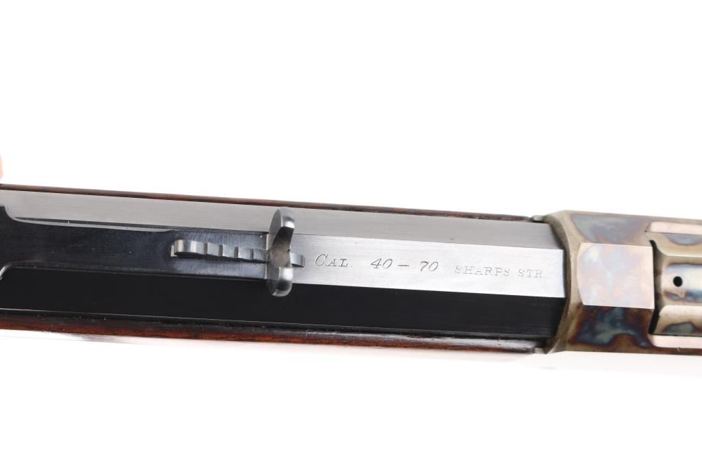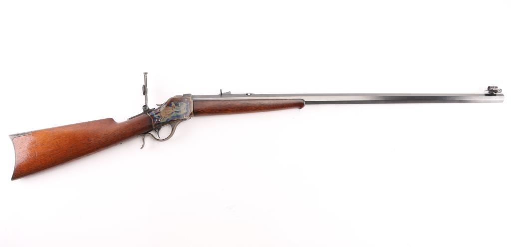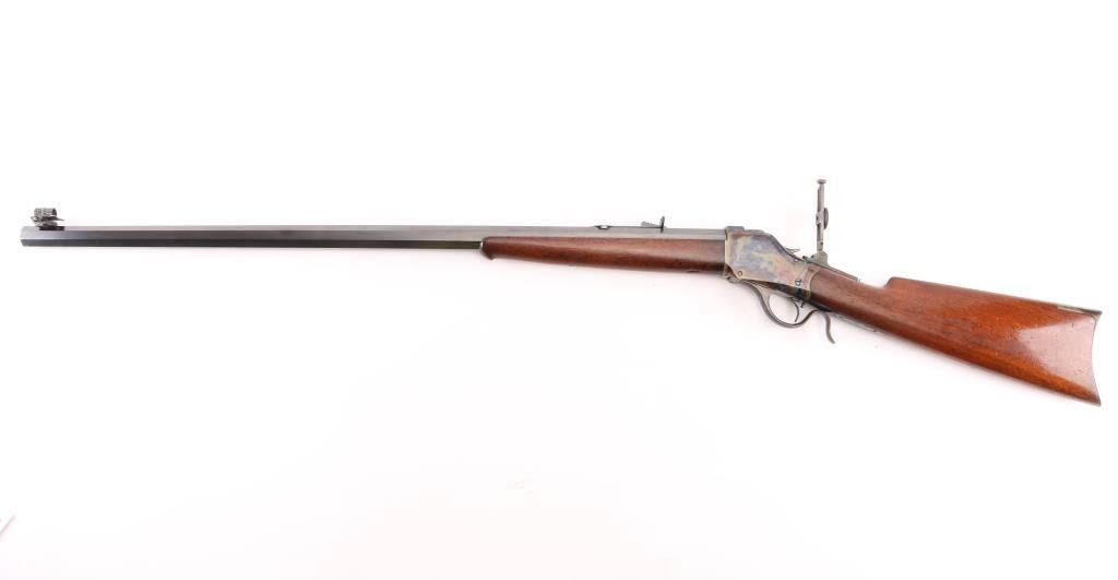 This Rifle has been professionally restored. Manufactured in 1885, (First year of manufacture) chambered in the rare 40-70 Sharps caliber and has a 30"octagon barrel. The top barrel flat ahead of the rear sight is marked "-MANUFACTURED BY THE--WINCHESTER REPEATING ARMS CO. NEW HAVEN, CONN. U.S.A.-" and "40-70 Sharps Str" at the breech. The serial number is marked on the lower tang with the patent date marking directly behind the trigger. Globe, post, adjustable front and adjustable buck horn rear sights. Adjustable Peep sight installed on the tang. Blue barrel with casehardened receiver, lever and buttplate, and mounted with a smooth walnut forearm and straight grip stock with Schnabel tip forearm with ebony forend insert and crescent buttplate. Bore is excellent/bright, the refinished blue, & case colors are excellent, and the refinished wood is near excellent with some very minor dings. Markings are crisp. Really a great looking rifle. NRA Condition-Excellent as Restored. Antique Firearm.