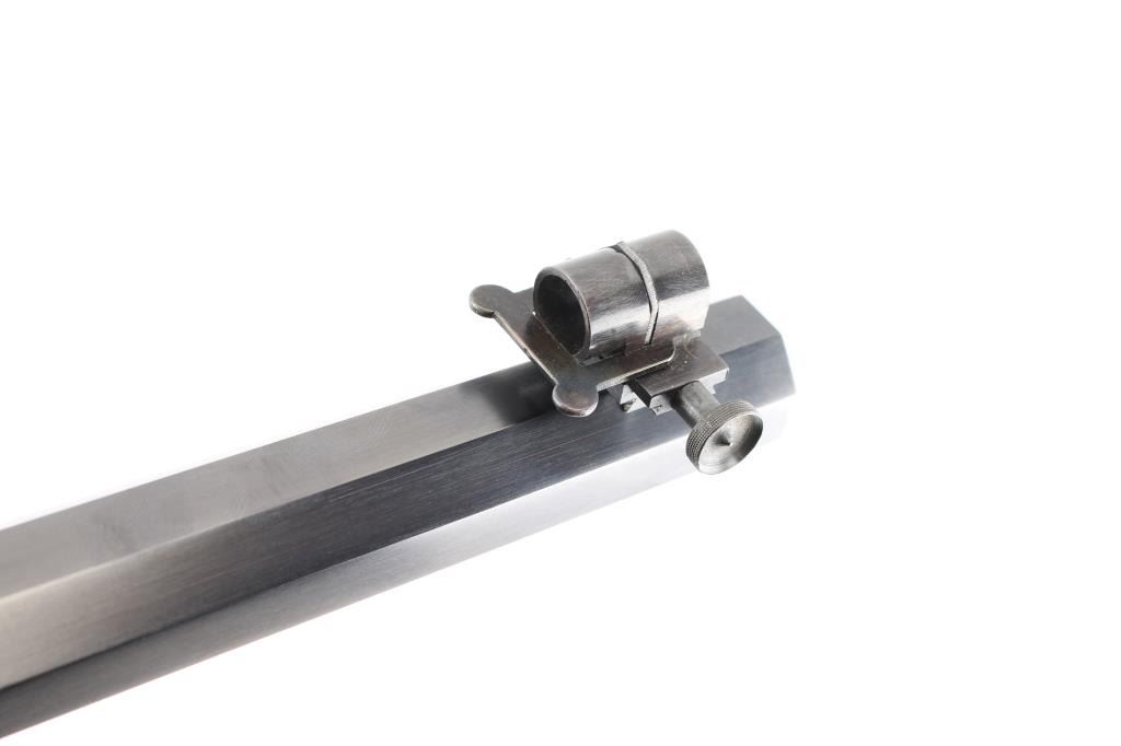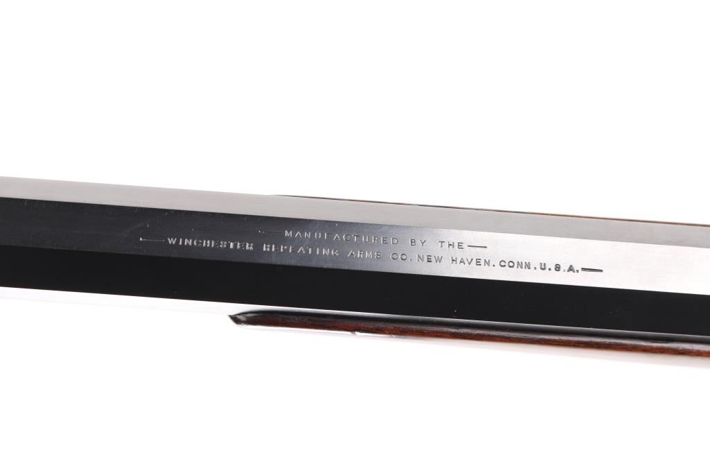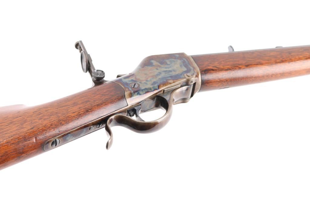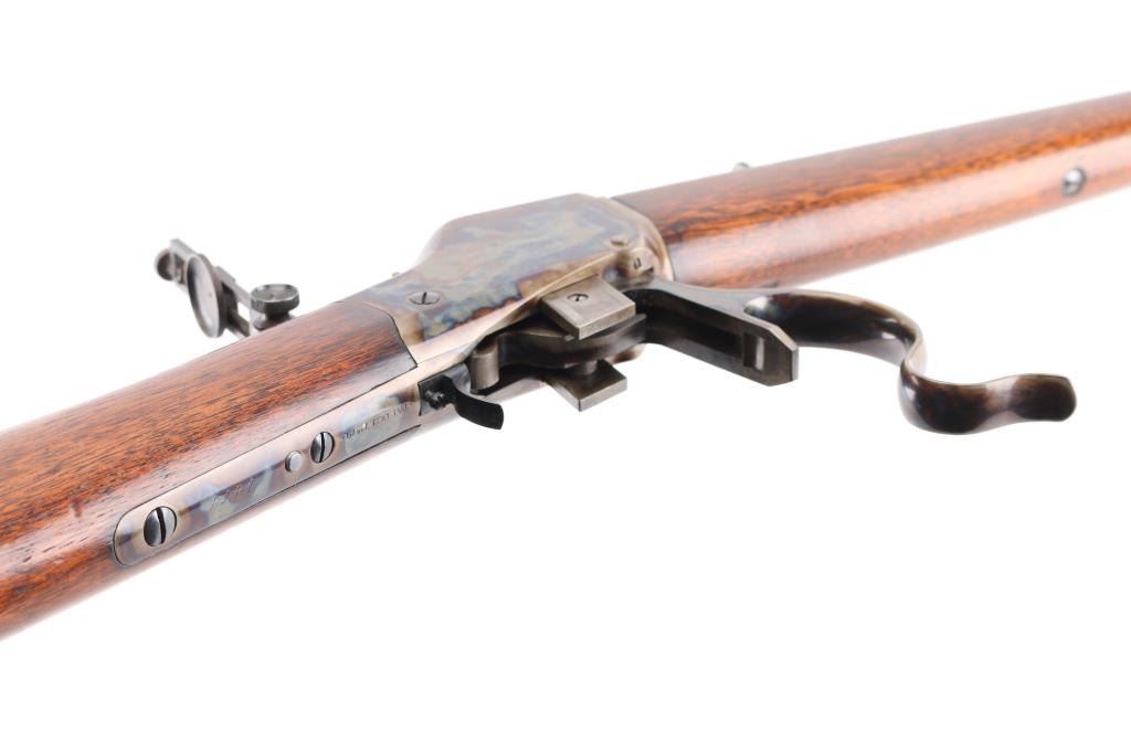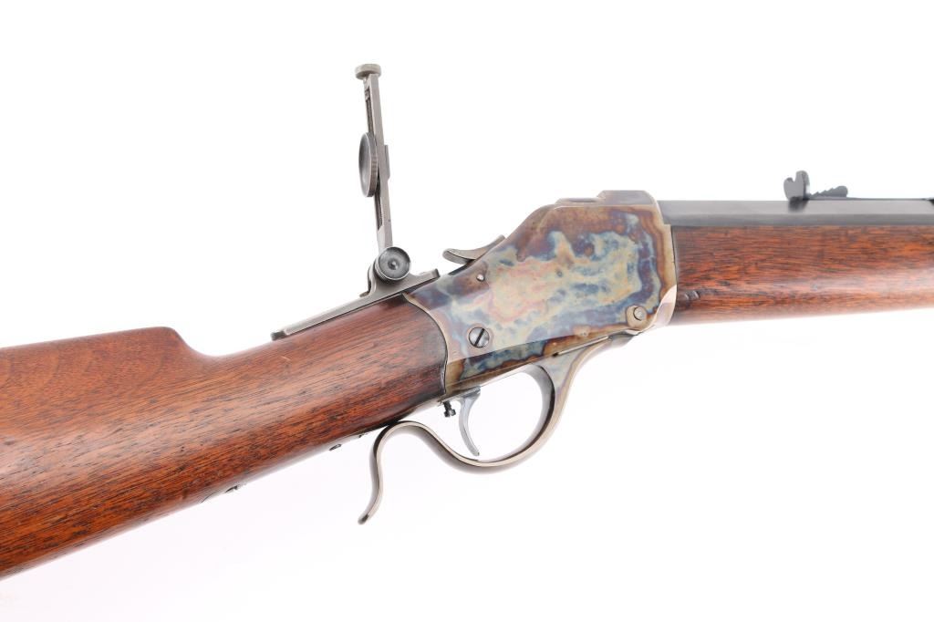 This Rifle has been professionally restored. Manufactured in 1885, (First year of manufacture) chambered in the rare 40-70 Sharps caliber and has a 30"octagon barrel. The top barrel flat ahead of the rear sight is marked "-MANUFACTURED BY THE--WINCHESTER REPEATING ARMS CO. NEW HAVEN, CONN. U.S.A.-" and "40-70 Sharps Str" at the breech. The serial number is marked on the lower tang with the patent date marking directly behind the trigger. Globe, post, adjustable front and adjustable buck horn rear sights. Adjustable Peep sight installed on the tang. Blue barrel with casehardened receiver, lever and buttplate, and mounted with a smooth walnut forearm and straight grip stock with Schnabel tip forearm with ebony forend insert and crescent buttplate. Bore is excellent/bright, the refinished blue, & case colors are excellent, and the refinished wood is near excellent with some very minor dings. Markings are crisp. Really a great looking rifle. NRA Condition-Excellent as Restored. Antique Firearm.