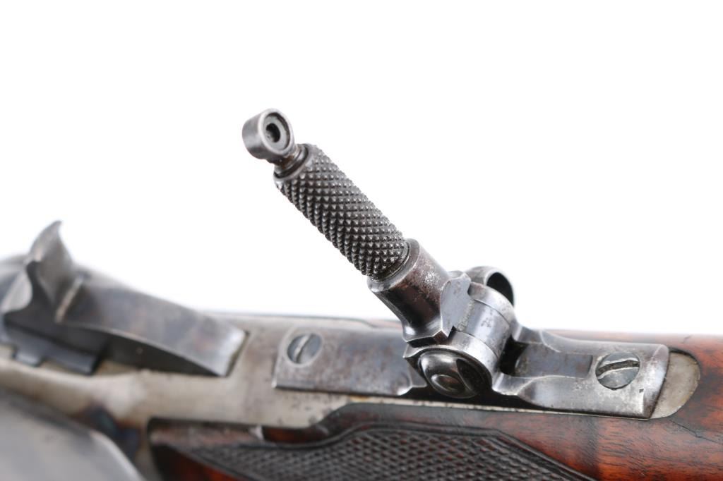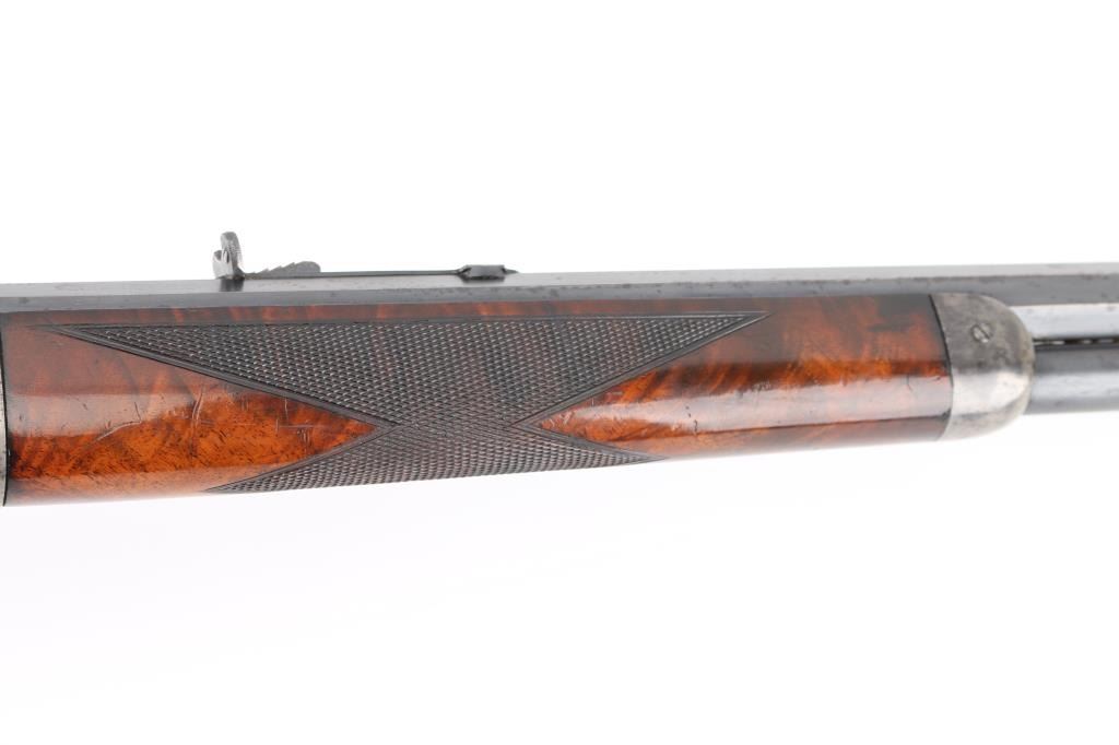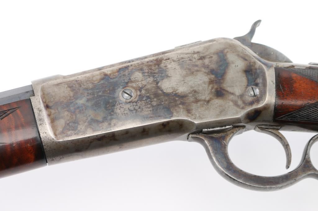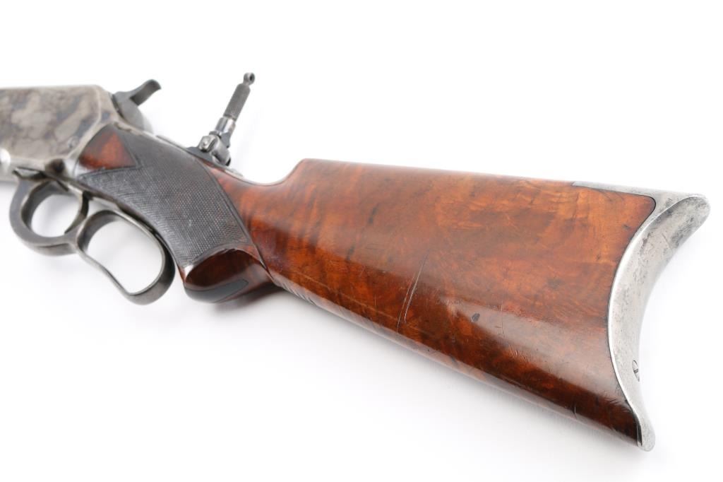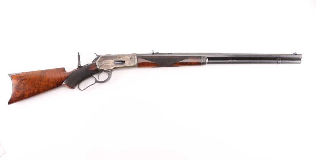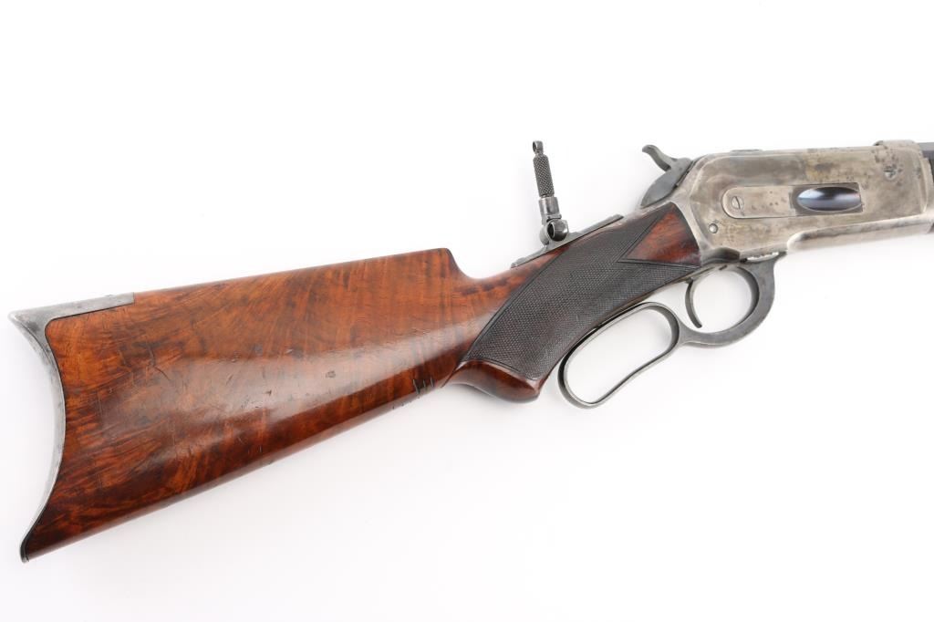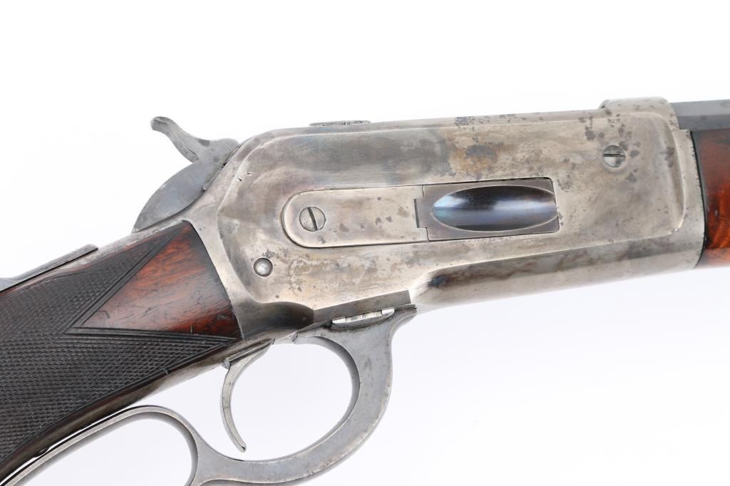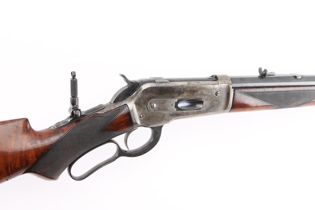 Winchester Model 1886 special order Deluxe Sporting Rifle manufactured in 1891. The rifle has a highly figured fancy grain walnut forearm and pistol grip stock with Winchester "Style H" checkering. The stock has a crescent steel buttplate and ebony inlay on the pistol grip. The rifle has a 26" barrel with full length magazine. The barrel, magazine, bolt and loading gate have a blue finish. The forearm cap, frame, hammer, loading lever and buttplate are color casehardened. The barrel has a special order Lyman "Hunting" front sight with ivory insert . A Lyman N0.1 peep sight is mounted on the upper tang. The top barrel flat is roll-stamped "-MANUFACTURED BY THE-/-WINCHESTER REPEATING ARMS CO. NEW HAVEN. CONN. U.S.A.-" in two lines ahead of the rear sight. The caliber designation, "40-82 W.C.F.", is stamped on the top barrel flat between the rear sight and the receiver. The lower tang has the 1884 and 1885 patent dates stamped in two lines behind the trigger and the serial number "20516" stamped in script numerals behind lower tang screw. The bore is excellent/bright, action is crisp/smooth, stocks are very good/sound with minor scratches/dings, there are nine small notches cut into the underside of the shoulder stock behind the grip. Original blue finish is about 75% with edge/muzzle wear, handling wear. The case colors are about 40%, mostly on the receiver, traces on the lever, fore cap, butt plate is the white. The barrel has scattered light pin-prick pitting with a couple of deeper patches towards the muzzle on the right flat. there is also a deep patch of pitting on the right side of the magazine. NRA Condition-Good. Antique Firearm.