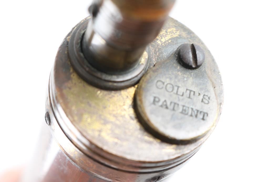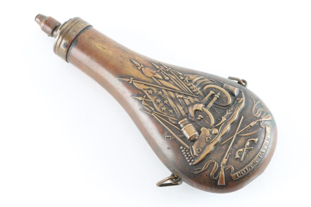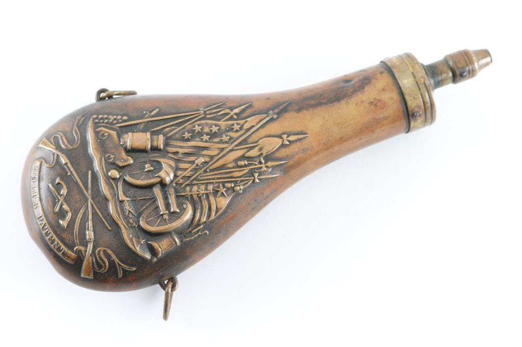 Colt powder flask for Patterson Carbine or Colt dragoon. Marked "Colt's Patent" on ball compartment cover and in ribbons. 30-50% original lacquered finish with good patina and completely uncleaned and untouched. Only minor dings and minimal aging. Excellent seams and screws. All original, far better than average. Good to very good condition.