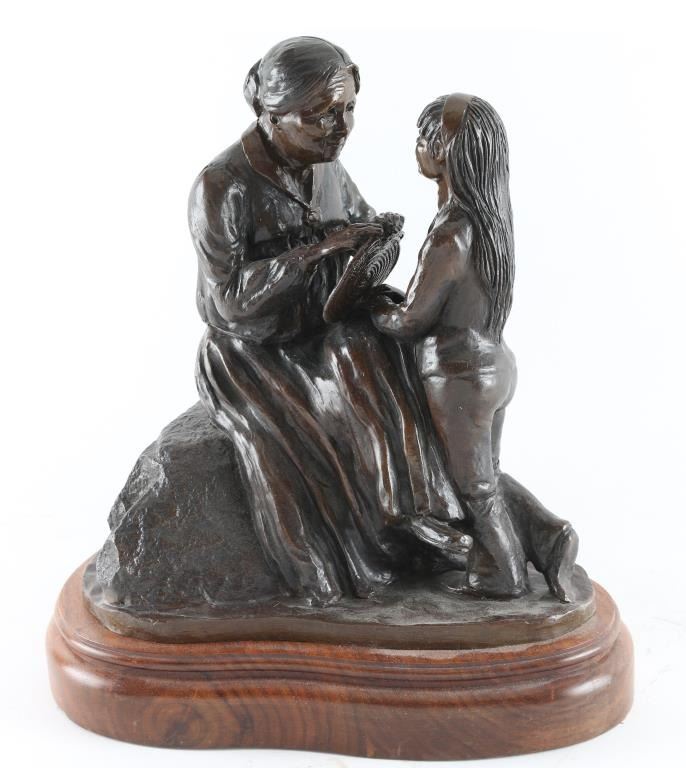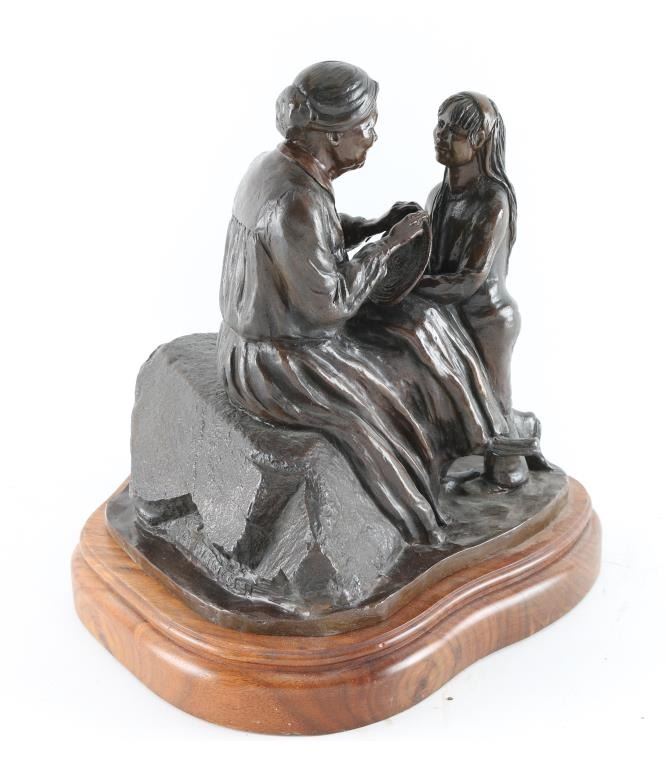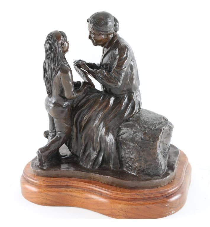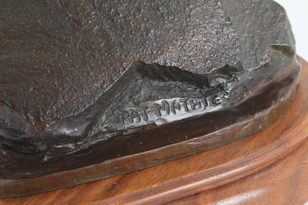 By well known Arizona artist "Pat Mathiesen" signed on base an numbered 1/50, with artist proof entitled "Viola". Used as the model to build same bronze seen at "Bucky's Casino" in Prescott Arizona. Beautifully done and mounted on wood base, measuring 10x9". Bio- Pat Mathiesen has exhibited at the Grand Central Galleries, New York City, Kennedy Galleries, New York City; Tucson Museum of Art, Arizona; Mountain Oyster Club, Tucson; Phoenix Art Museum, Arizona; National Cowboy Hall of Fame, Oklahoma City; George Phippen Memorial Art Show, Prescott, Arizona; Montana Historical Society, Helena; and the Western Heritage Art Classic, Billings, Montana.