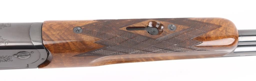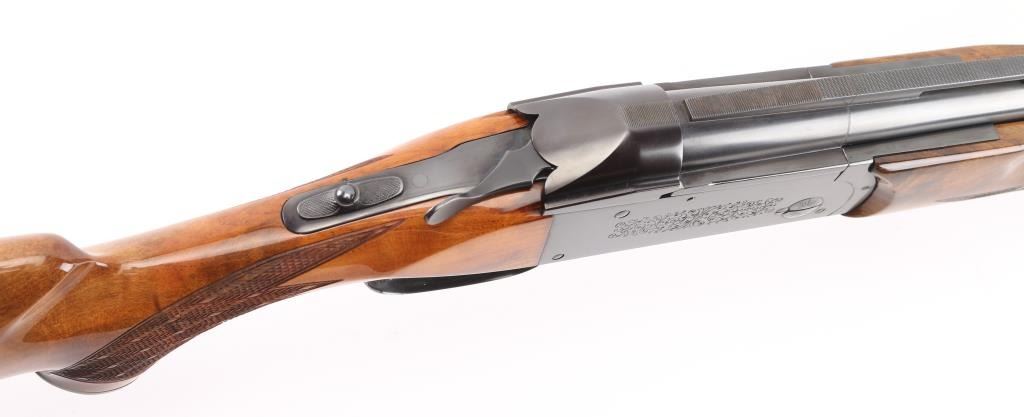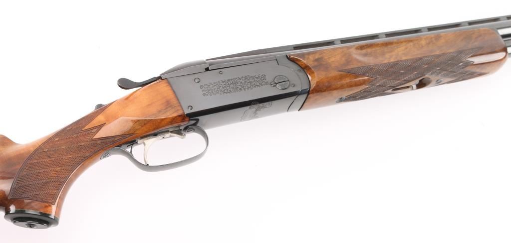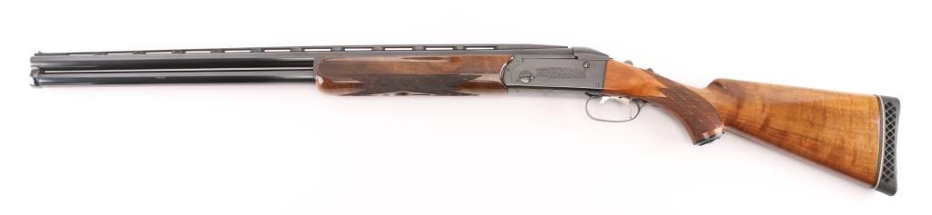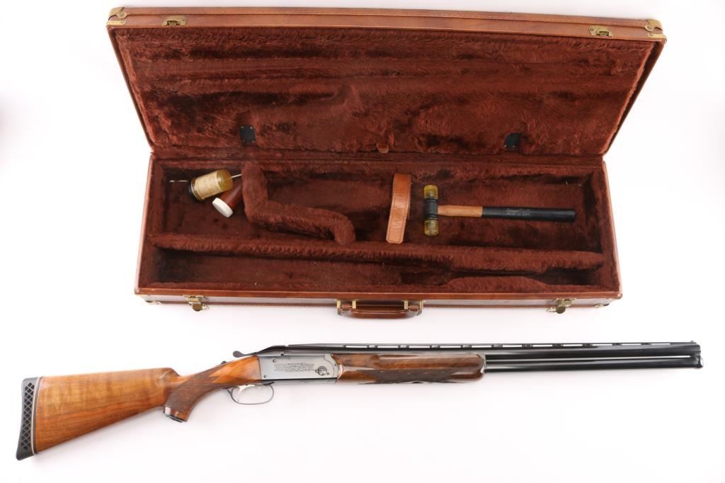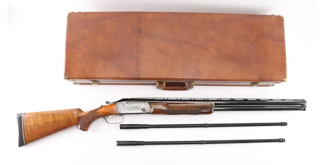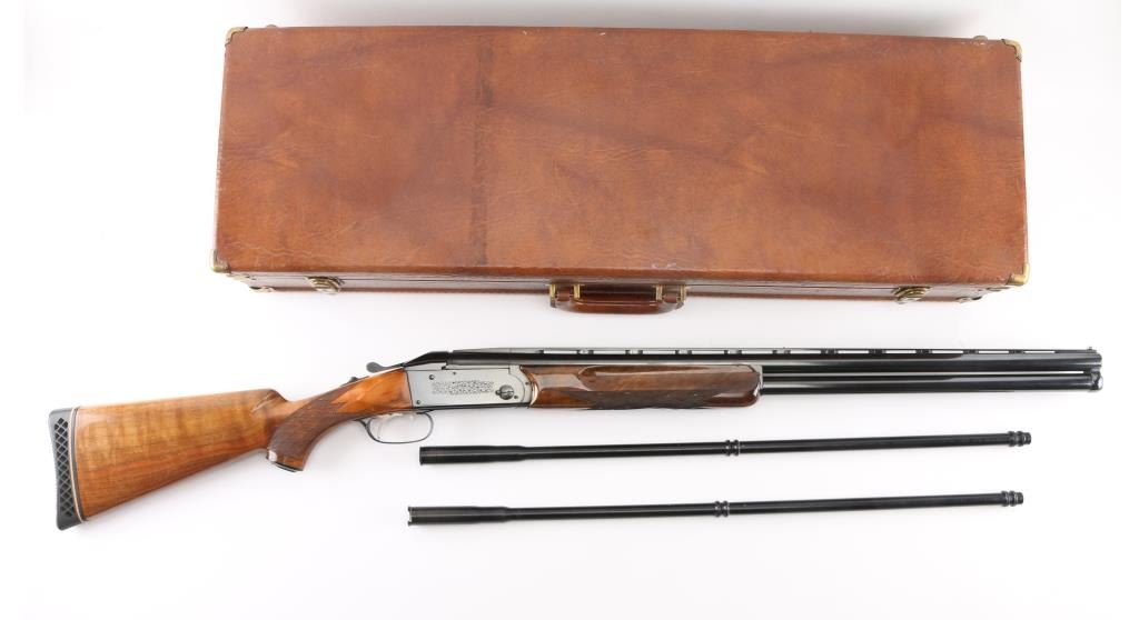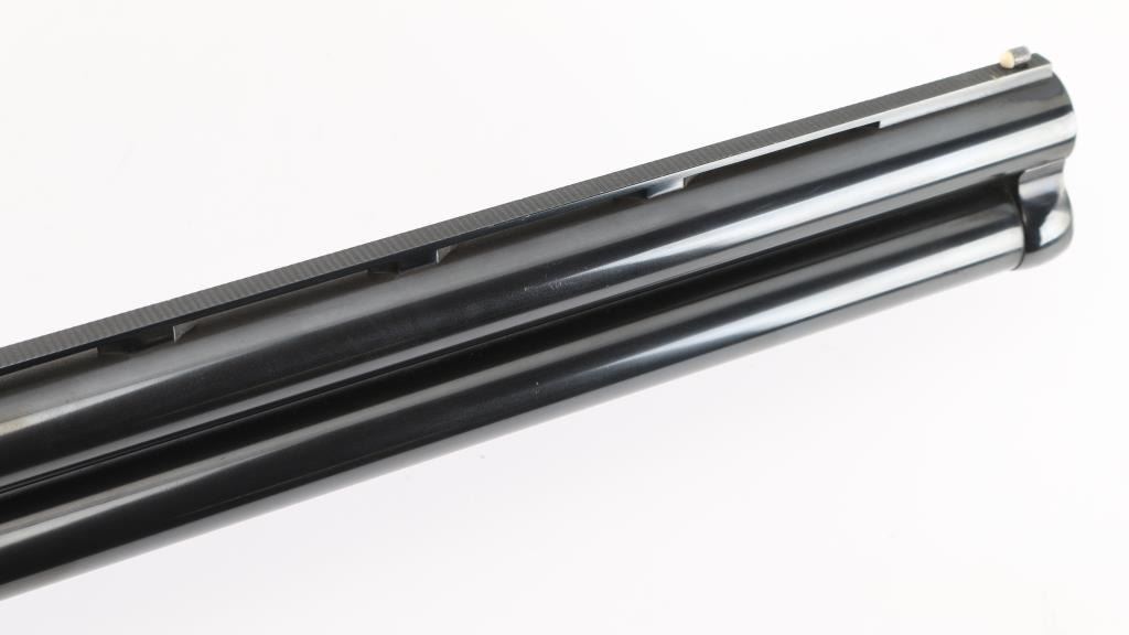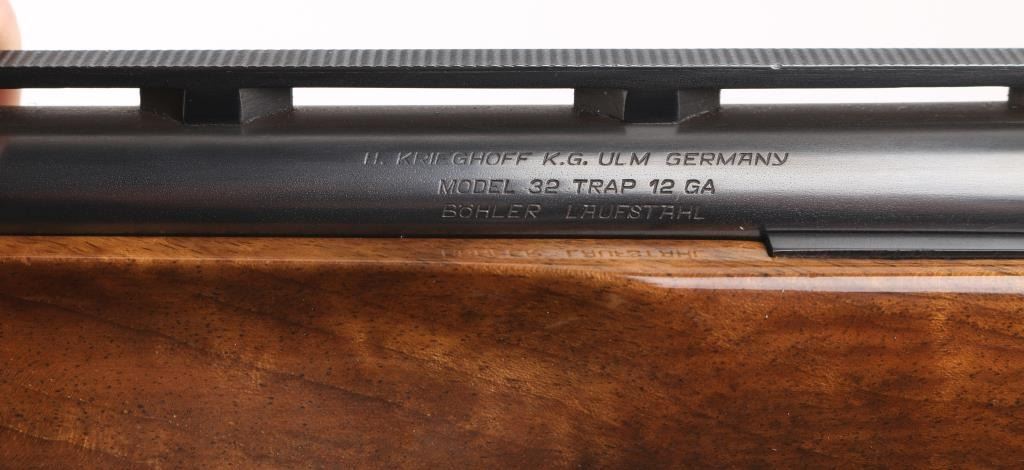 German made O/U trap shotgun, manufactured 1970,The barrels are marked "H. KRIEGHOFF OHG. ULM GERMANY MODEL 32 TRAP 12 GA. BOHLER-LAUFSTAHL". The frame is decorated with an un-bordered panel of deep relief floral scroll engraving on the right & left sides.28" vent rib barrels with white sighting bead, and small steel mid bead, single selective trigger, high polish blue finish, high gloss semi=beaver tail, checkered forearm, pistol grip butt stock with checkered panels on wrist, contrasting black grip cap, and vented black Pachmayr recoil pad. The sliding tang safety is frozen, we could not engage it. Bores appear excellent/bright, need cleaning, the wood is excellent with some very minor scratches, blue is about 98% with very minor scratches. Barrel chokes gauge Full & IC, LOP is 14 1/4". Comes with brown leather form fitted case containing mallet, two .410 ga, barrel inserts (Very good condition) and two .410 Ga, extractors. Case is in very good condition, Marked 'Multi-Gauge by Purbaugh & Sons". Modern Firearm NRA good