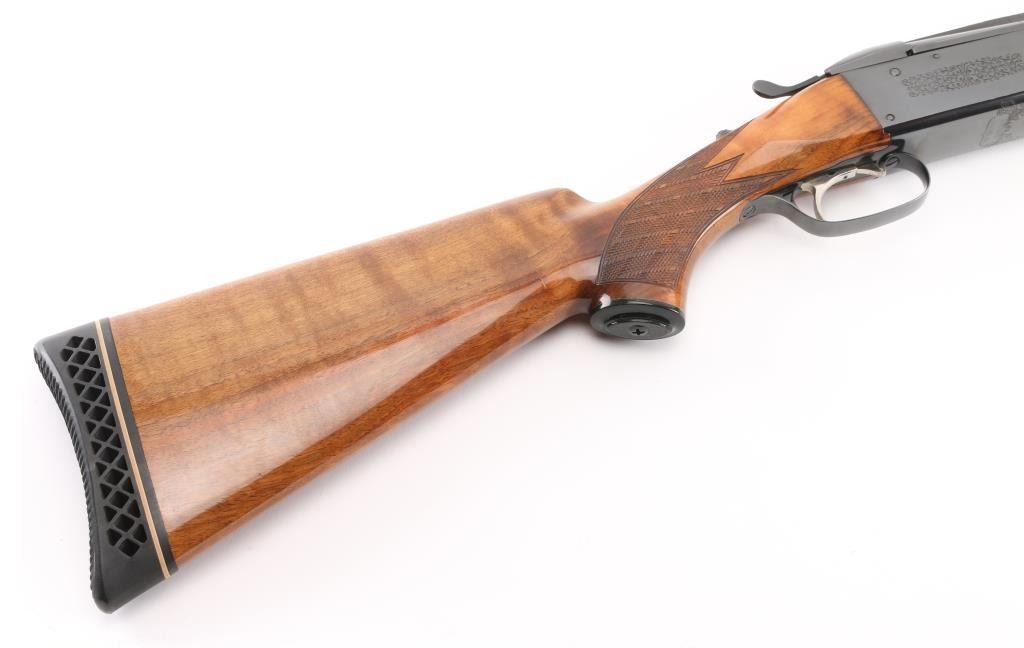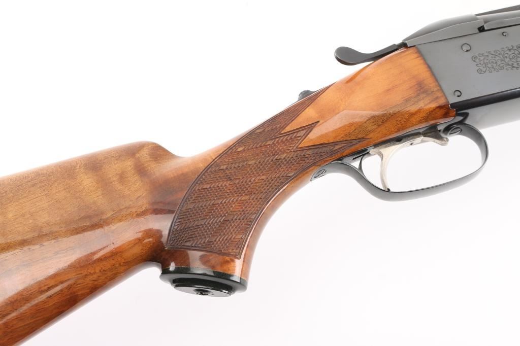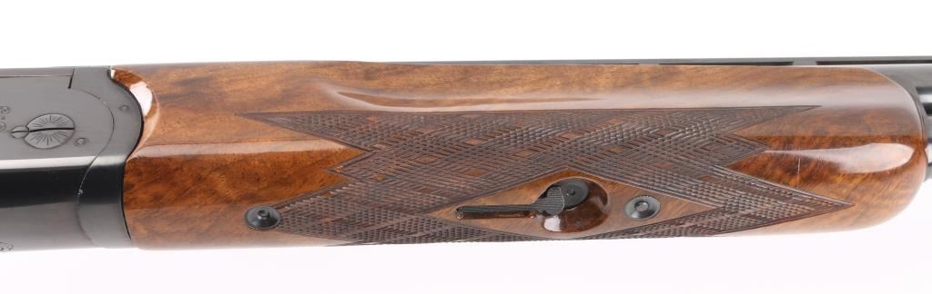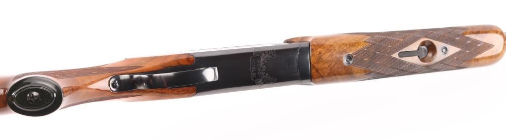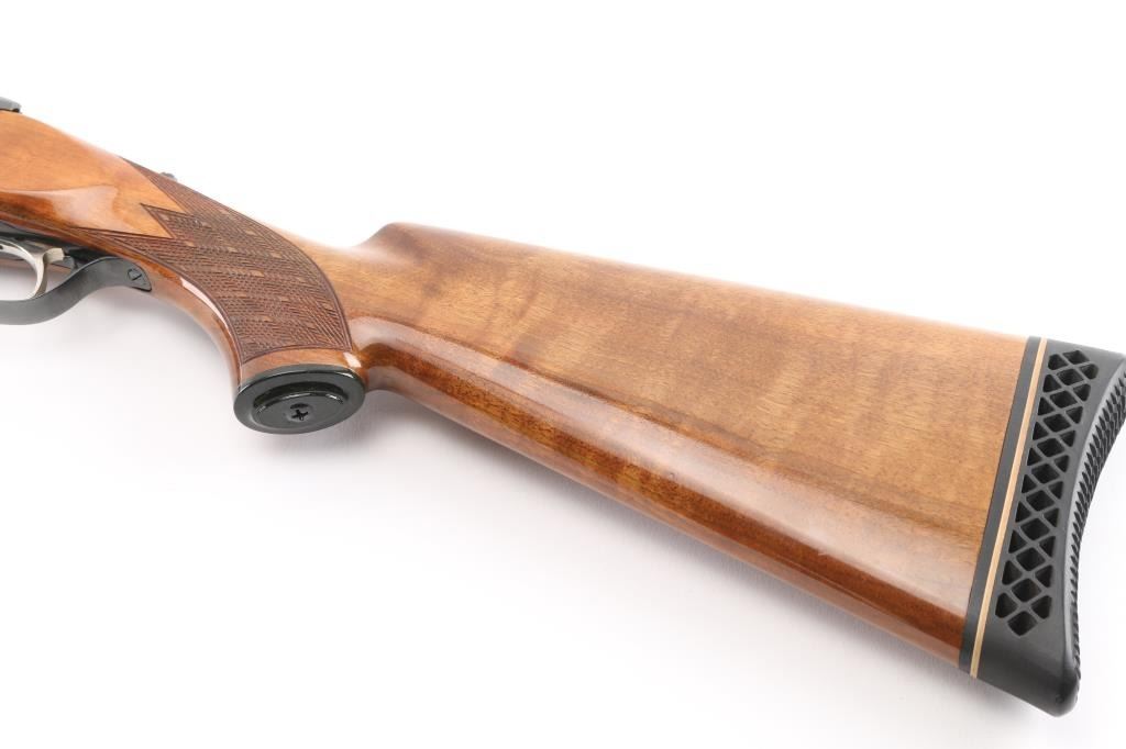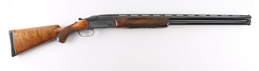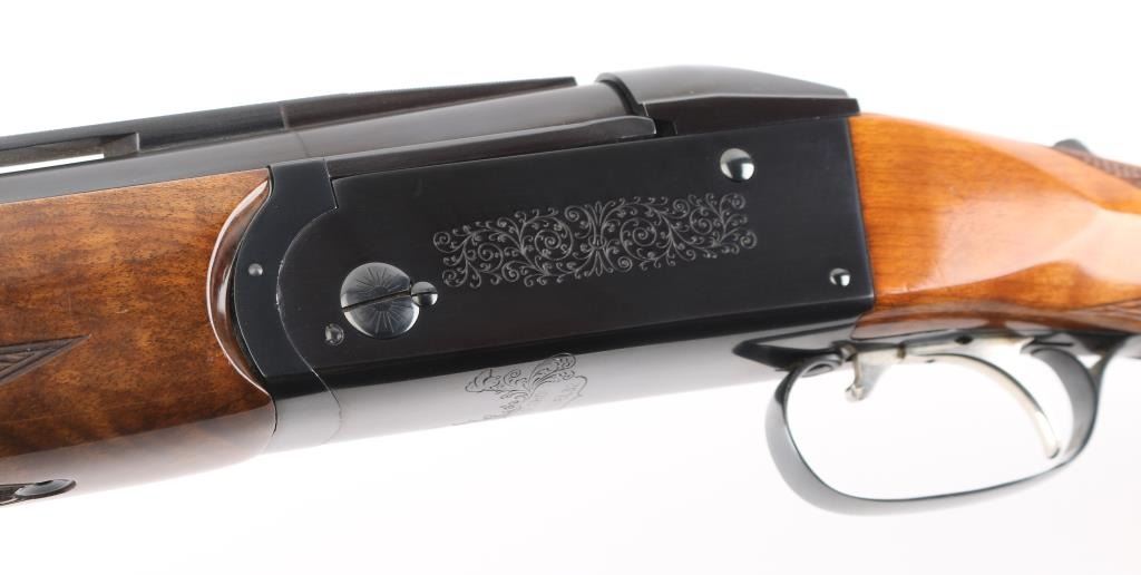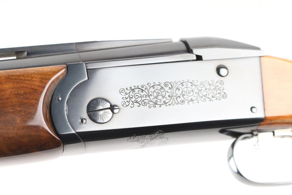 German made O/U trap shotgun, manufactured 1970,The barrels are marked "H. KRIEGHOFF OHG. ULM GERMANY MODEL 32 TRAP 12 GA. BOHLER-LAUFSTAHL". The frame is decorated with an un-bordered panel of deep relief floral scroll engraving on the right & left sides.28" vent rib barrels with white sighting bead, and small steel mid bead, single selective trigger, high polish blue finish, high gloss semi=beaver tail, checkered forearm, pistol grip butt stock with checkered panels on wrist, contrasting black grip cap, and vented black Pachmayr recoil pad. The sliding tang safety is frozen, we could not engage it. Bores appear excellent/bright, need cleaning, the wood is excellent with some very minor scratches, blue is about 98% with very minor scratches. Barrel chokes gauge Full & IC, LOP is 14 1/4". Comes with brown leather form fitted case containing mallet, two .410 ga, barrel inserts (Very good condition) and two .410 Ga, extractors. Case is in very good condition, Marked 'Multi-Gauge by Purbaugh & Sons". Modern Firearm NRA good